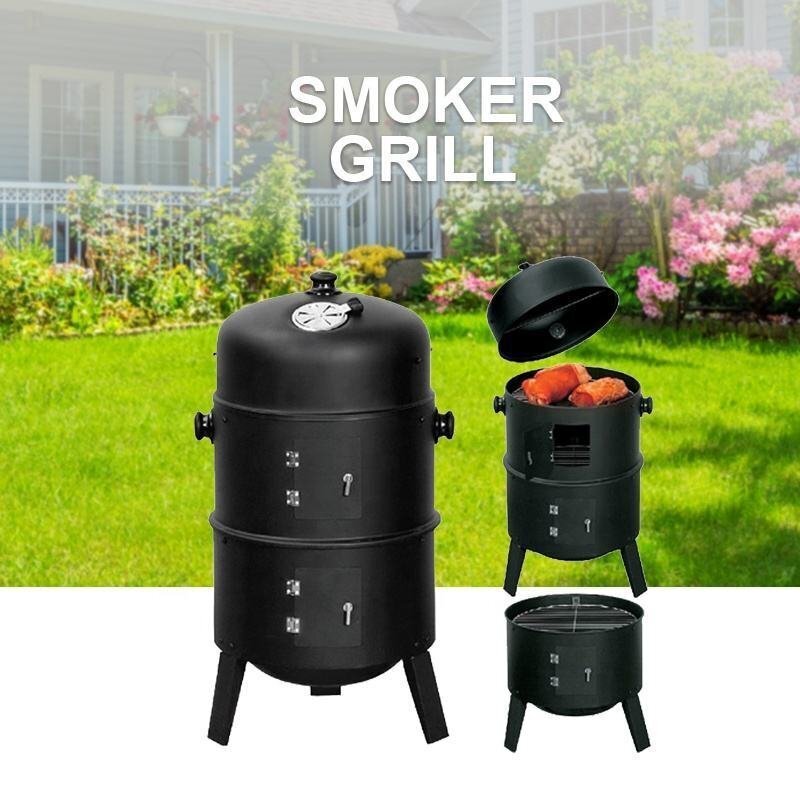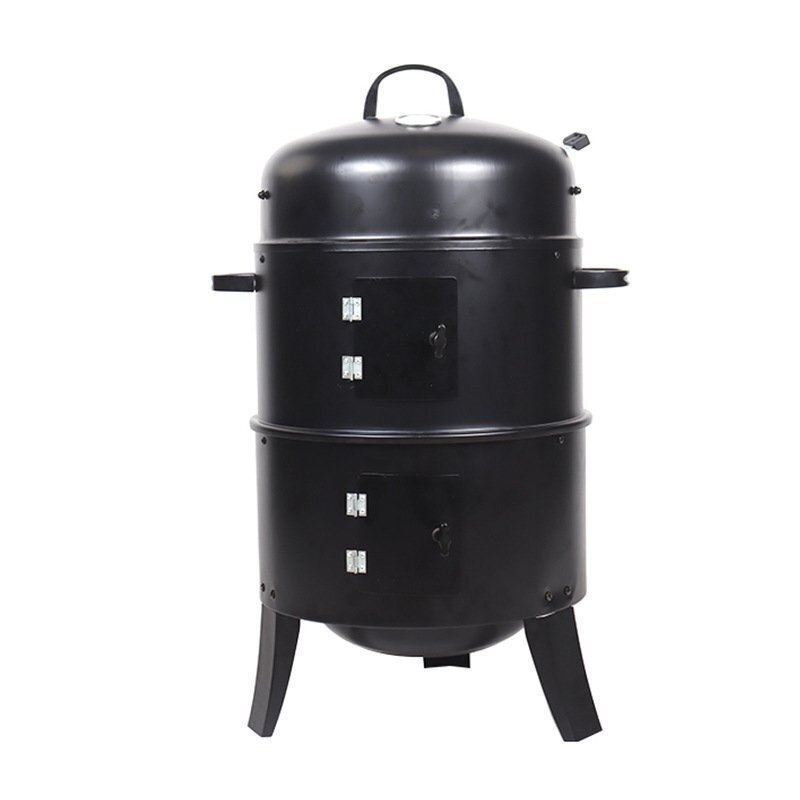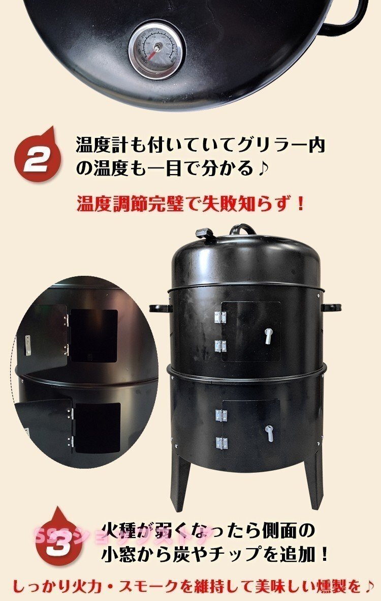■屋外でのバーベキュー、燻製、炭焼き、ピザ焼きなどに最適な三層炭燻製グリル。