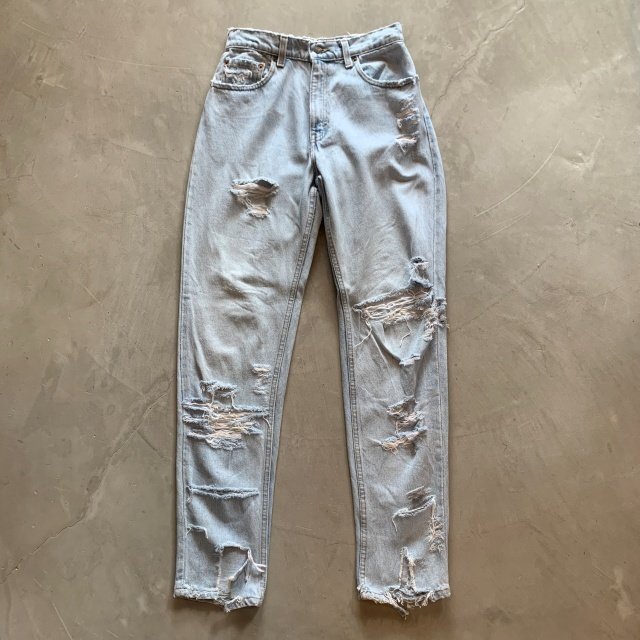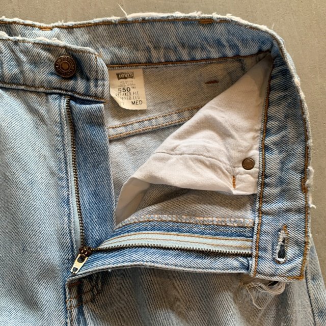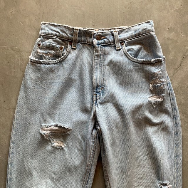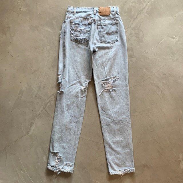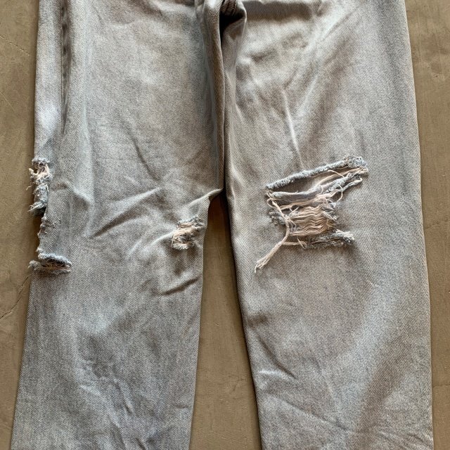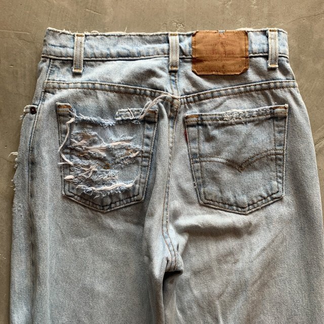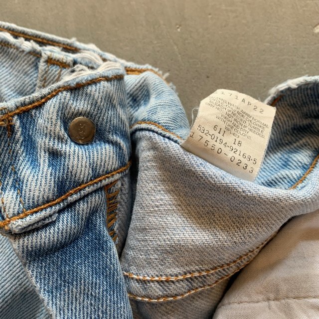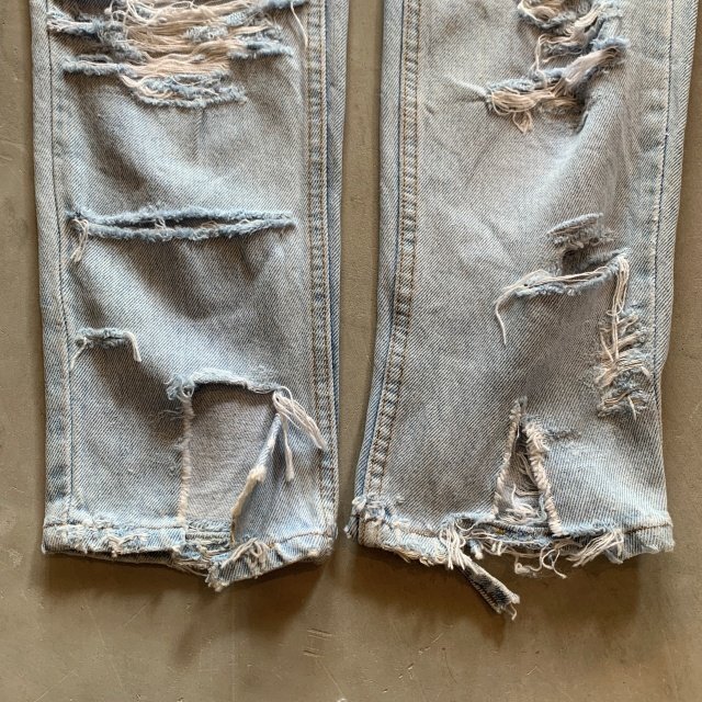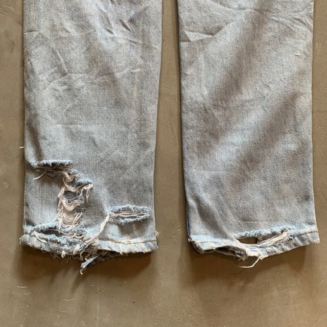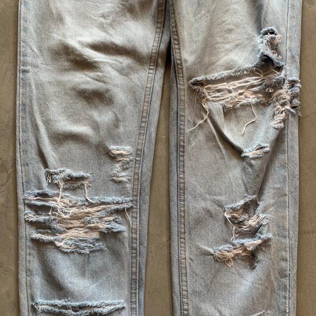 ★商品状態★ ・着用感があり、全体的な色落ちとかなりのダメージが見られます。 ・古着慣れされている方でしたら問題なく着用していただける程度かと思います。 ・MADE IN USA ★素材★ COTTON 100% デニム ★配色★ 薄い青系 ★サイズ表記★ レディース7 W28インチ相当 ・実寸を参考にして下さい。 ★実寸サイズ★ ウエスト 36㎝ 股下 80㎝ 股上 30㎝ 腿幅 29㎝ 裾幅 17㎝ ・平置きにての採寸となります。 ・若干の誤差はご了承ください。 |