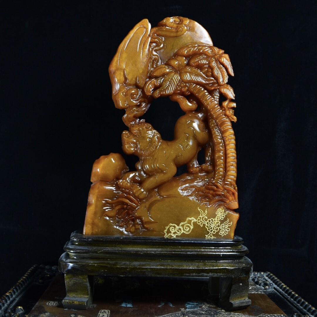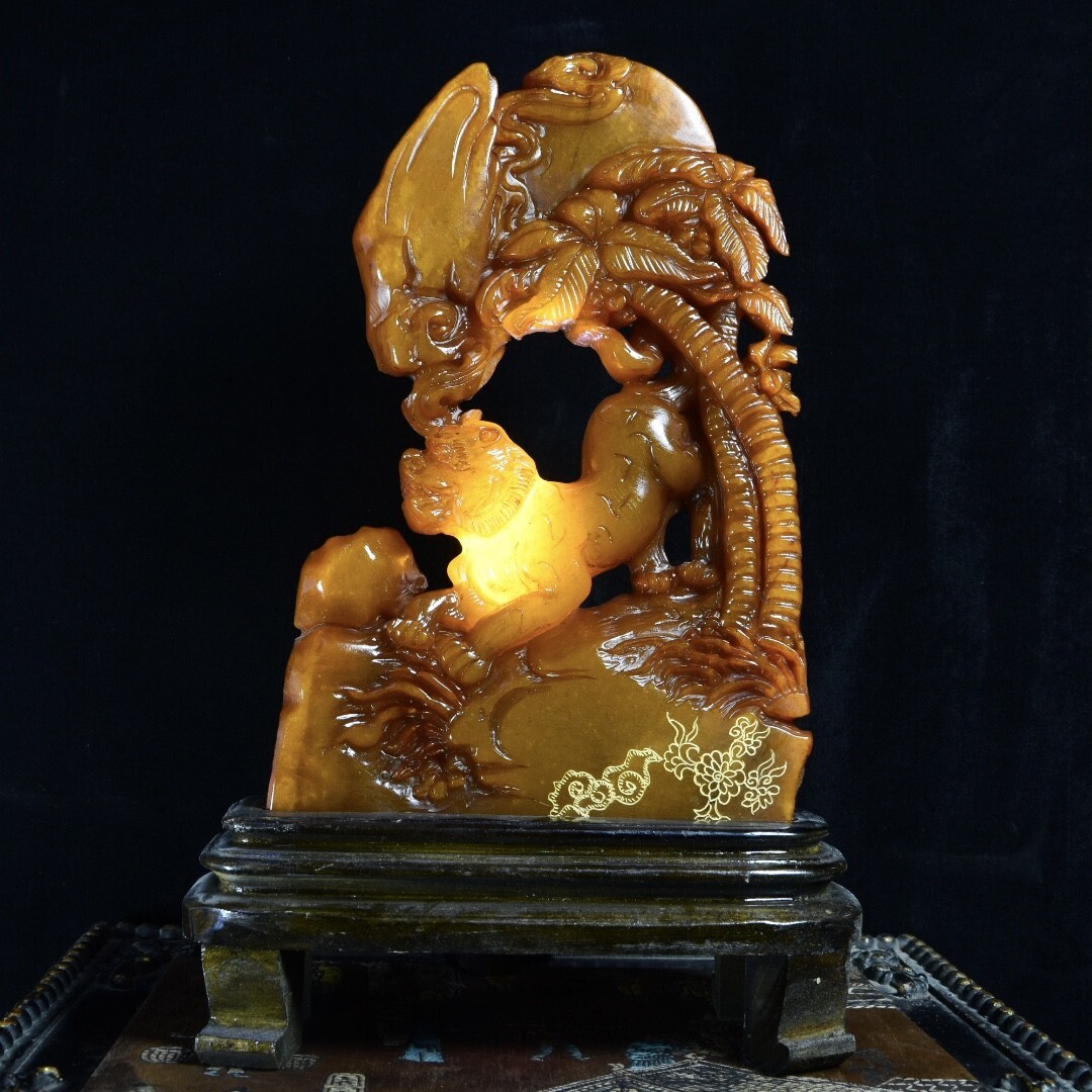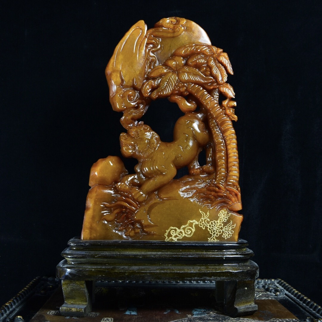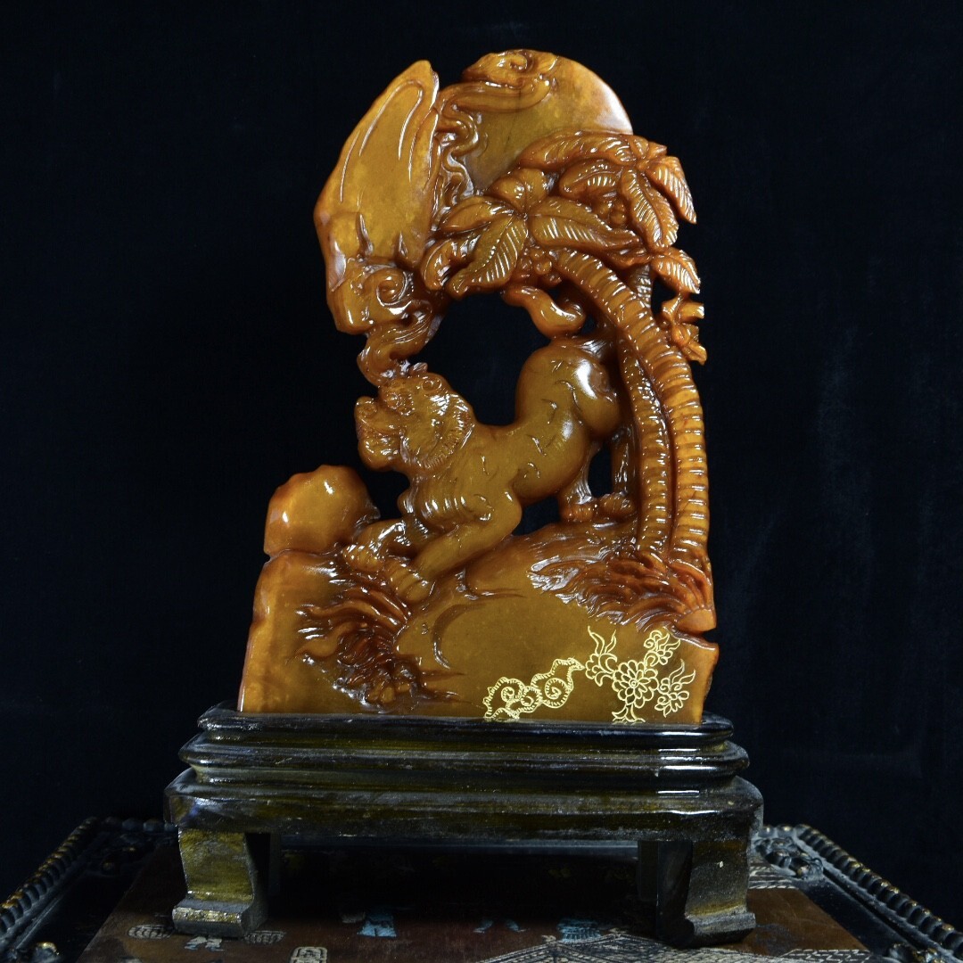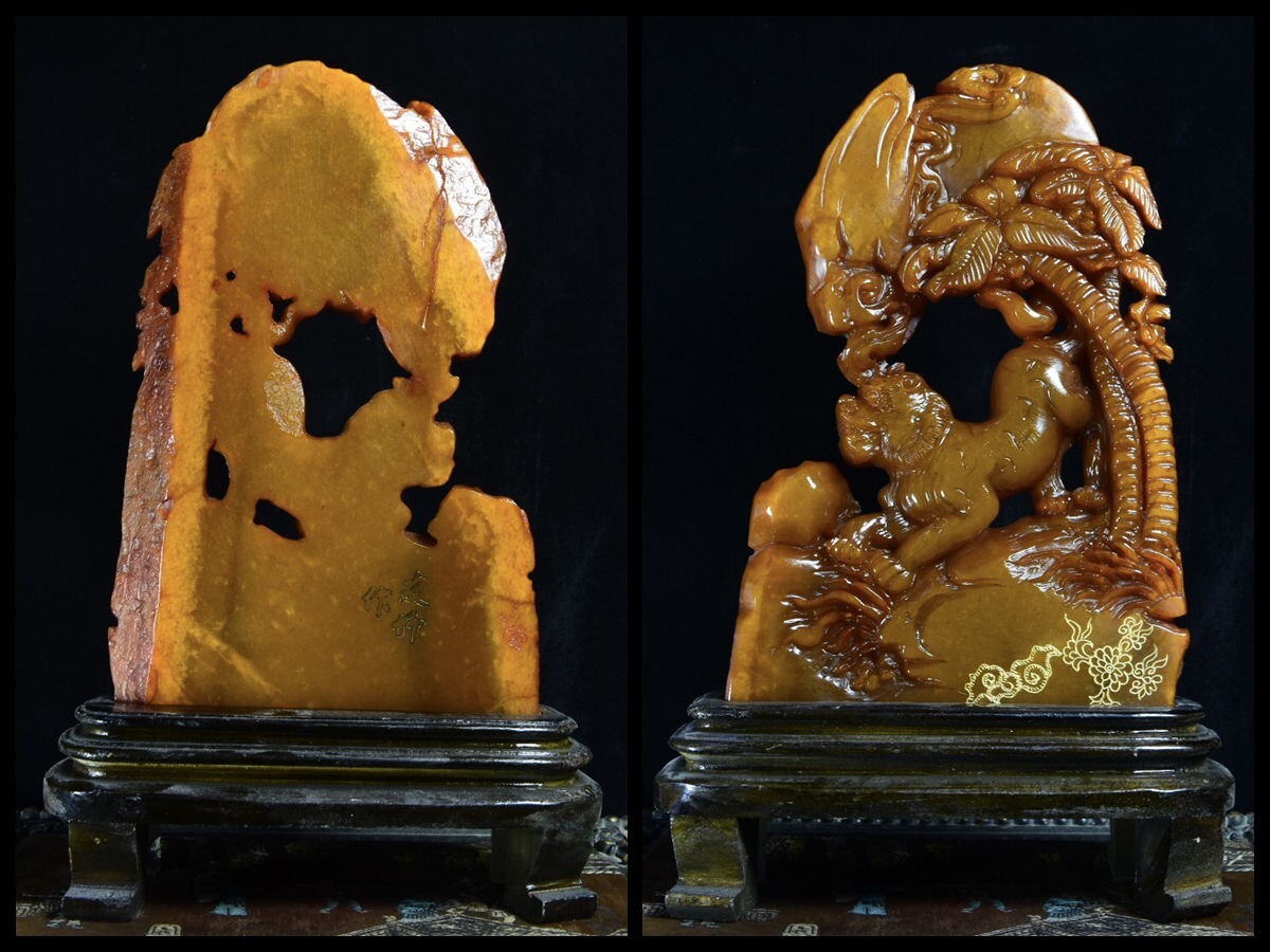 「清 友竹作 老寿山石 田黄石彫り 瑞獣呈祥 山子擺件」極細工 擺件 古賞物 中国古美術 旧蔵出