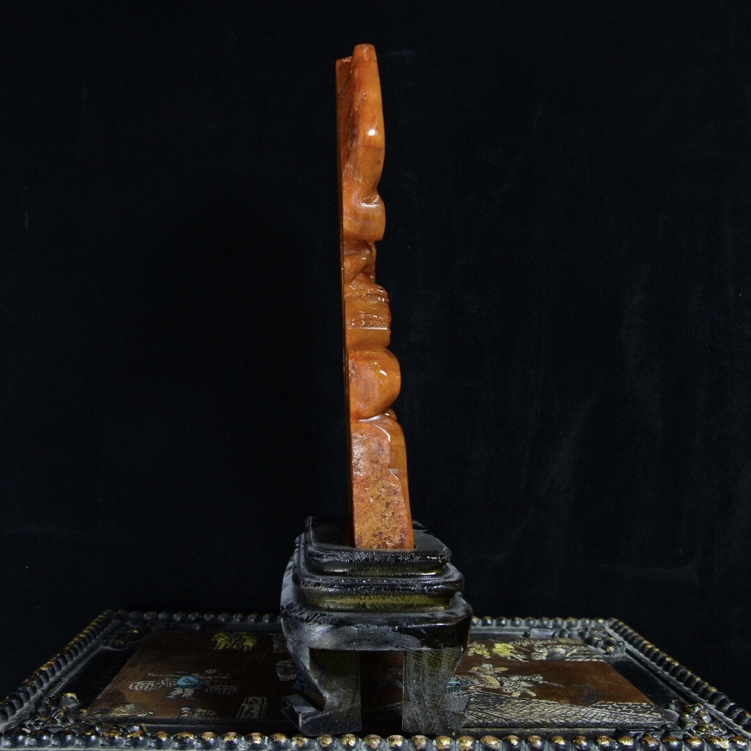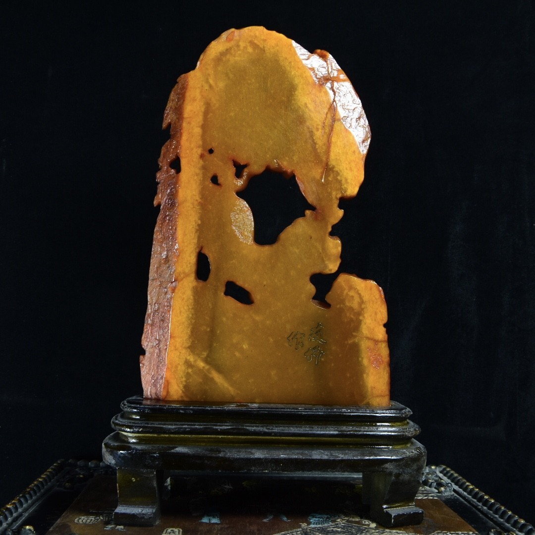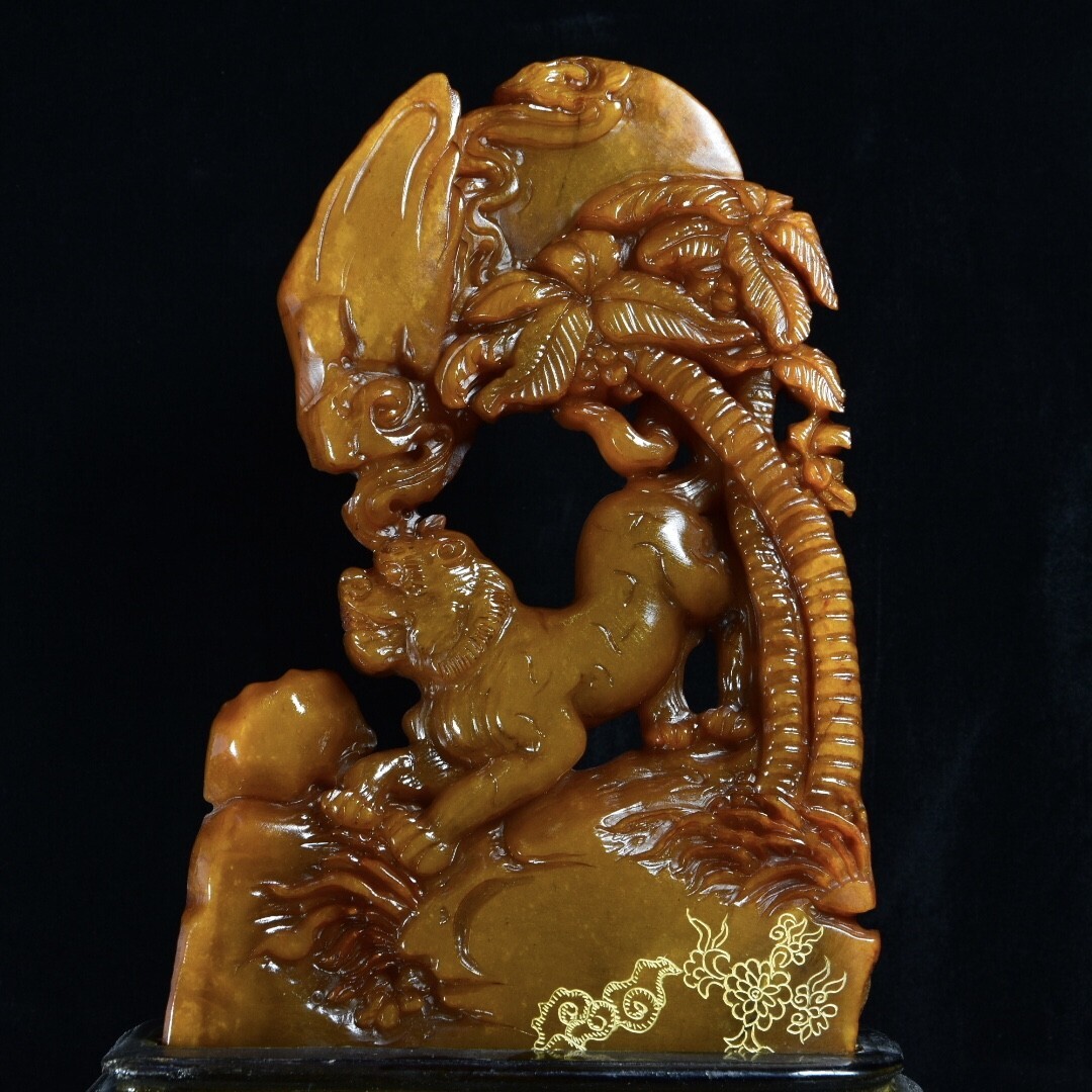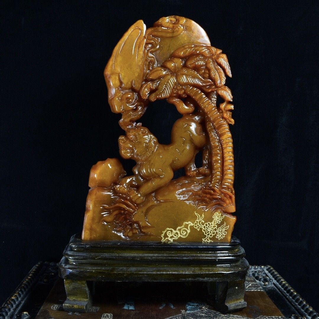 「清 友竹作 老寿山石 田黄石彫り 瑞獣呈祥 山子擺件」極細工 擺件 古賞物 中国古美術 旧蔵出