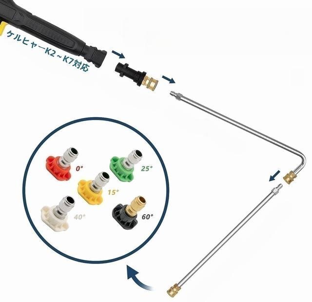 【商品内容】高圧洗浄の曲線延長ロッド×1本、高圧洗浄の直線延長ロッド×1本、ケルヒャーアダプタ×1個、高圧洗浄ノズルチップ×5個
