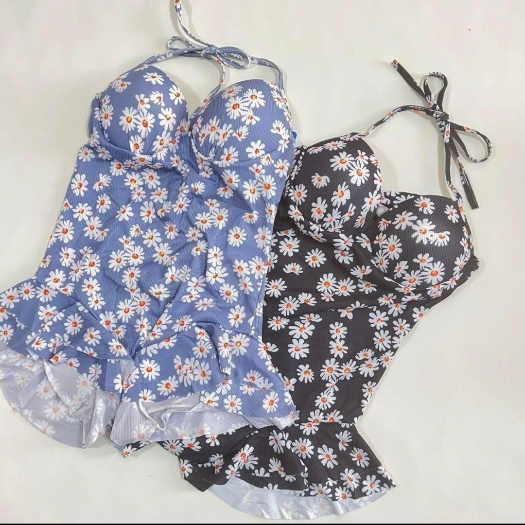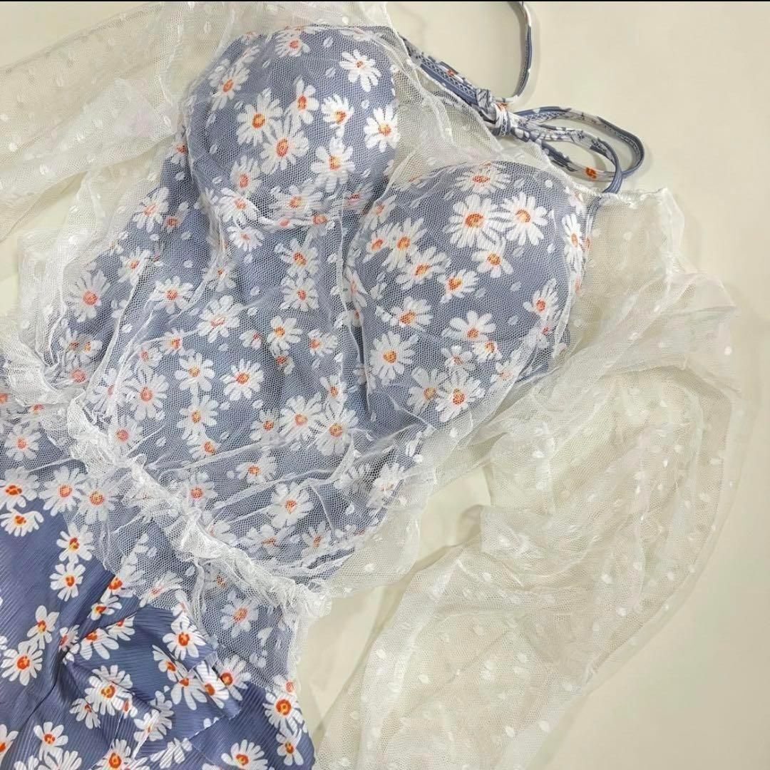 レディース フラワー ワンピース水着 2点セット 小花柄 ブルー s 中高生 小さいサイズ フラワープリント