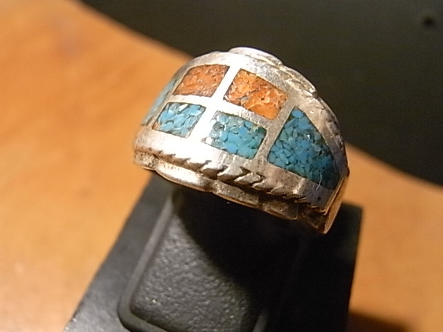こちらは、1970~80年代のスターリングシルバー製のキャストリングで、ターコイズ&コーラルのチップインレイが施されています。
