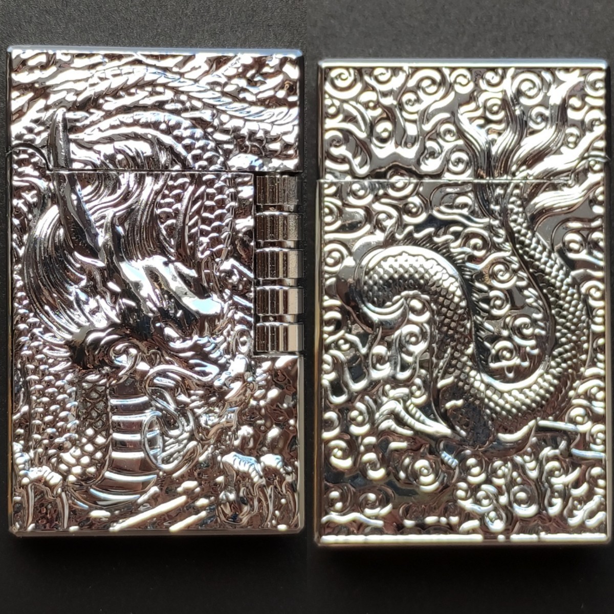 両面に豪快に彫刻された天に昇る 龍 竜 ドラゴン が迫力満点なデザインのフリントサイドローラー式ガスライターです。