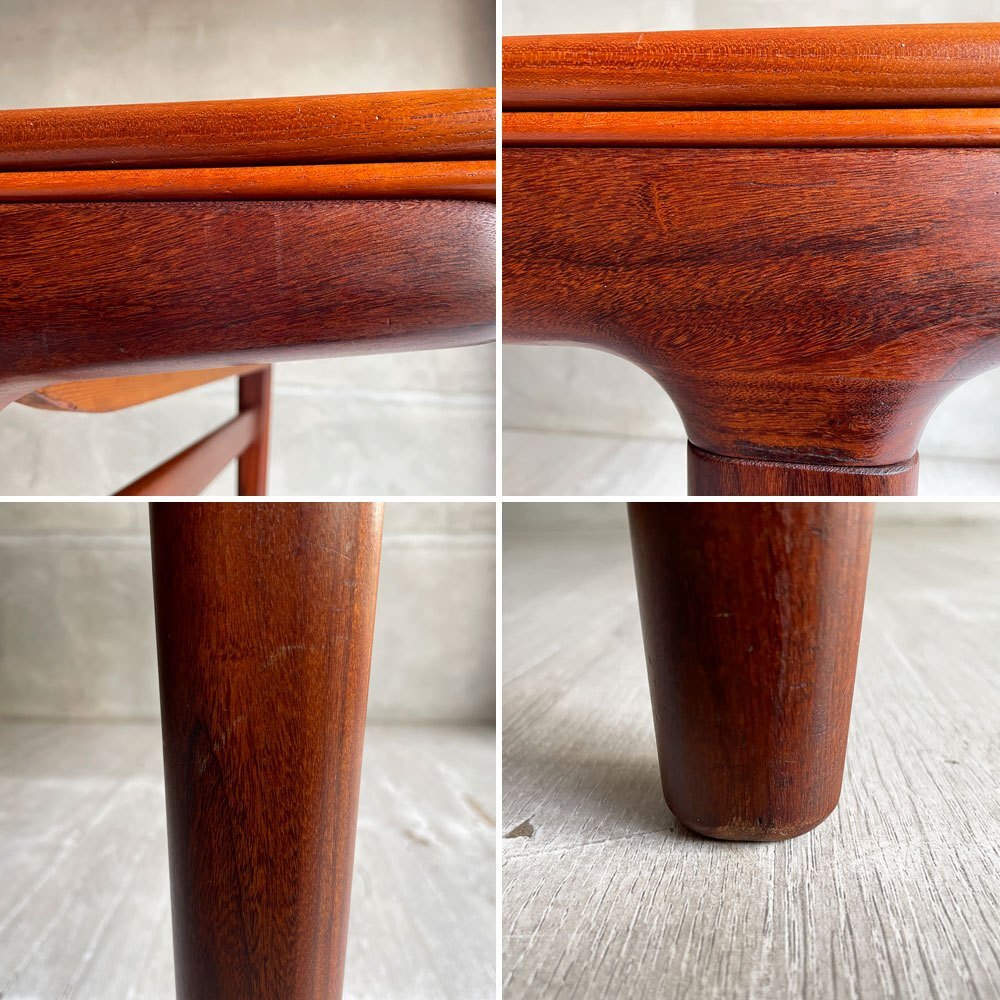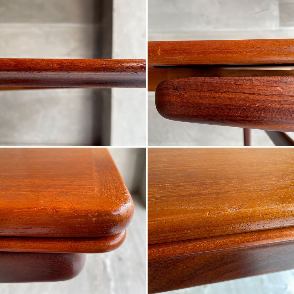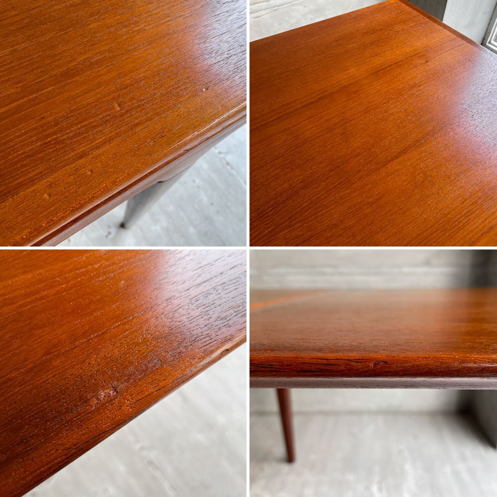 | コメント | デンマークを代表する名工房"ウルドゥムモーベルファブリック Uldum Mobelfabrik"から、1950~60年代前後以降に製造されたビンテージエクステンションダイニングテーブルが入荷致しました。 ハンス・J・ウェグナーやカイ・クリスチャンセンと並ぶ、北欧デンマークを代表する巨匠デザイナー"ヨハネス・アンダーセン Johannes Andersen"によって生み出されたエクステンションダイニングテーブルです。 美しい杢目・先端が絞られたテーパードレッグが美しく、デンマークデザインにおいて黄金期と呼ばれる時代の、クオリティの高さを垣間見る事の出来るテーブルとなっております。 天板,追加天板はチーク無垢材、脚部はアフロモシア材で出来ており、色味はどちらも赤みを帯びていて似ていますが、僅かな色の違いや杢目など2つの素材の良さを楽しめるデザインとなっております。 違う木材を使用することで上品さも演出されます。 天板下に、左右分かれてエクステンション天板が収納されており、左右それぞれで拡張することが出来ます。 上の天板を軽く持ち上げて下の板をスライドさせながら引き出すと段差なくフラットになる仕組みです。 正面から見ると追加天板が収納されているという感覚は無く、意匠と構造をとても一体的に感じます。 ご使用人数や使用用途に合わせて片側のみを広げてのご使用も出来る為、様々なシーンで活躍頂けます。最大にすると8~10人程度で使用できます。 チーク無垢材の杢目の表情、色合いも美しく、ダイニングで料理の表情をぐっと引き立ててくれるような印象です。天板エッジからレッグまでテーパーがかかったフォルムも美しく、意匠・機能・構造すべての面でハイレベルな一台となっております。 ※当ショップは、主にリサイクル品を取り扱っております。基本的にUSED品である事をご理解頂き、ご入札をご検討下さいませ。 |