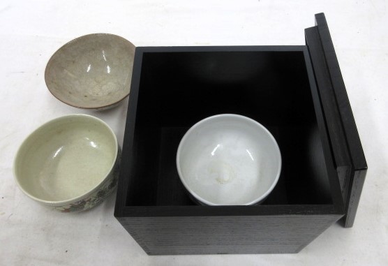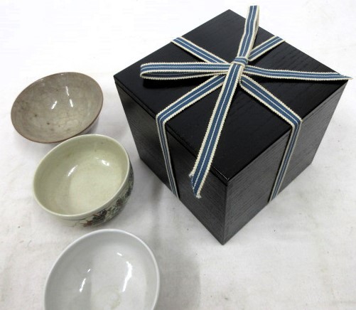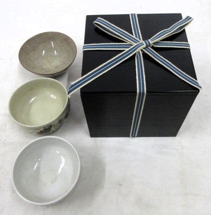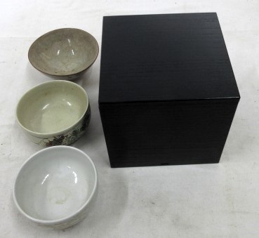 注意:写真に黒塗二重箱のそばで抹茶椀3個が写っていますが、