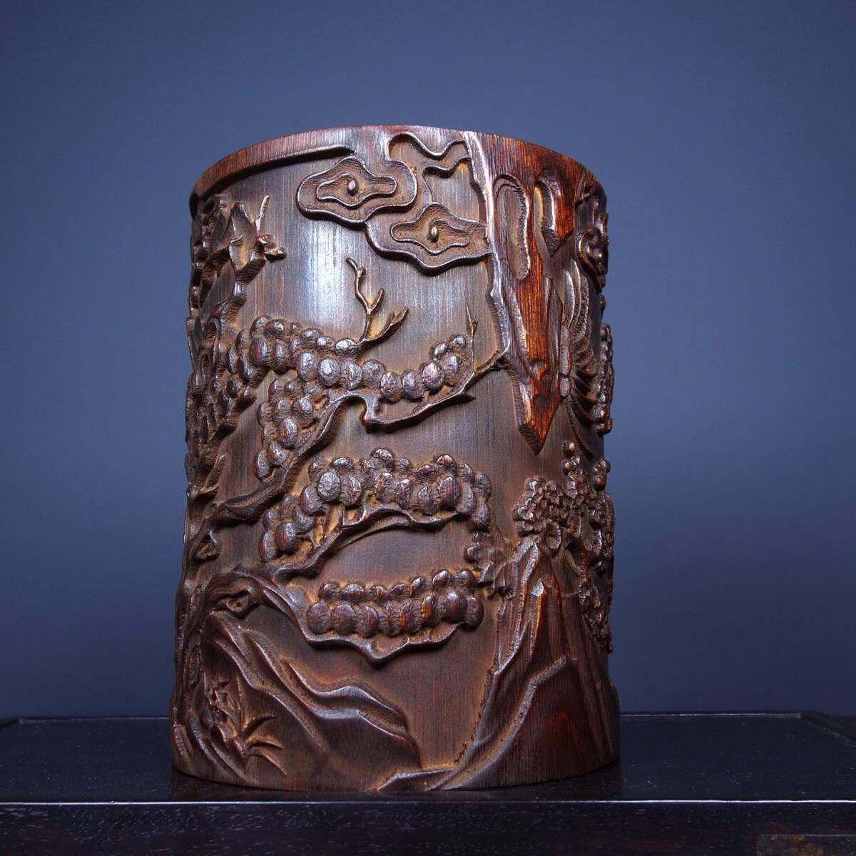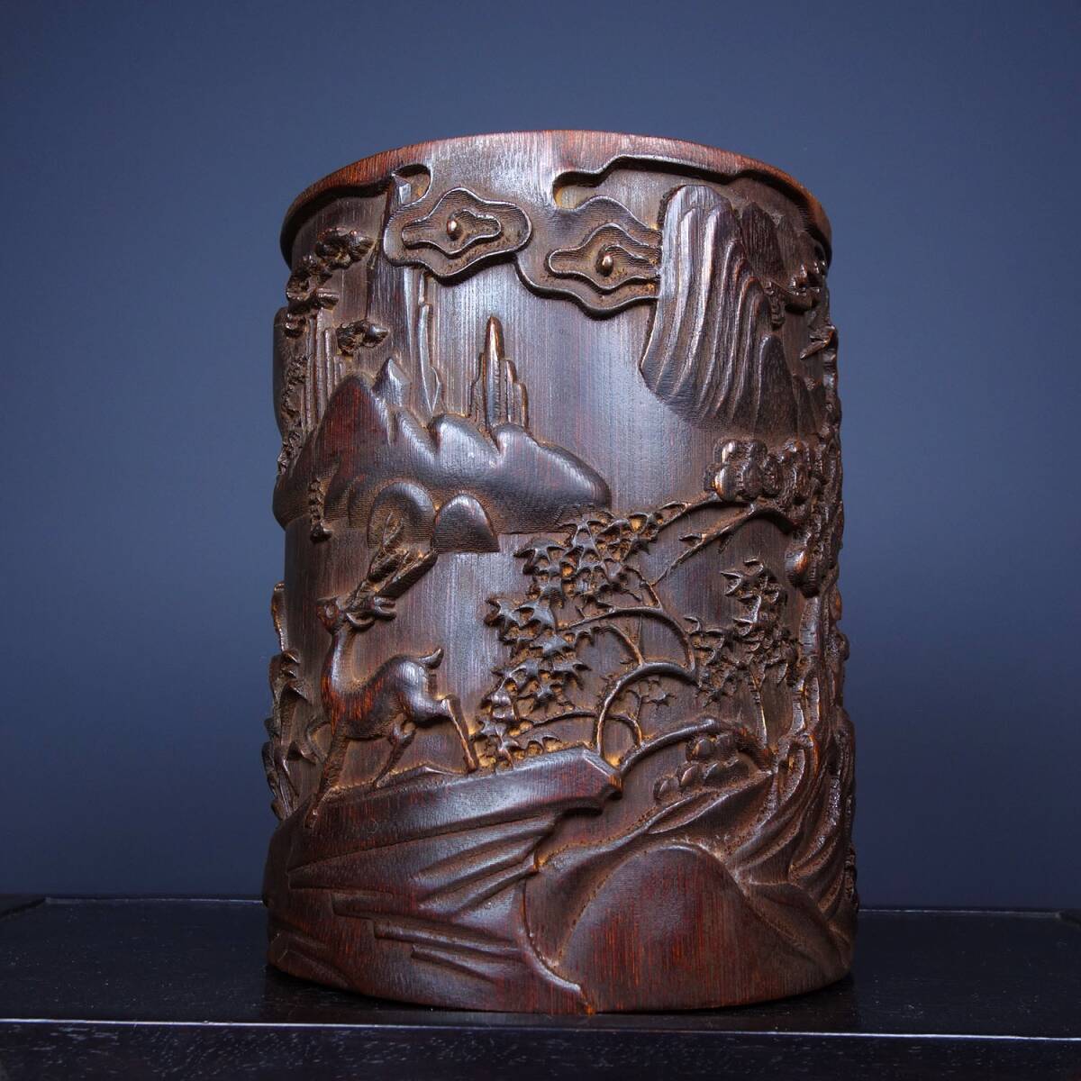 【超珍館蔵】竹材細密彫 一路高升紋 筆筒 置物 賞物 古賞物 古美術品 稀少珍蔵品
