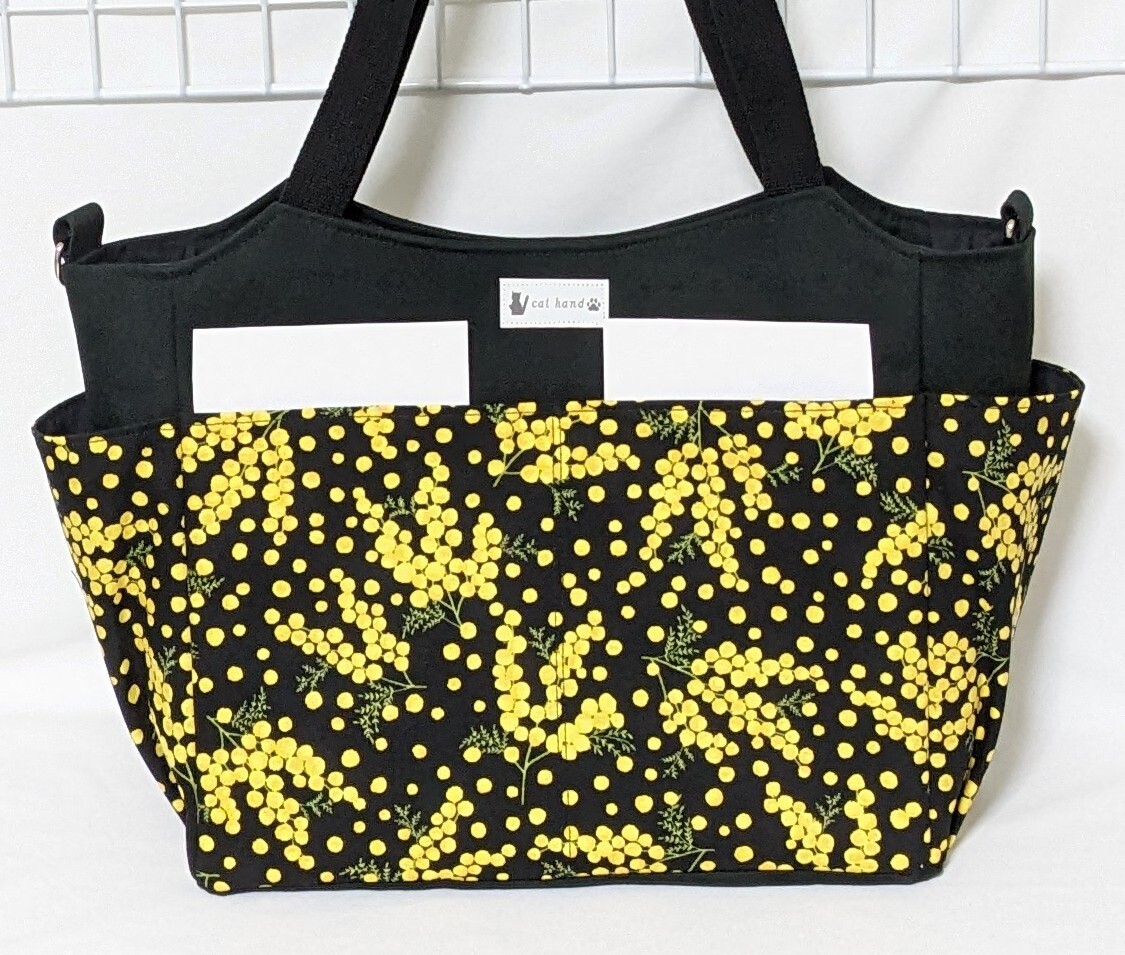 ミモザ柄 (ブラック)・黒色帆布のサイドポケット付きトートバッグW・ハンドメイド
