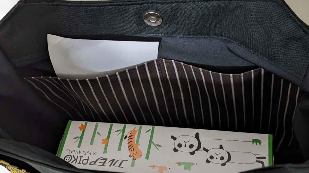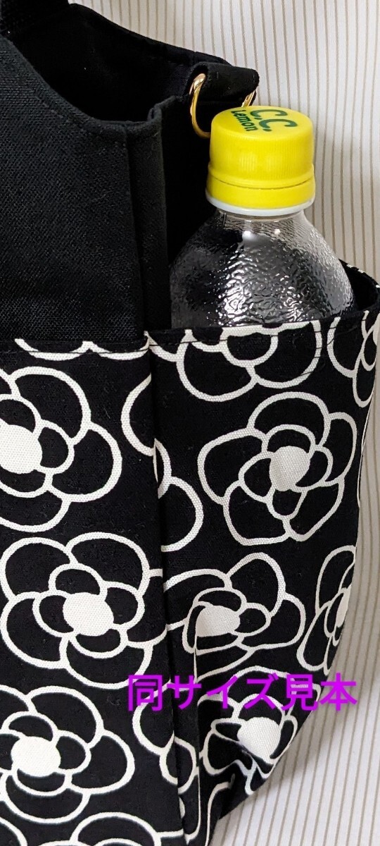 ミモザ柄 (ブラック)の生地をポケットにした黒色帆布のサイドポケット付きトートバッグです。