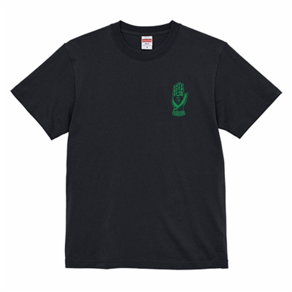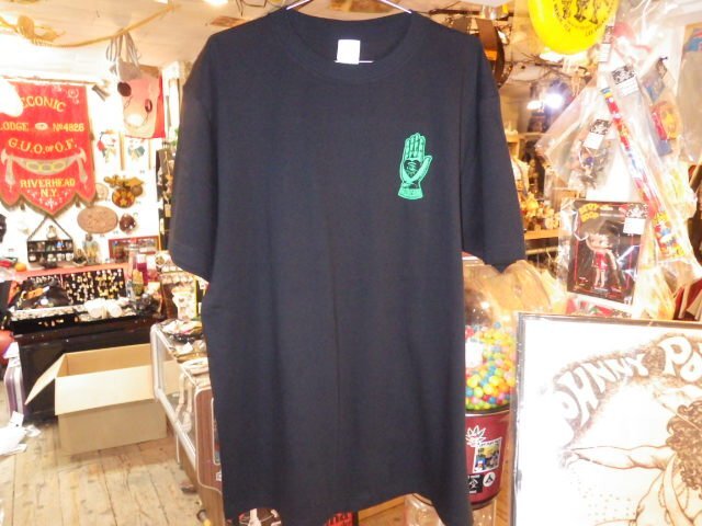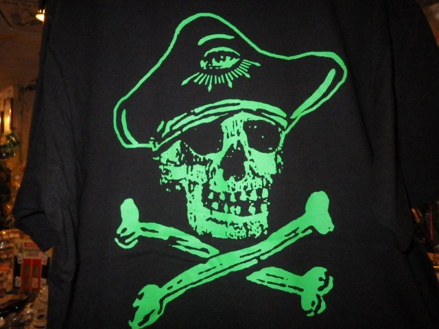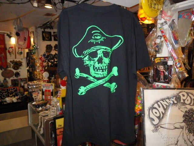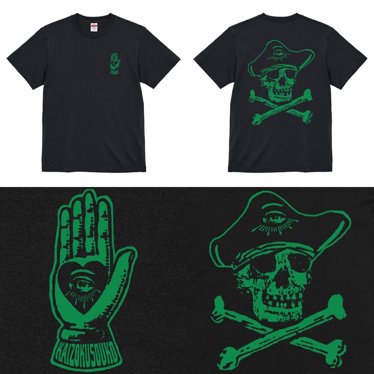Cotton100%のブラックボディーにグリーンプリント、左胸にハート・イン・ハンド×バックにガツンと1発スカルパイレーツ♪