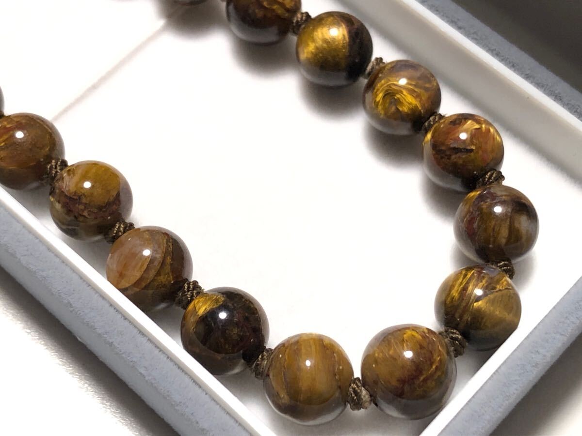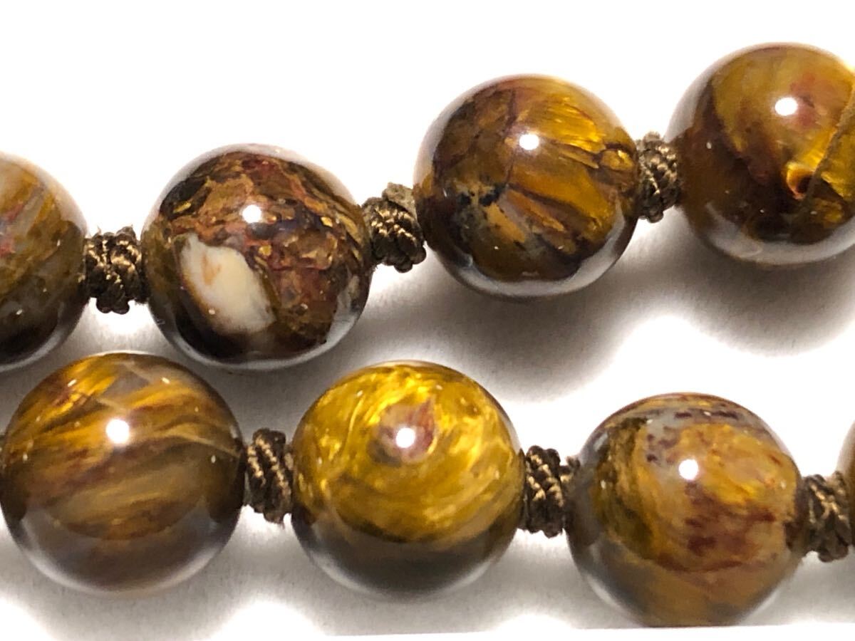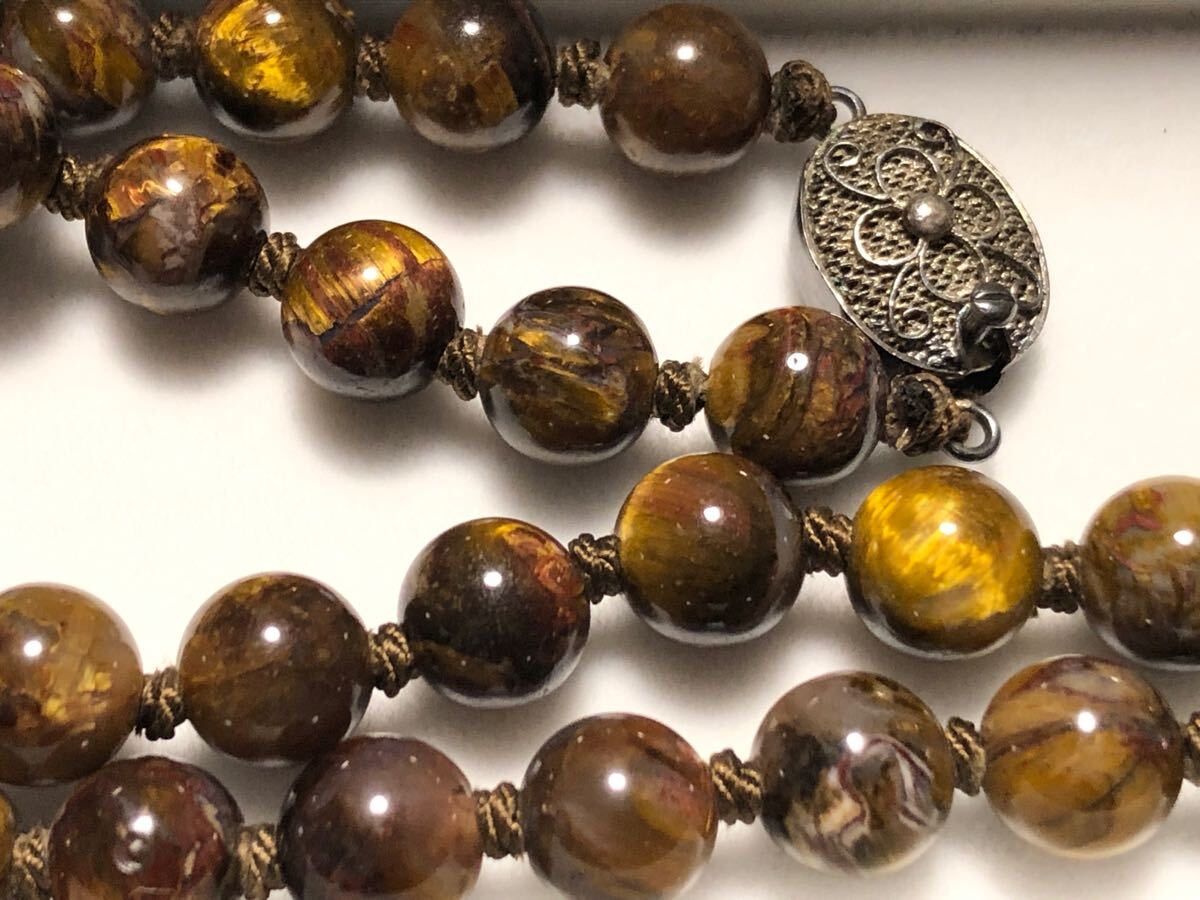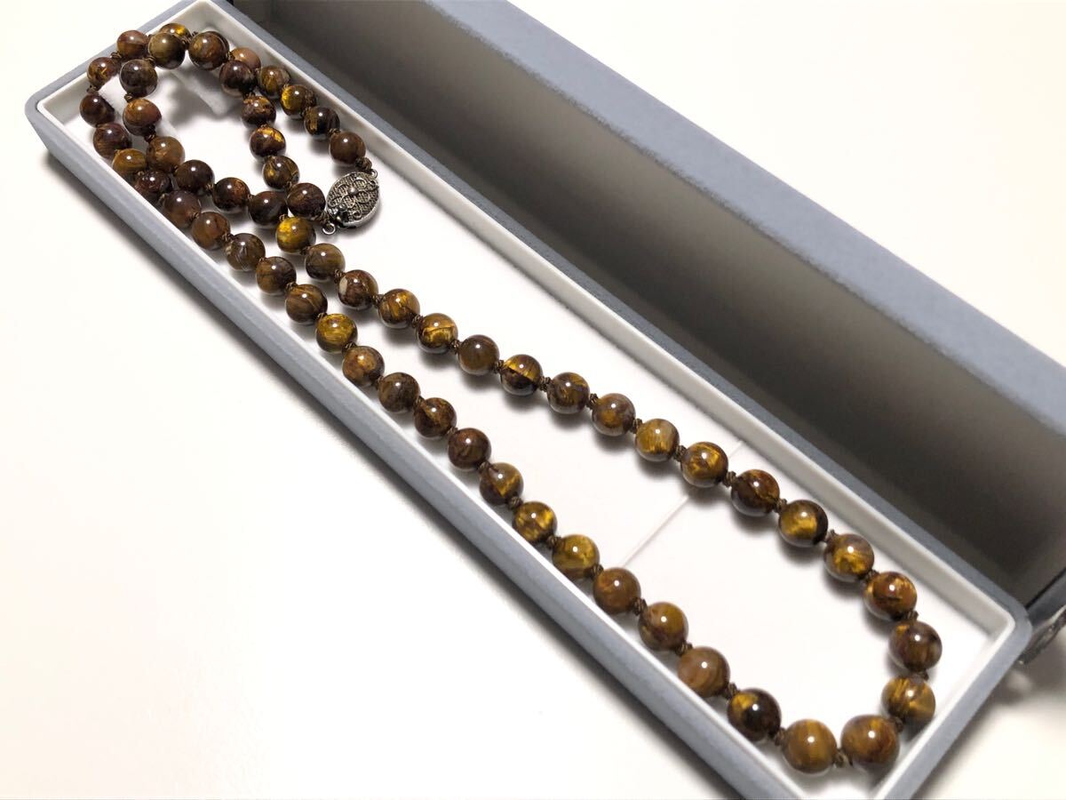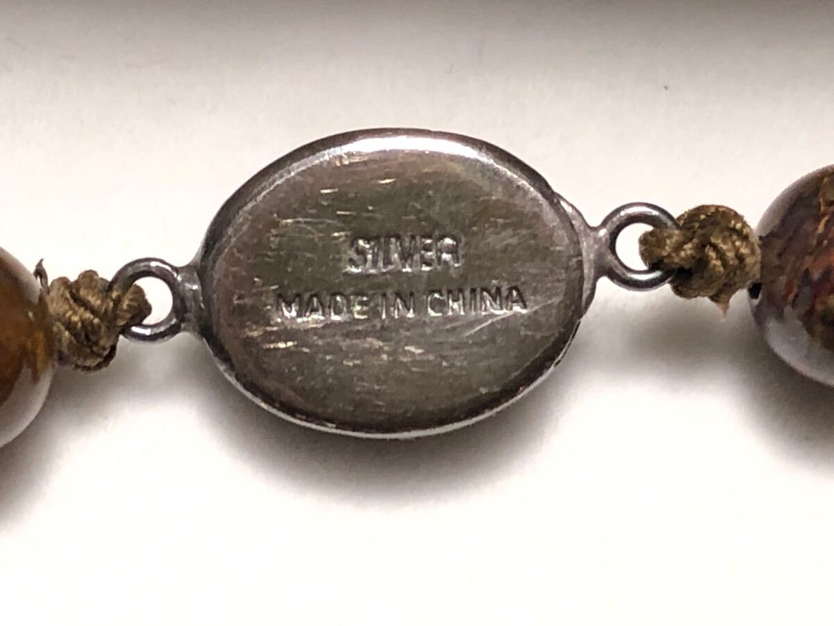 ピーターサイトを使用した、7.5㎜玉のロングネックレスです。金具部分にはSILVERの刻印があります。
