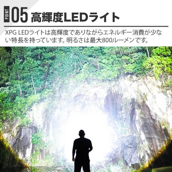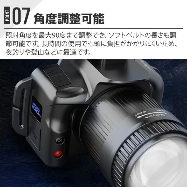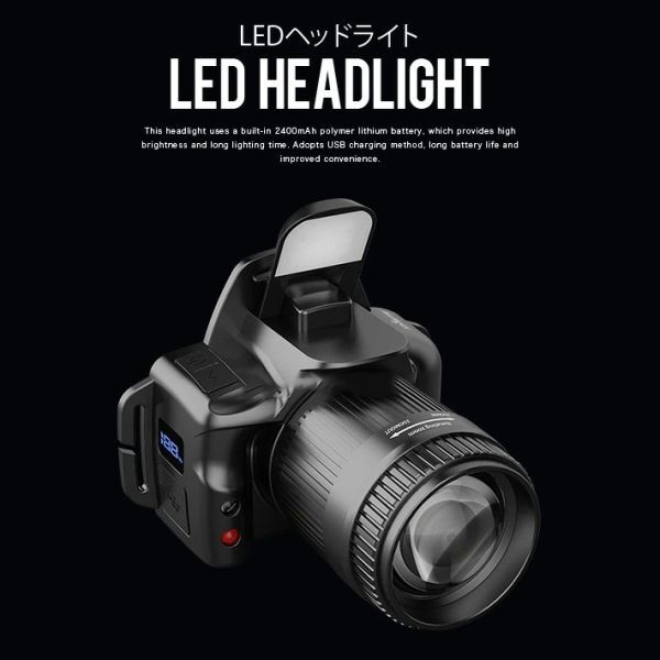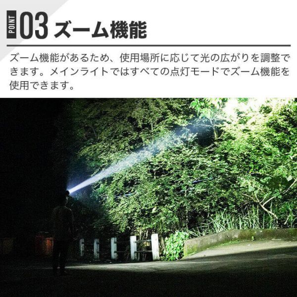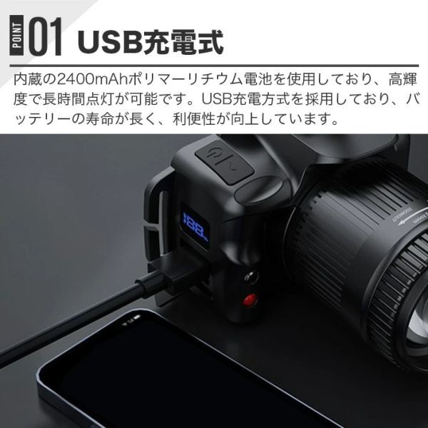 このヘッドライトは、内蔵の2400mAhポリマーリチウム電池を使用しており、高輝度で長時間点灯が可能です。USB充電方式を採用しており、バッテリーの寿命が長く、利便性が向上しています。電源残量を表示するライトも搭載しています。また、ズーム機能があるため、使用場所に応じて光の広がりを調整できます。メインライトではすべての点灯モードでズーム機能を使用できます。