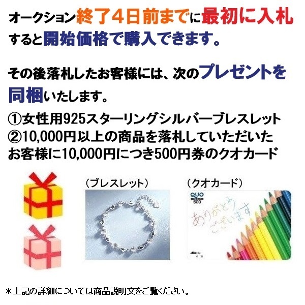 【重要・徹底値下げ】 お問い合わせだけで全商品徹底値下げします。 表示価格はご覧のとおり低価格となっていますが、ご多忙中でお手数のところ、お問い合わせまでしていただいたお客様にはさらに特別値下げします。 弊店では、オークションの残り時間4日までに最初に入札されたお客様は、後続の入札者様に抜かれても開始価格で購入可能です。詳細は商品説明文をご覧ください。 最後までお読みいただきありがとうございました。お買い物をお楽しみくださいませ。