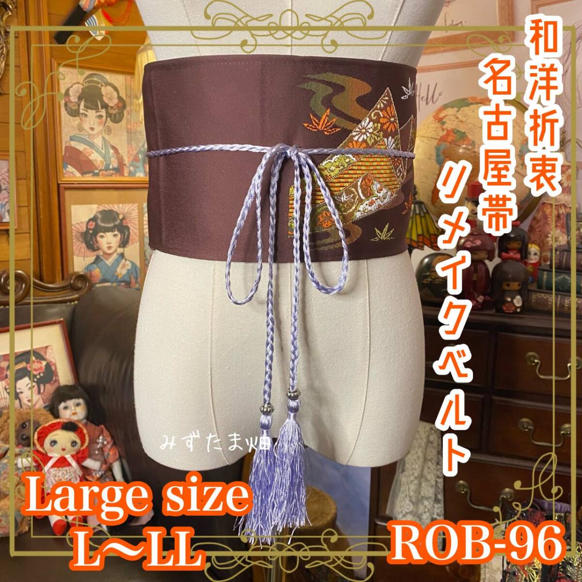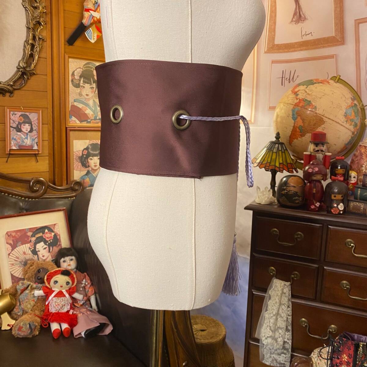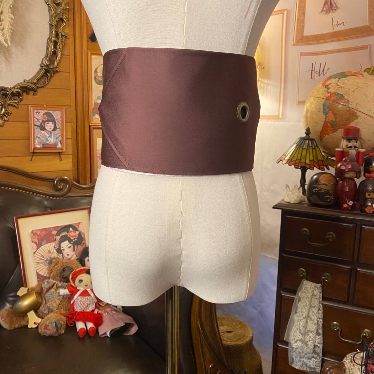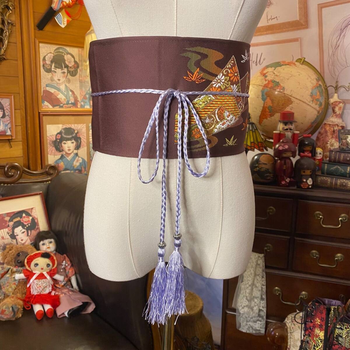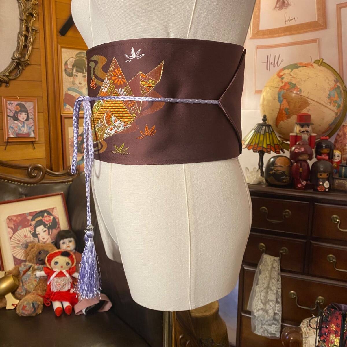 【名古屋帯 リメイク サッシュベルト 飾り帯 和洋折衷 ハンドメイド レトロ 古着 L〜LL対応 こっくりとした赤茶に、控えめな光を放つ金の意匠。 ROB-96】