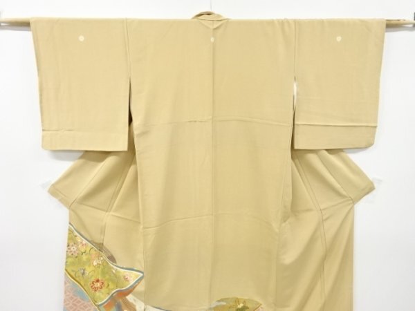 衿は広衿です。胴裏に薄アクが有ります。共八掛で柄入りです。左前身頃裾寄りに薄アクが有ります。掛衿山に薄くすみが有ります。状態は大変良いです。着用可能です。採寸・検品:堤、福永 撮影:北河