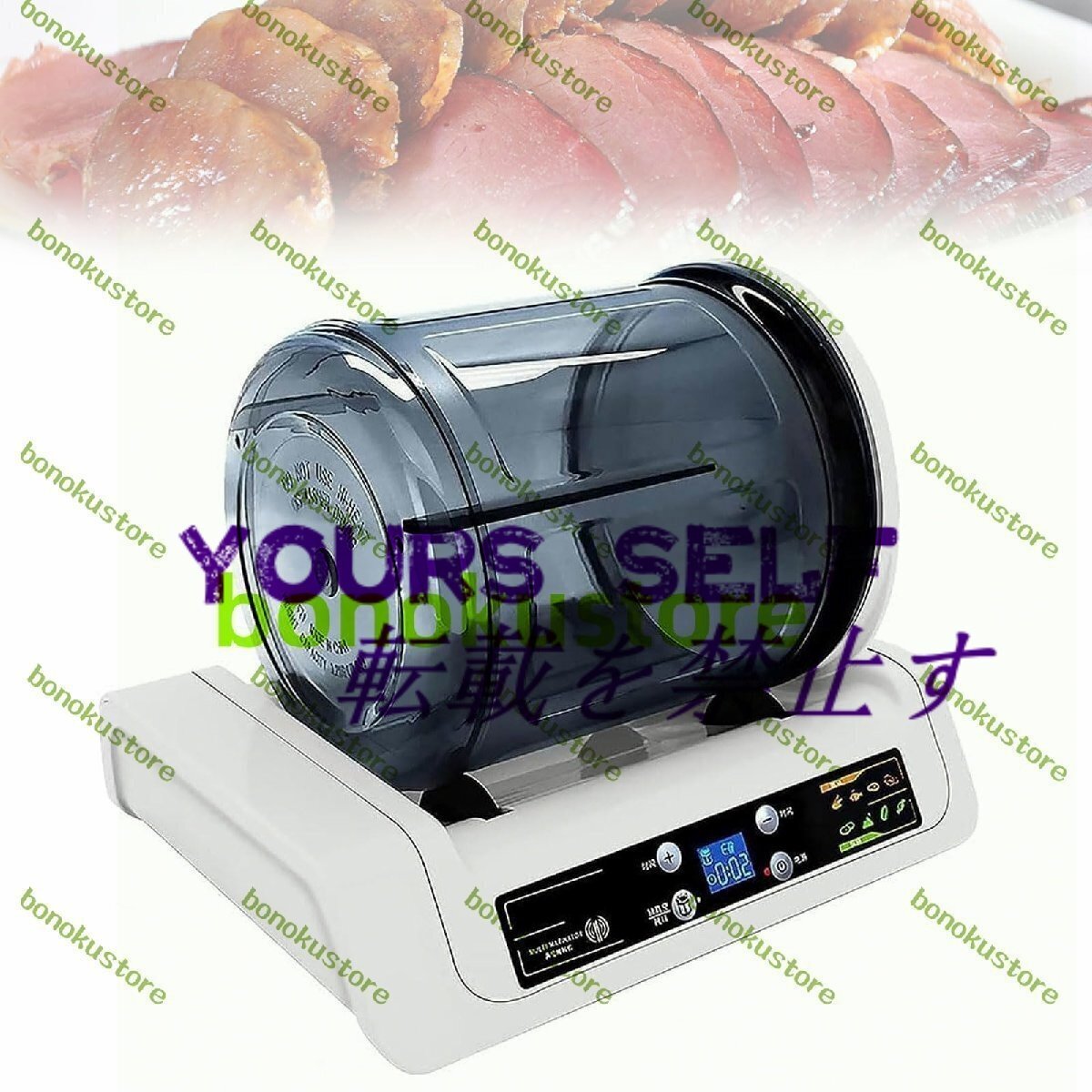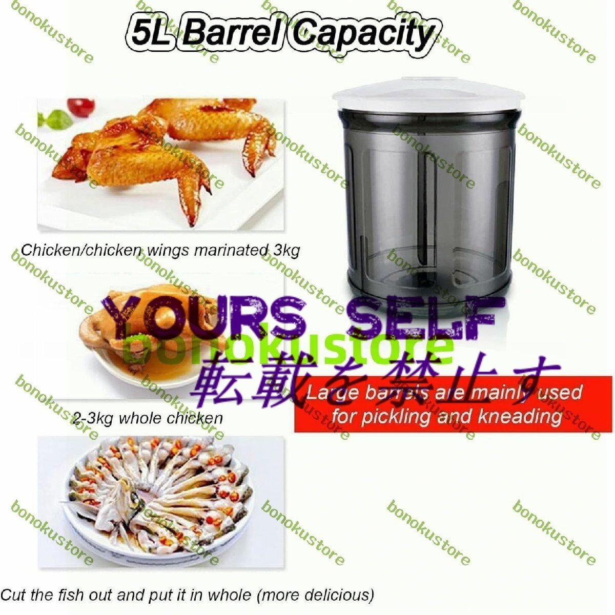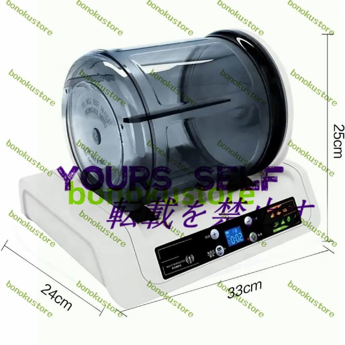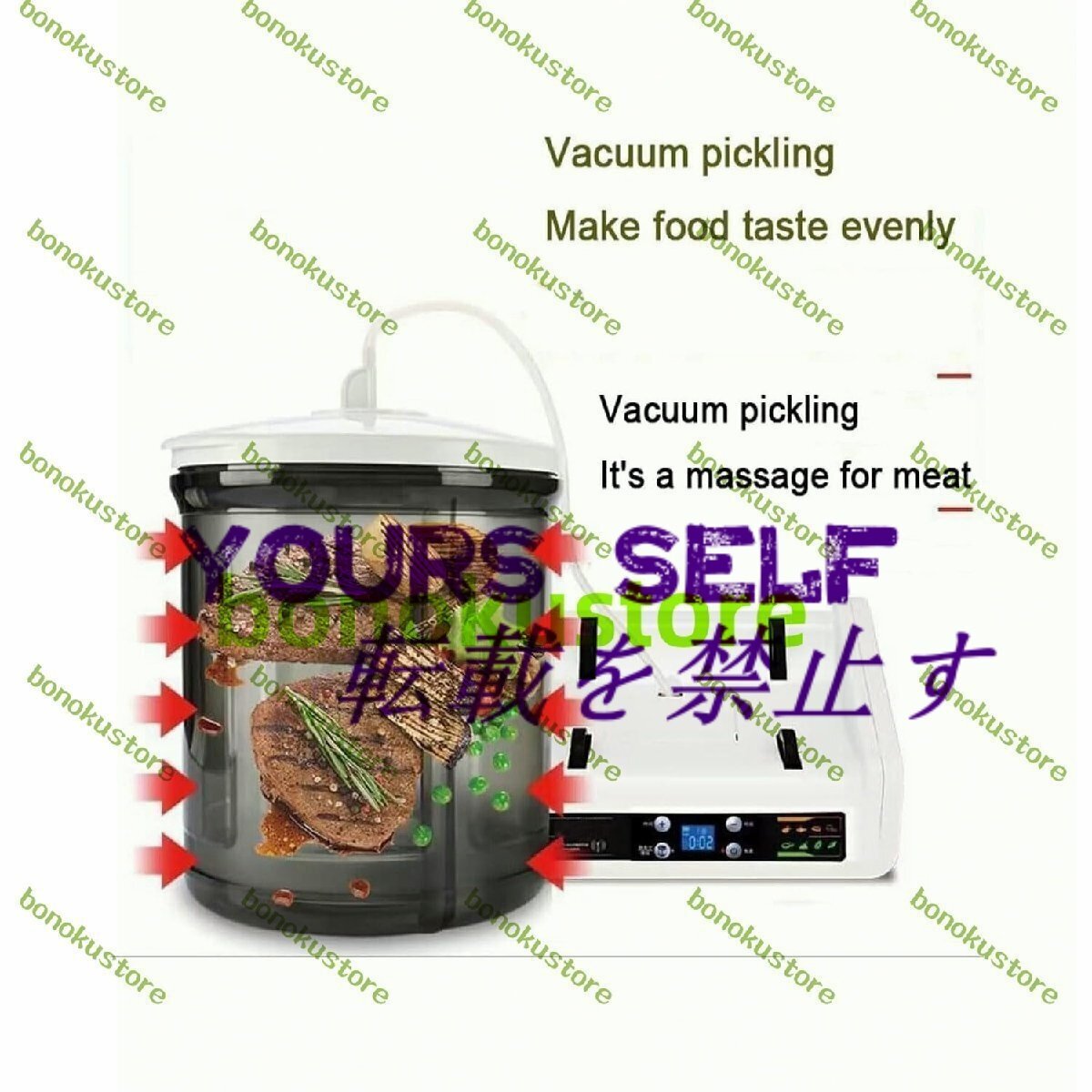 名称: 業務用肉マリネ機 材質:透明で環境に優しいAS 定格電力: 4W 容量: 5リットル 真空内圧:45kpa 製品サイズ: 33 x 24 x 25cm パック: 肉マリネ機 x 1