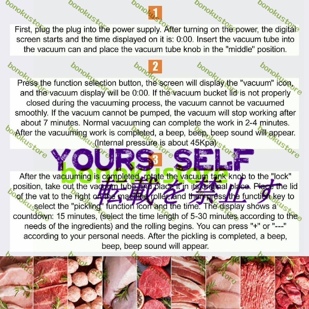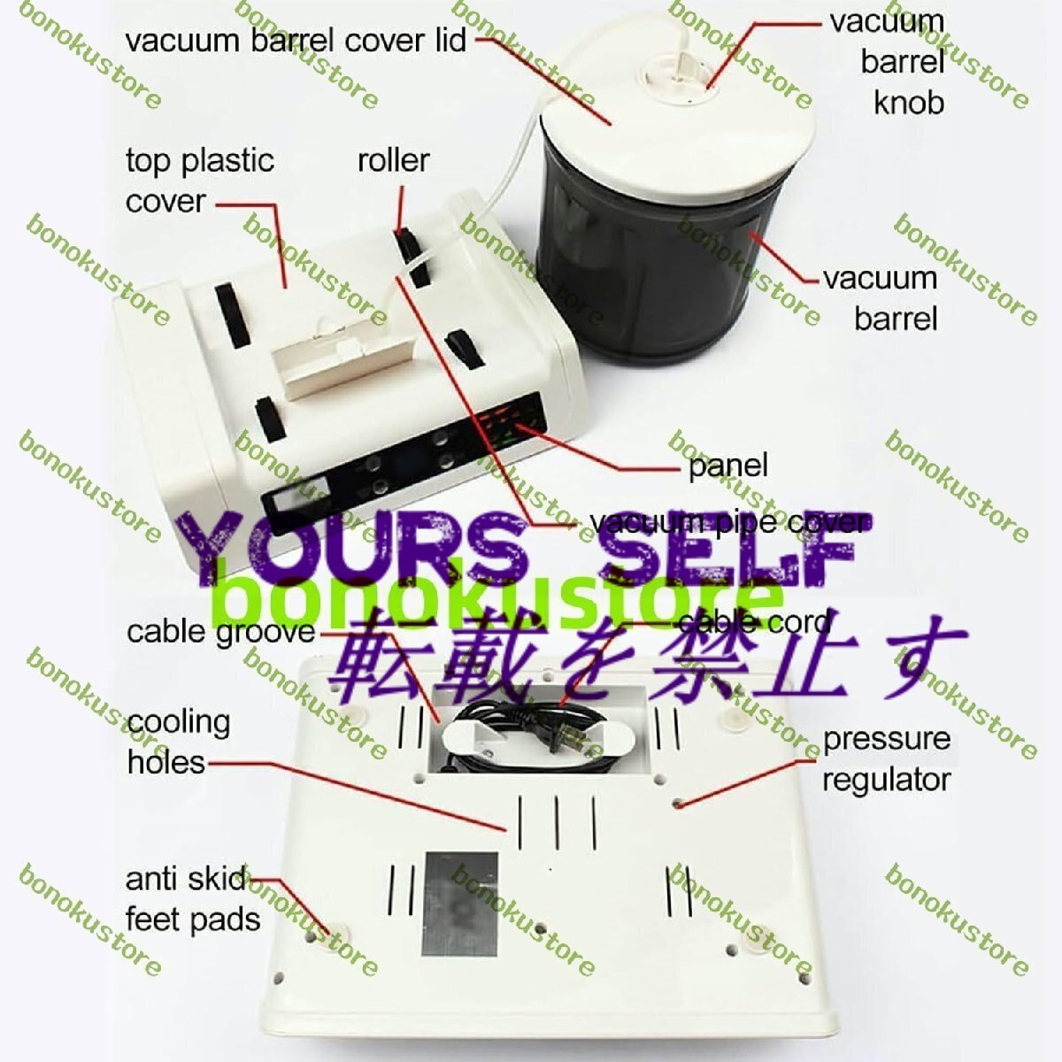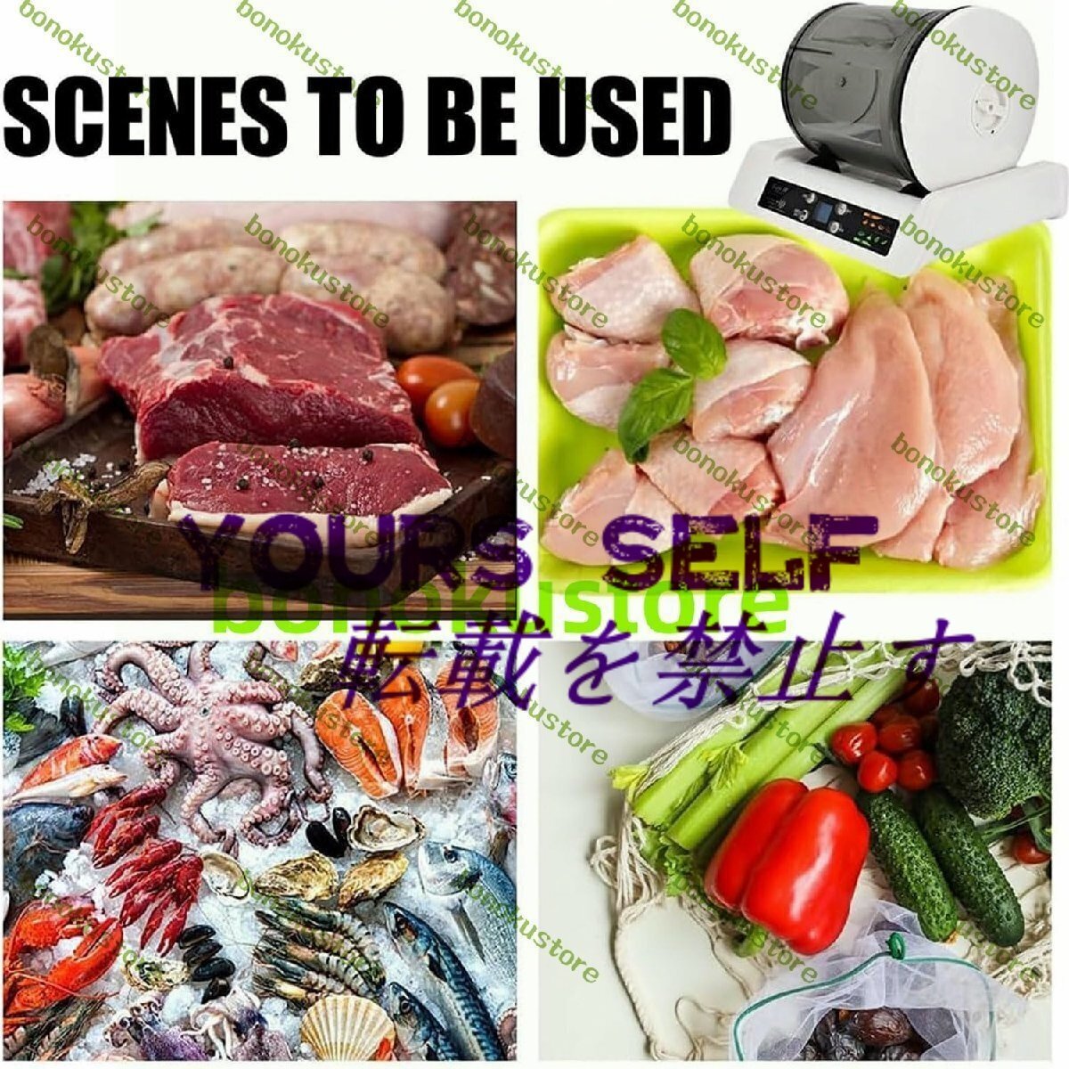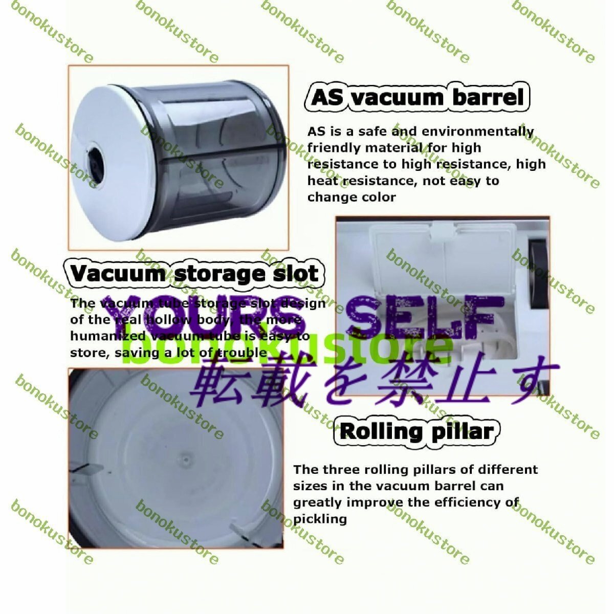 名称: 業務用肉マリネ機 材質:透明で環境に優しいAS 定格電力: 4W 容量: 5リットル 真空内圧:45kpa 製品サイズ: 33 x 24 x 25cm パック: 肉マリネ機 x 1