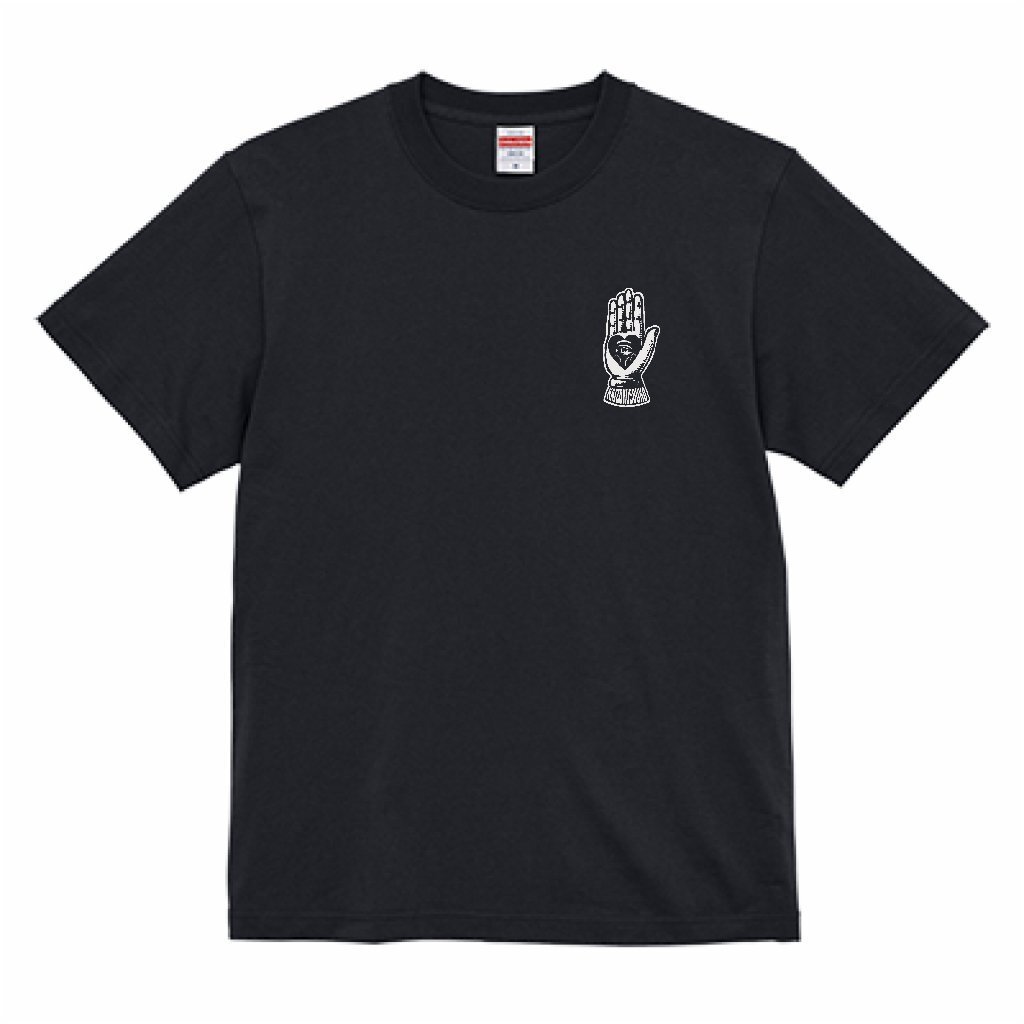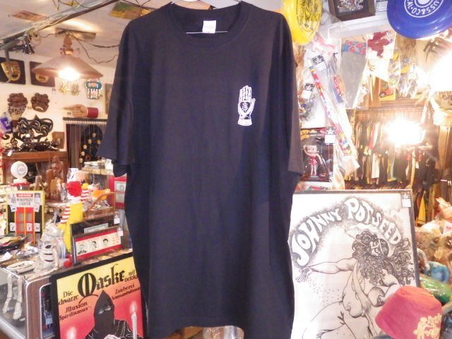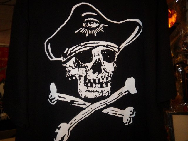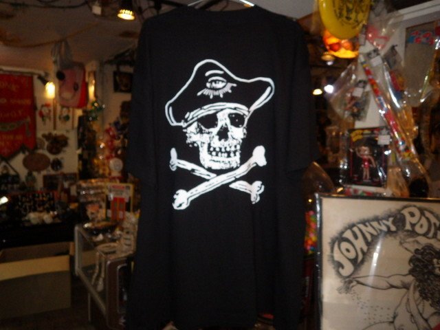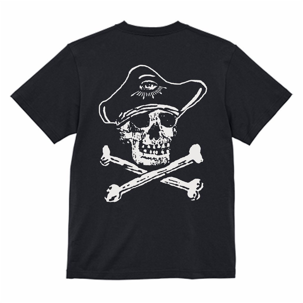 Cotton100%のブラックボディーにホワイトプリント、左胸にハート・イン・ハンド×バックにガツンと1発スカルパイレーツ♪