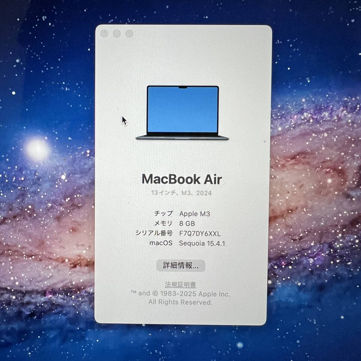 システム構成: 8コアCPU、10コアGPU、16コアNeural Engine搭載Apple M3チップ 8GBユニファイドメモリ デュアルUSB-Cポート搭載35Wコンパクト電源アダプタ 512GB SSDストレージ Thunderbolt / USB 4ポート x 2 MagSafe 3充電ポート True Tone搭載13.6インチLiquid Retinaディスプレイ 1080p FaceTime HDカメラ アクセサリキット |
