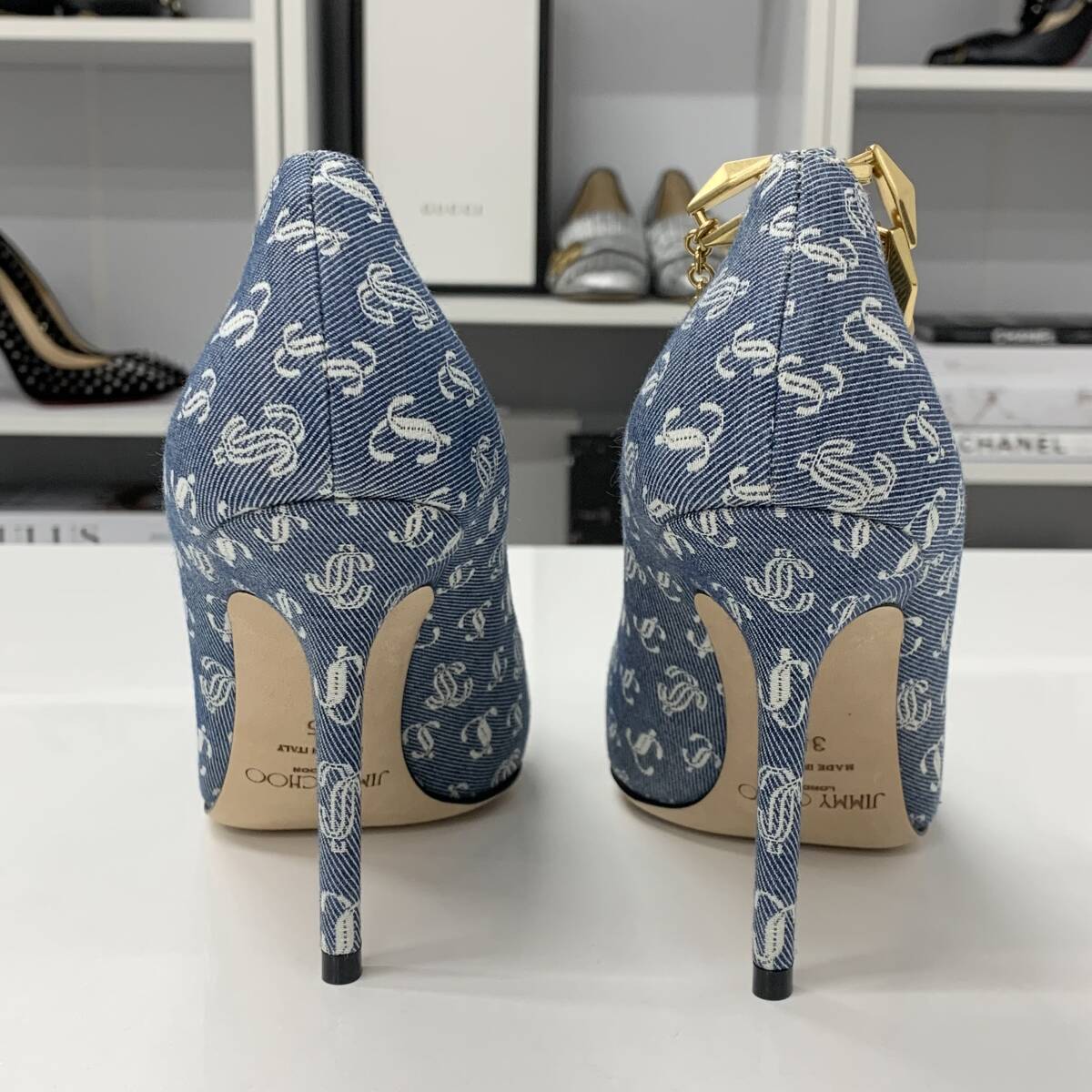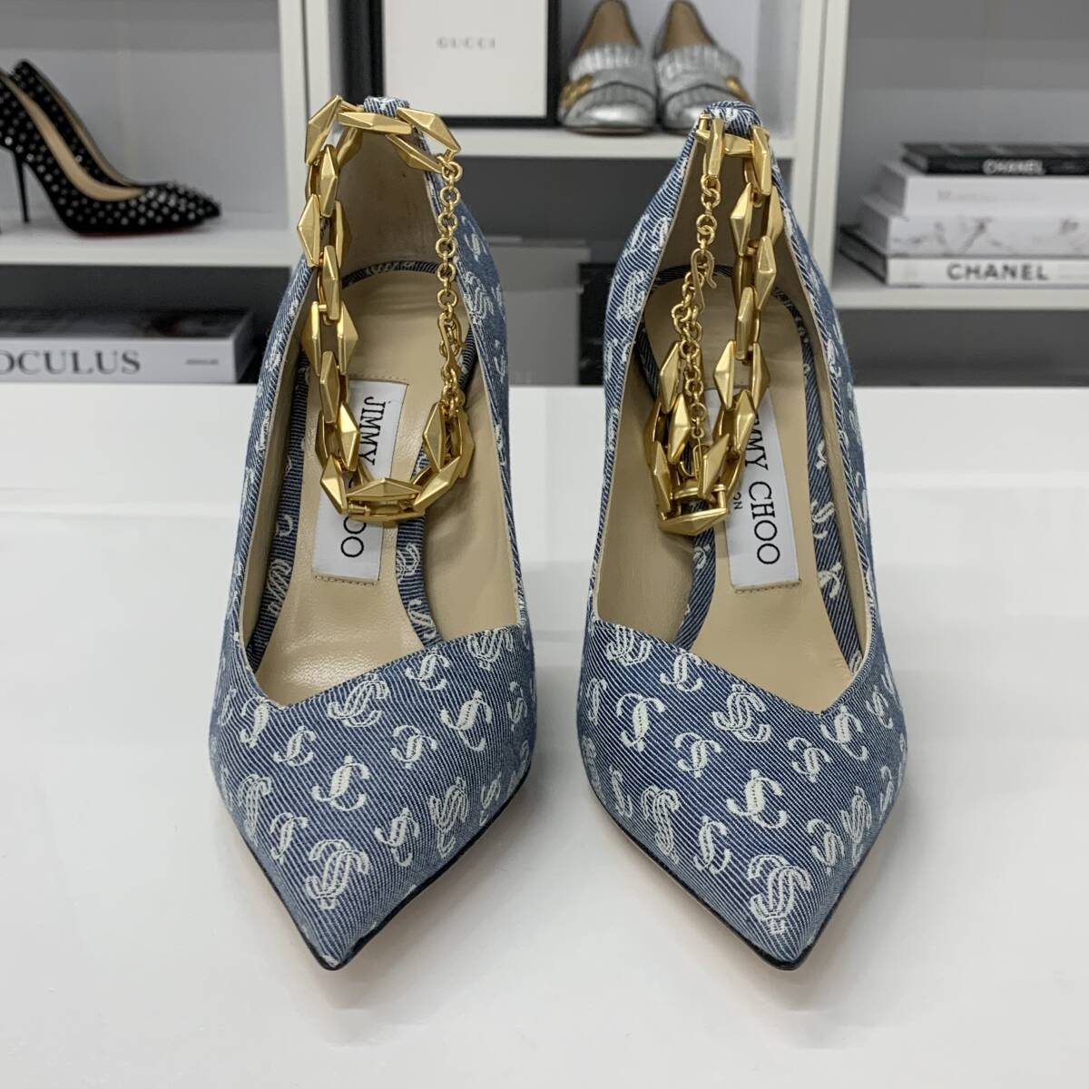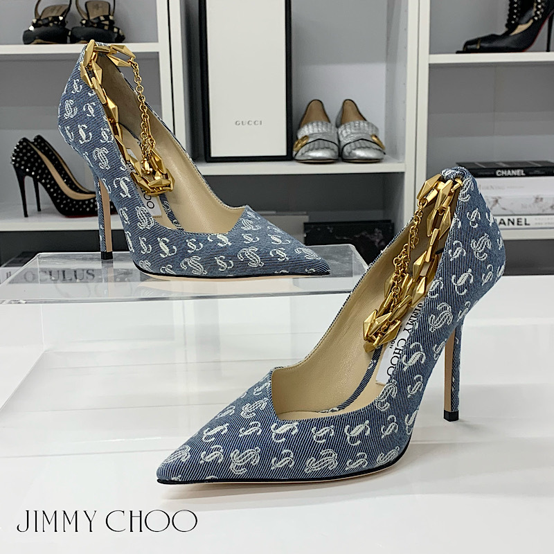 未使用 ジミーチュウ DIAMOND TALURA デニム ロゴ チェーン パンプス ブルー