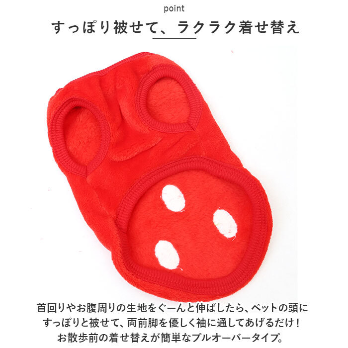| 商品説明 | ・・ぽかぽかウェアに着替えたら、ご家族みんながほっこり笑顔に♪背中のモチーフが可愛らしい「防寒ペットウェア」が新登場! ・【ふんわり着せて、優しく防寒】 ・ウェアの表生地はベルベッドのように滑らかなフリース素材、裏側はもこもことした毛足が気持ちよいボア生地仕上げ。ウェア内側の暖かな空気をキープして、薄手なのに肌寒い季節でもぽかぽかと快適な着心地。 ・【すっぽり被せて、ラクラク着せ替え】 ・首回りやお腹周りの生地をぐーんと伸ばしたら、ペットの頭にすっぽりと被せて、両前脚を優しく袖に通してあげるだけ!お散歩前の着せ替えが簡単なプルオーバータイプ。 ・【ピタッと可愛いシルエットに】 ・首回りや袖口、ウェアの裾は伸縮性のあるリブ生地で仕上げてあるため、ワンちゃんの身体のラインにぴったりフィット。スキマ風をシャットアウトして、木枯らしが吹く日も元気にお散歩。 ・【おトイレの時も安心】 ・お腹まわりやお尻は大きく開いたデザインなので、おトイレでウェアの生地を汚す心配がないのも嬉しいポイント! ・【ご家庭で簡単お洗濯♪】 ・取り扱いが楽なフリース素材なので、優しく手洗いすればご家庭で手軽にお洗濯OK!こまめにお手入れしていつでも清潔な着心地をキープ。(※タンブラー乾燥はご利用いただけません。) ・【ピッタリサイズをチョイス!】 ・XSサイズからXLサイズまでの5つのサイズから、ぴったりサイズがチョイス可能!超小型犬から、胴回り46cm程度までの中型~小型のワンちゃんに最適なサイズ感。小さなサイズはネコちゃんにもオススメ。 ・【みんなが笑顔になるデザイン】 ・真っ赤なイチゴに、色鮮やかなトリプルアイスのポンポン・・・バラエティに富んだ背中のモチーフがチャームポイント!お気に入りのウェアでお散歩に出掛けたら、道行く人が笑顔で振り返るキュートなラインナップ。(※一部刺繍などのモチーフがなく、プリントのみのカラーもございます。) ・【ルームウェアにも◎】 ・肌寒さが気になる季節のお散歩用ウェアとしてはもちろん、ルームウェアやパジャマとして、朝晩の冷え込み対策にもオススメ。 |