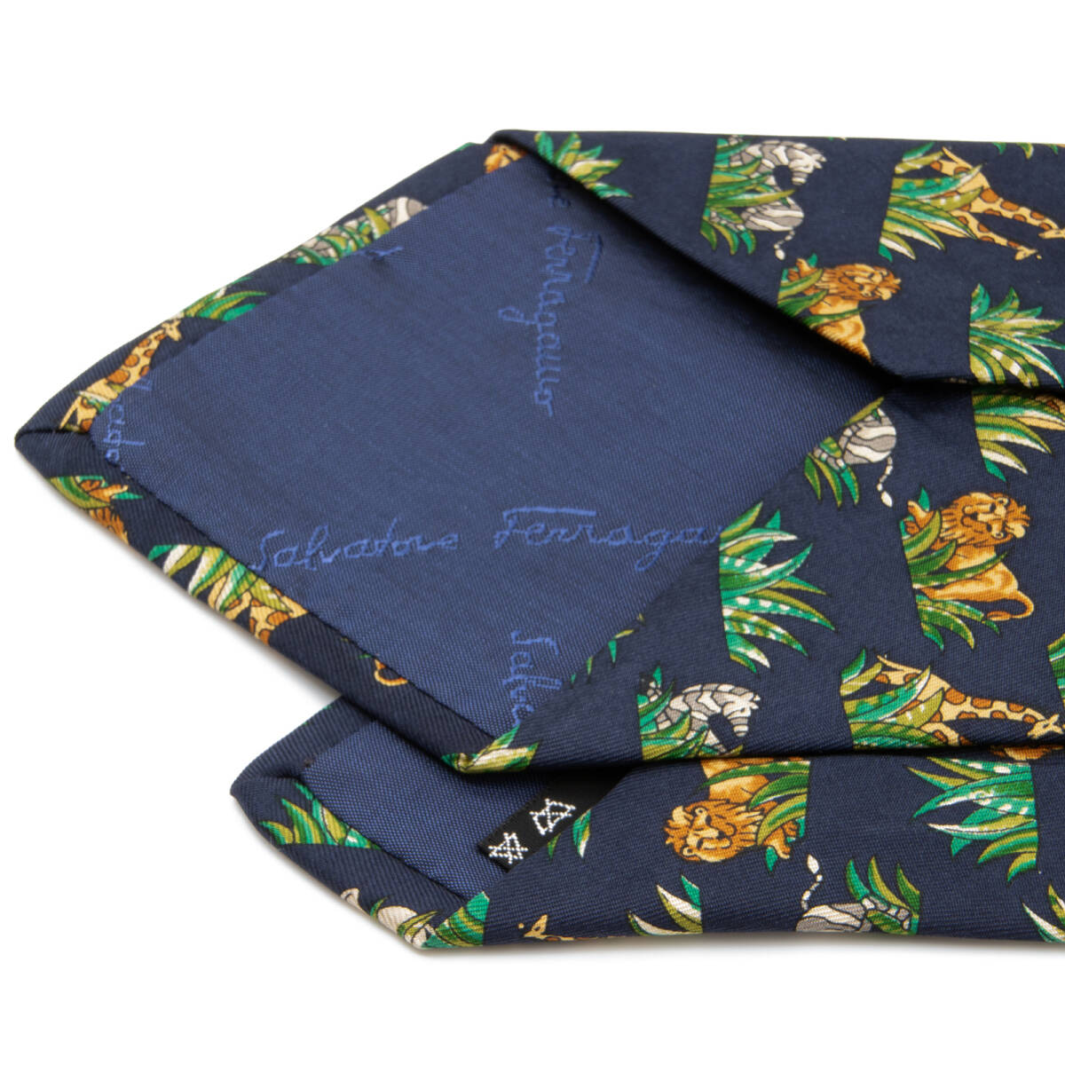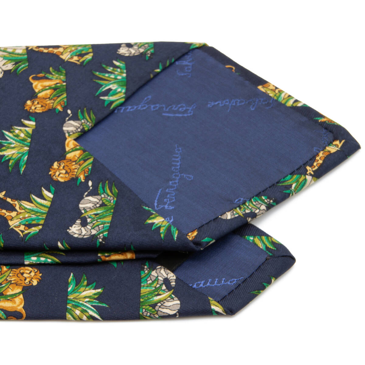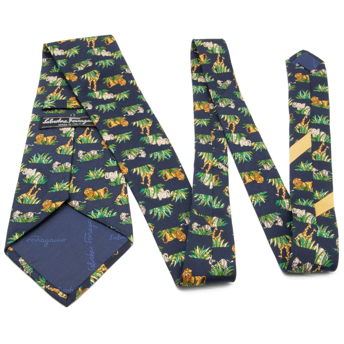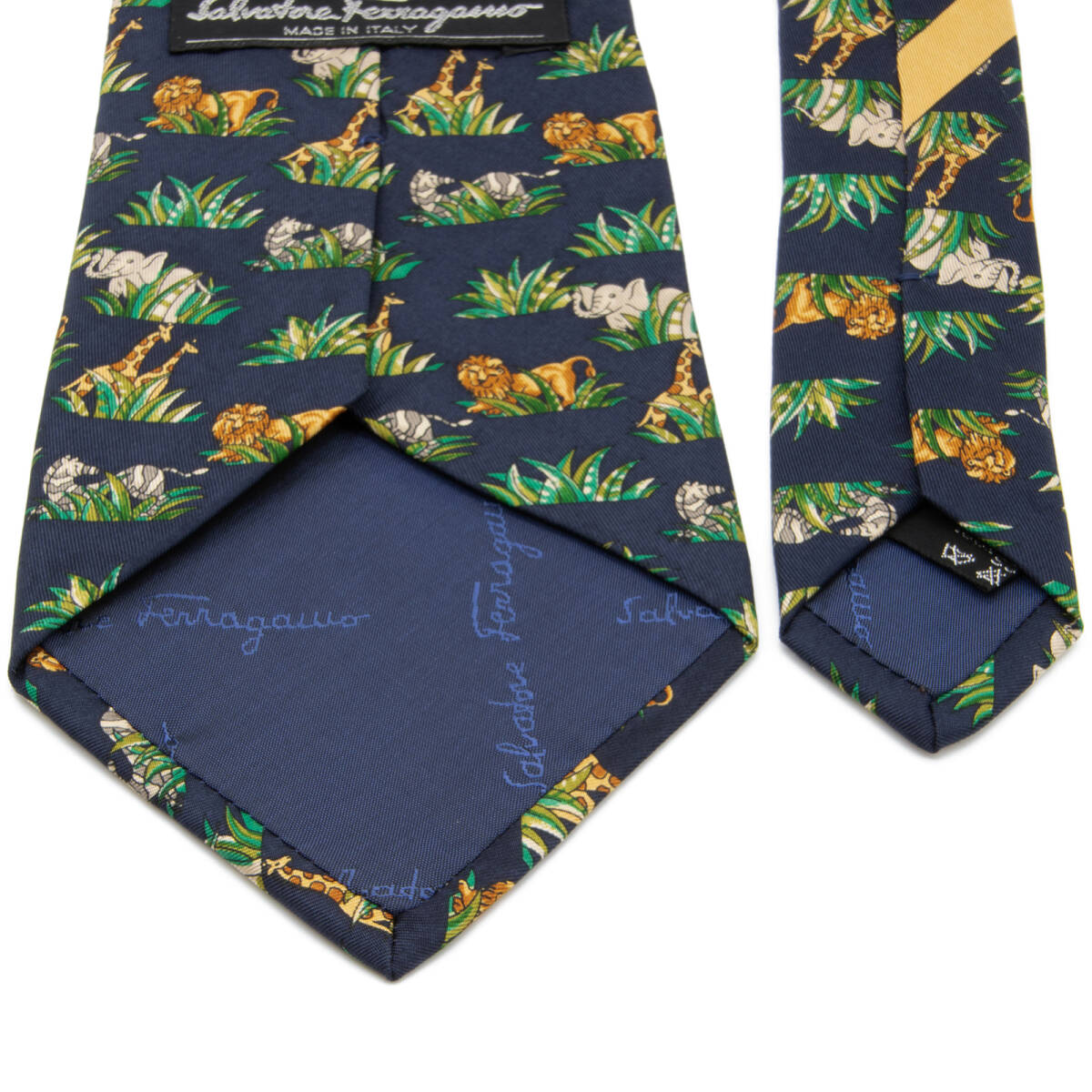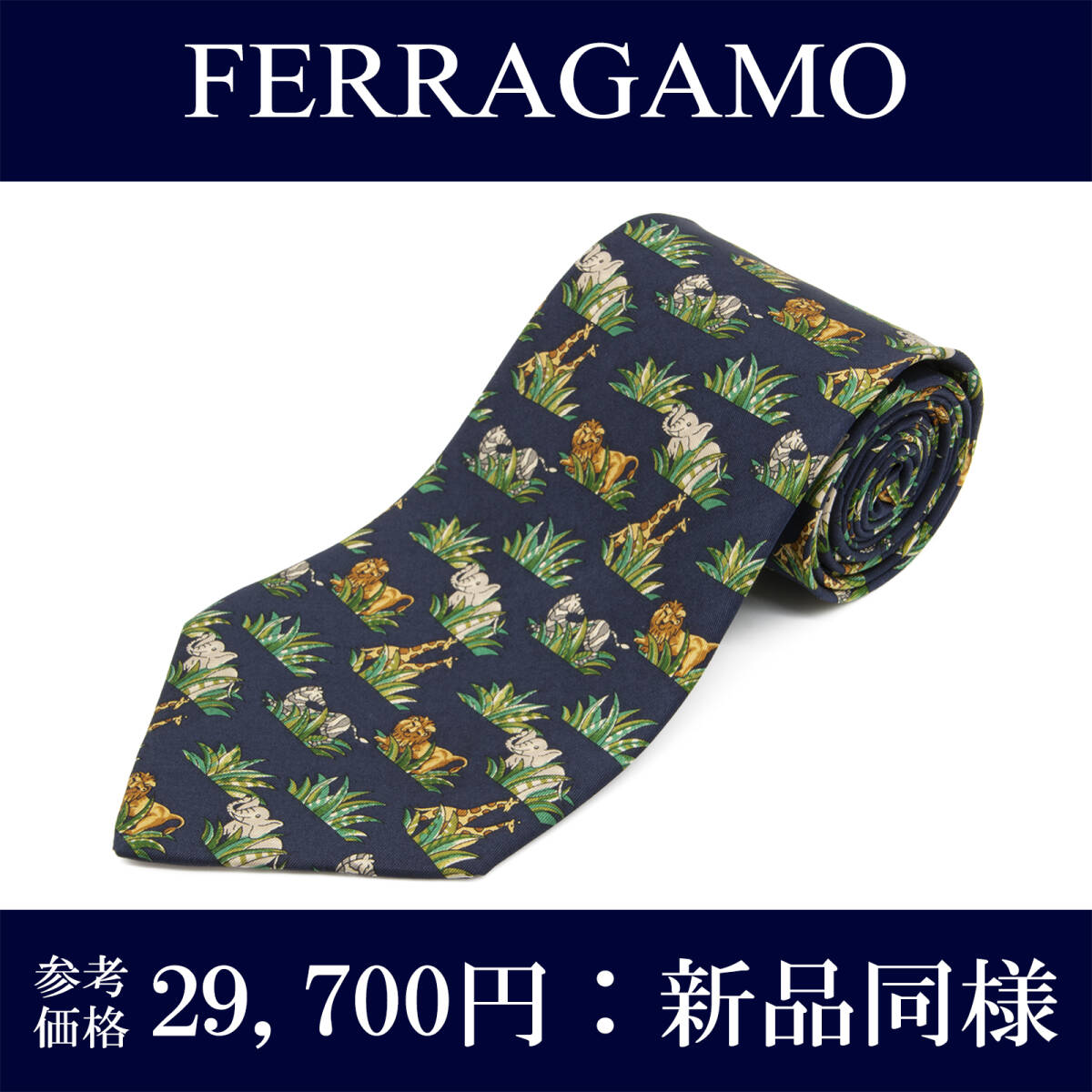 送料無料 フェラガモ ネクタイ 新品同様 シルク 青 ネイビーブルー 緑 茶色 ブランド 人気 動物 アニマル 象 ライオン キリン 綺麗 N290