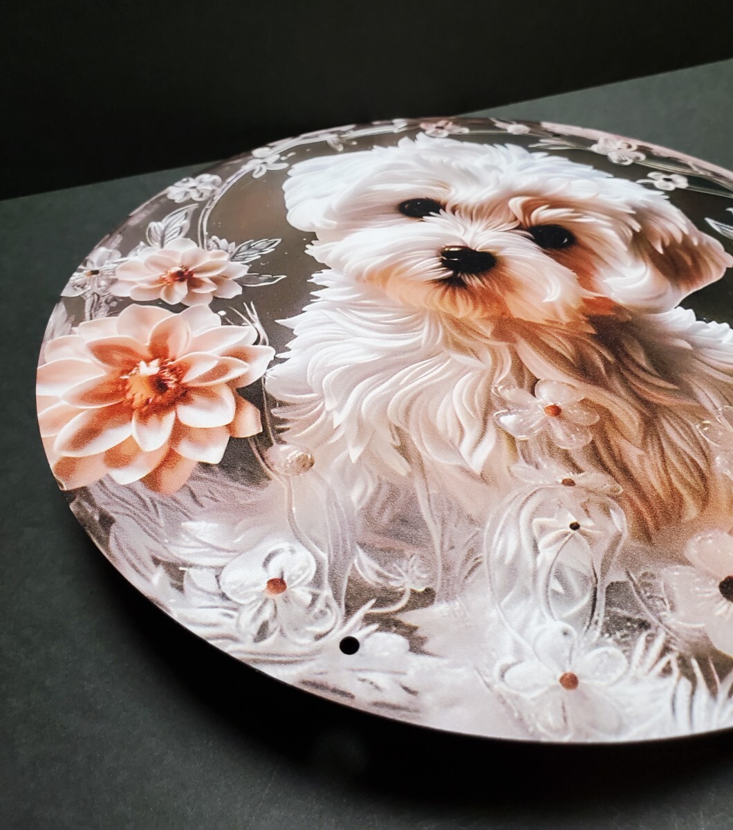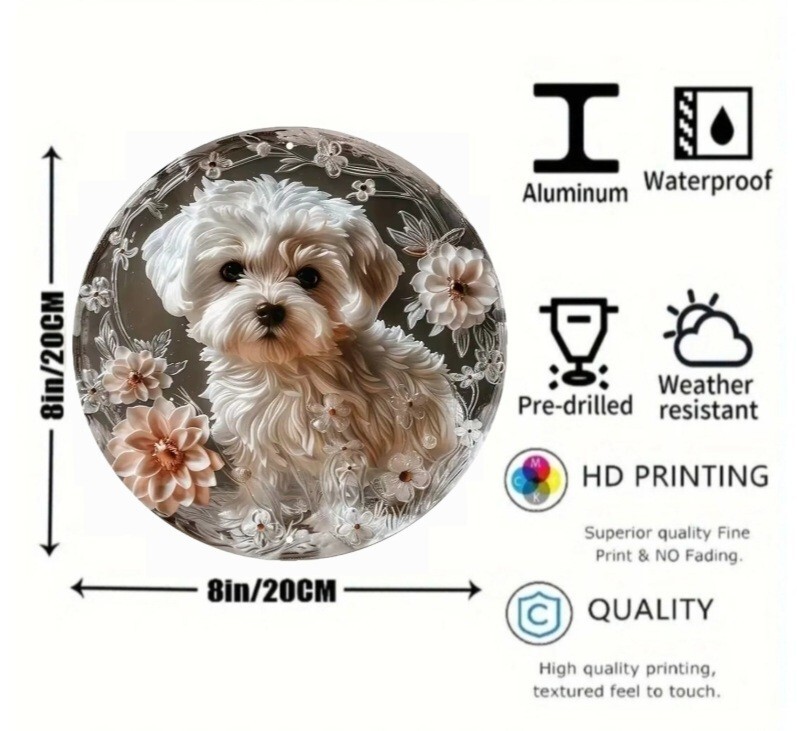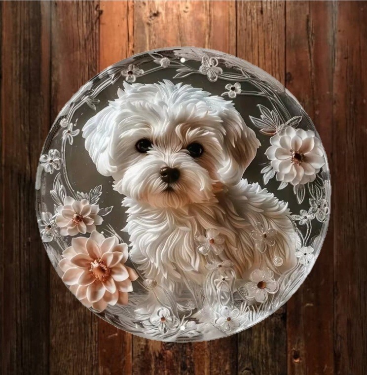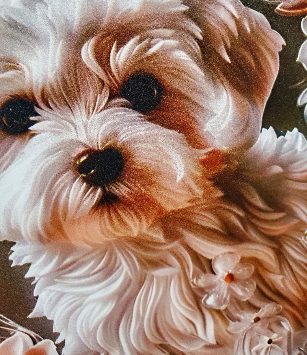 アルミニウムのメタルボードに3Dのプリント技術で描かれた犬のメタルアートです。
