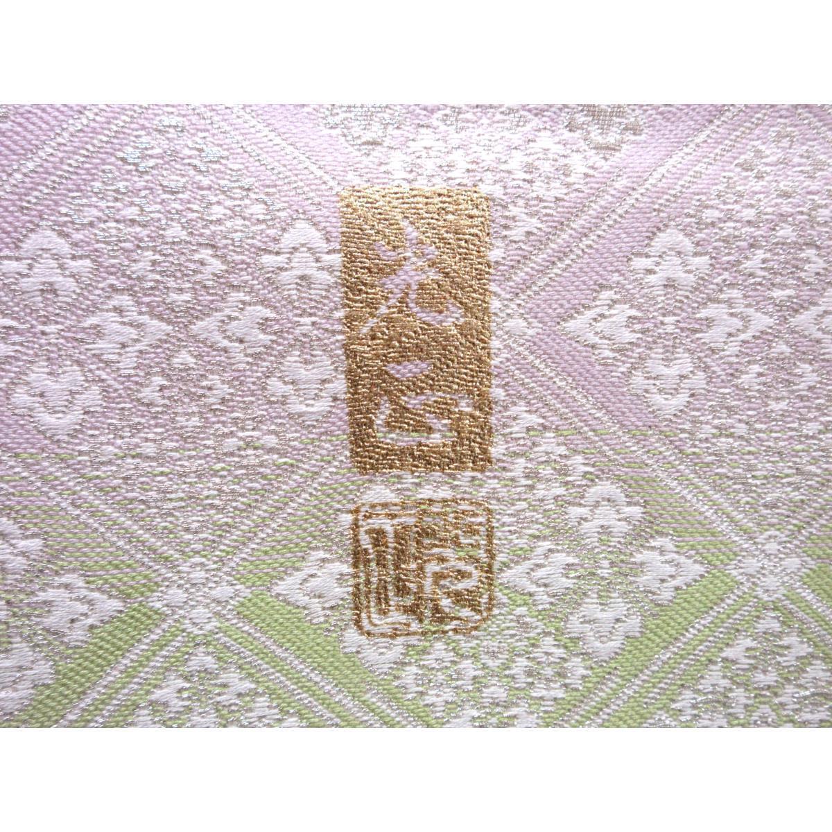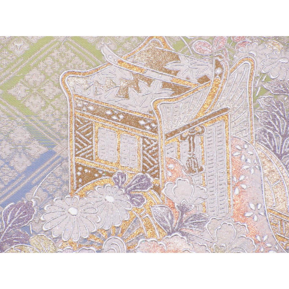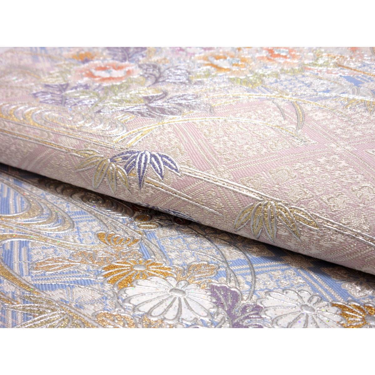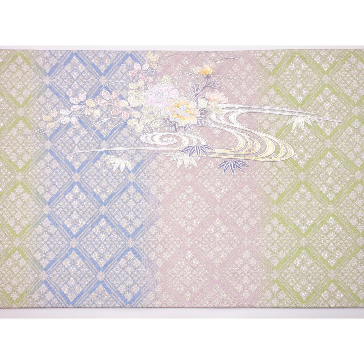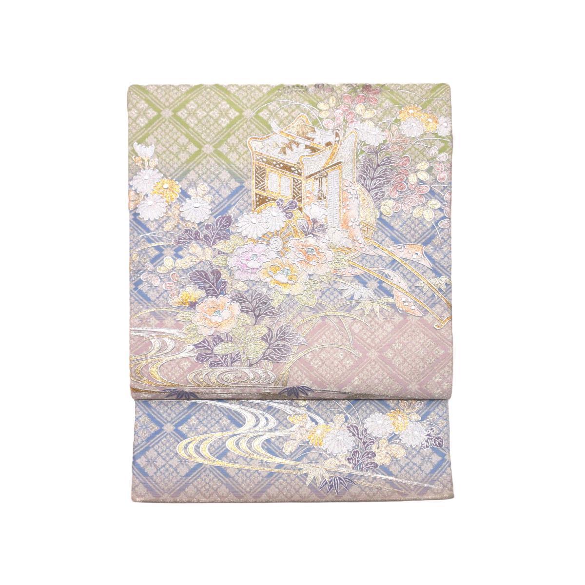 花菱格子の地模様のある地に、御所車や牡丹に菊などを金彩友禅であらわした和田光正の袋帯です。ピンク・黄緑・水色で明るい横段のボカシにした地に、金彩の美しさが品良く映える逸品です。適応きもの:訪問着、色無地適応シーン:パーティー、お出かけ
