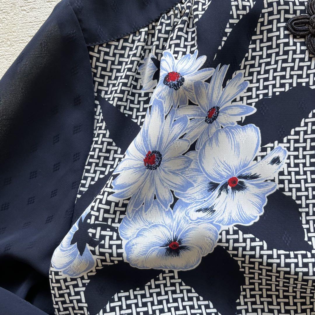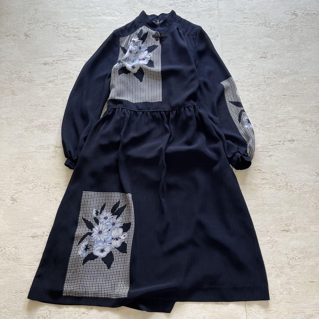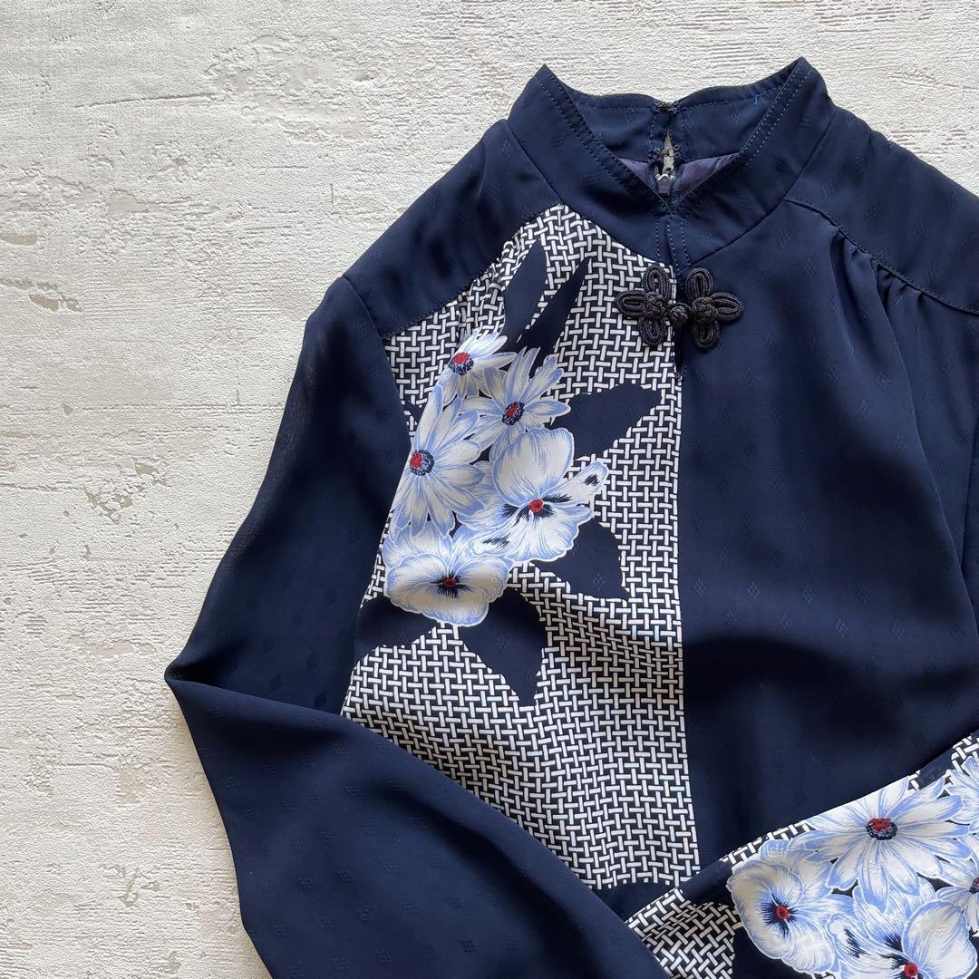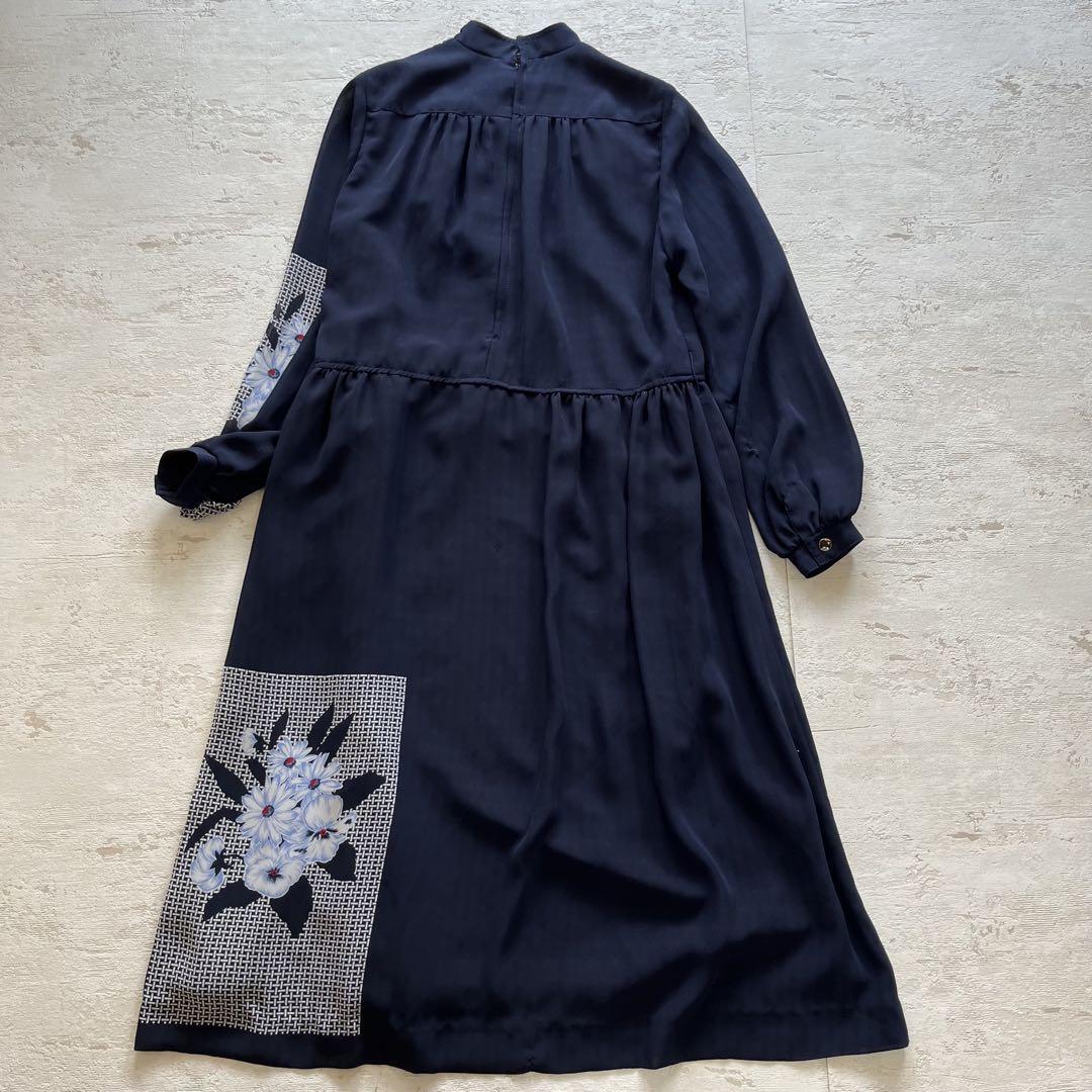 昭和レトロ花柄長袖ロングワンピースアシンメトリー柄フリーサイズネイビーP2