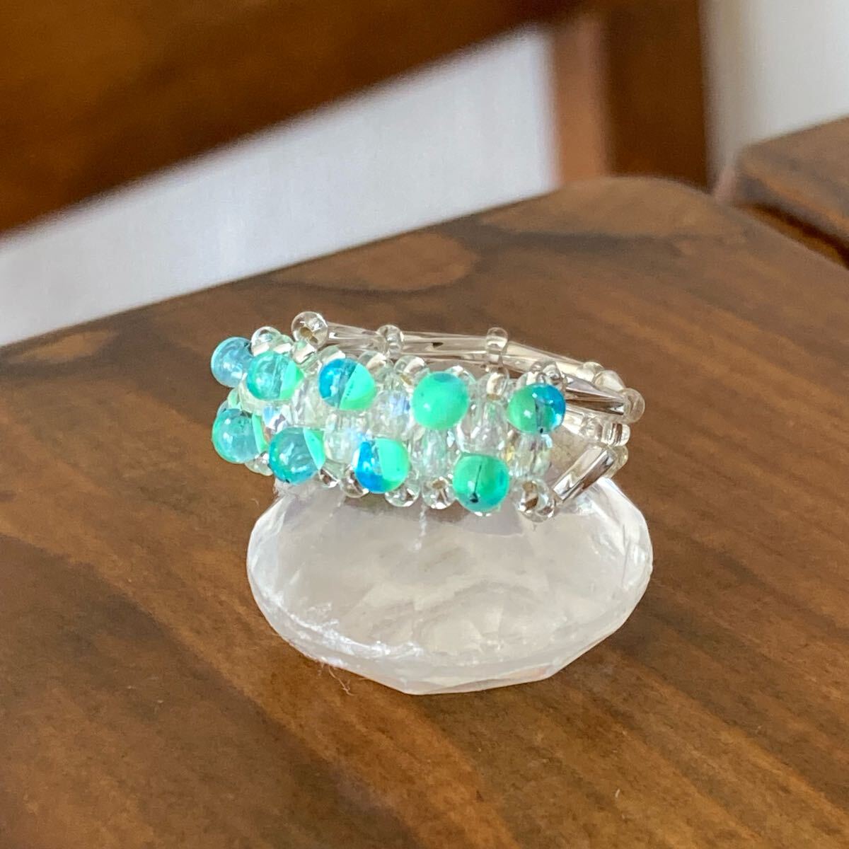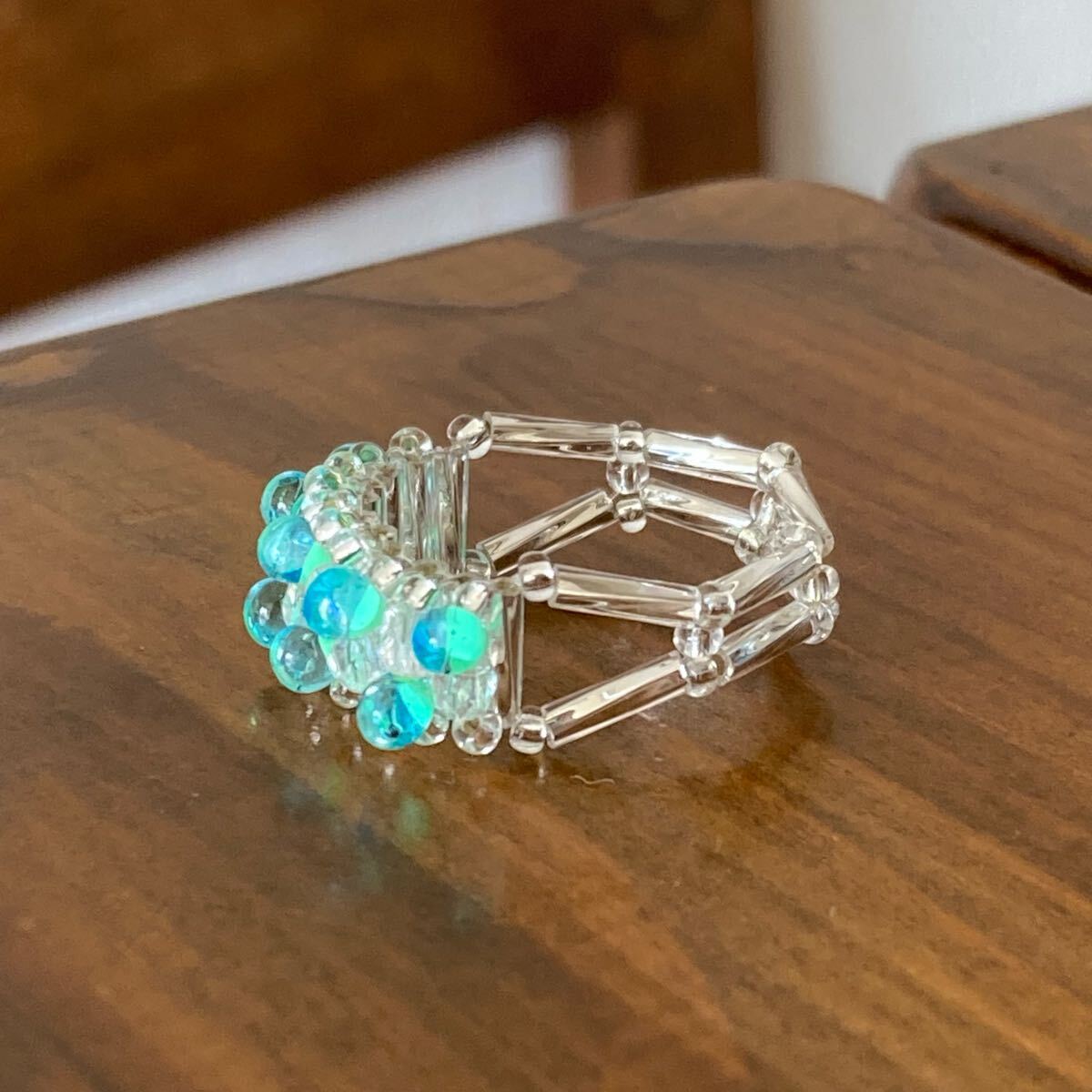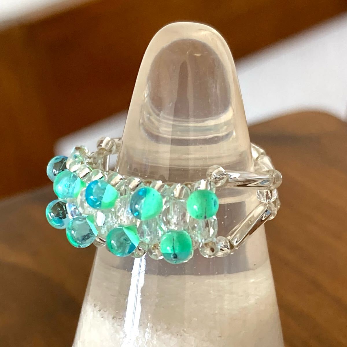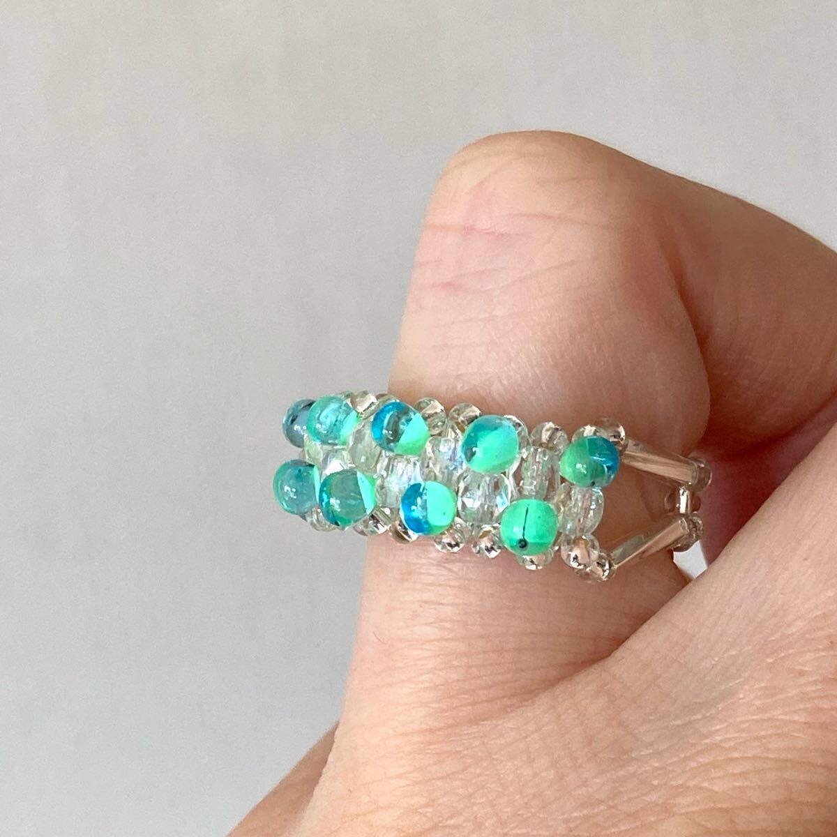ミントグリーン系のマガ玉ビーズ、クリアオーロラのミニチェコビーズ、6mmのシルバーカラーの竹ビーズ、クリアシルバーの丸小ビーズで作ったリングです。