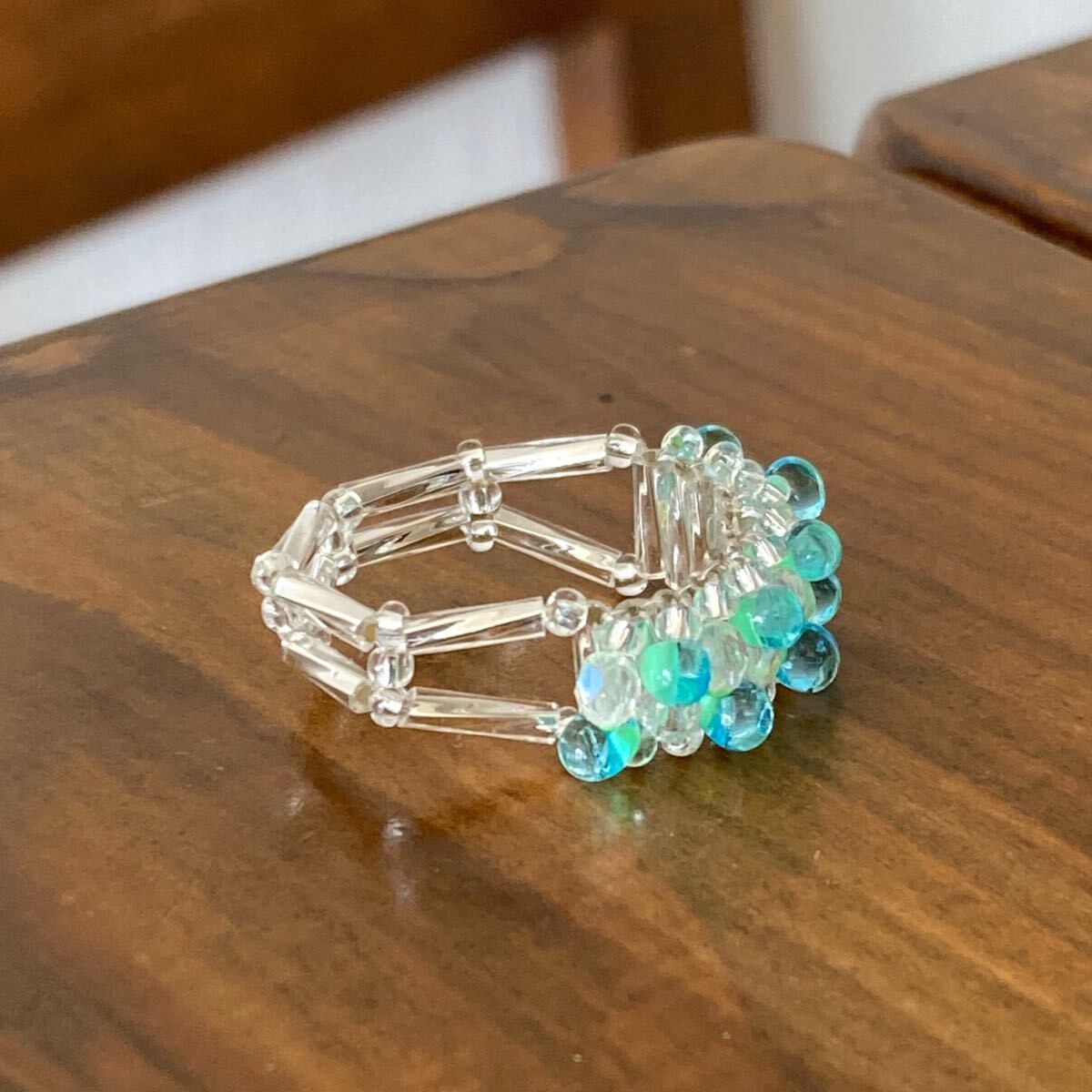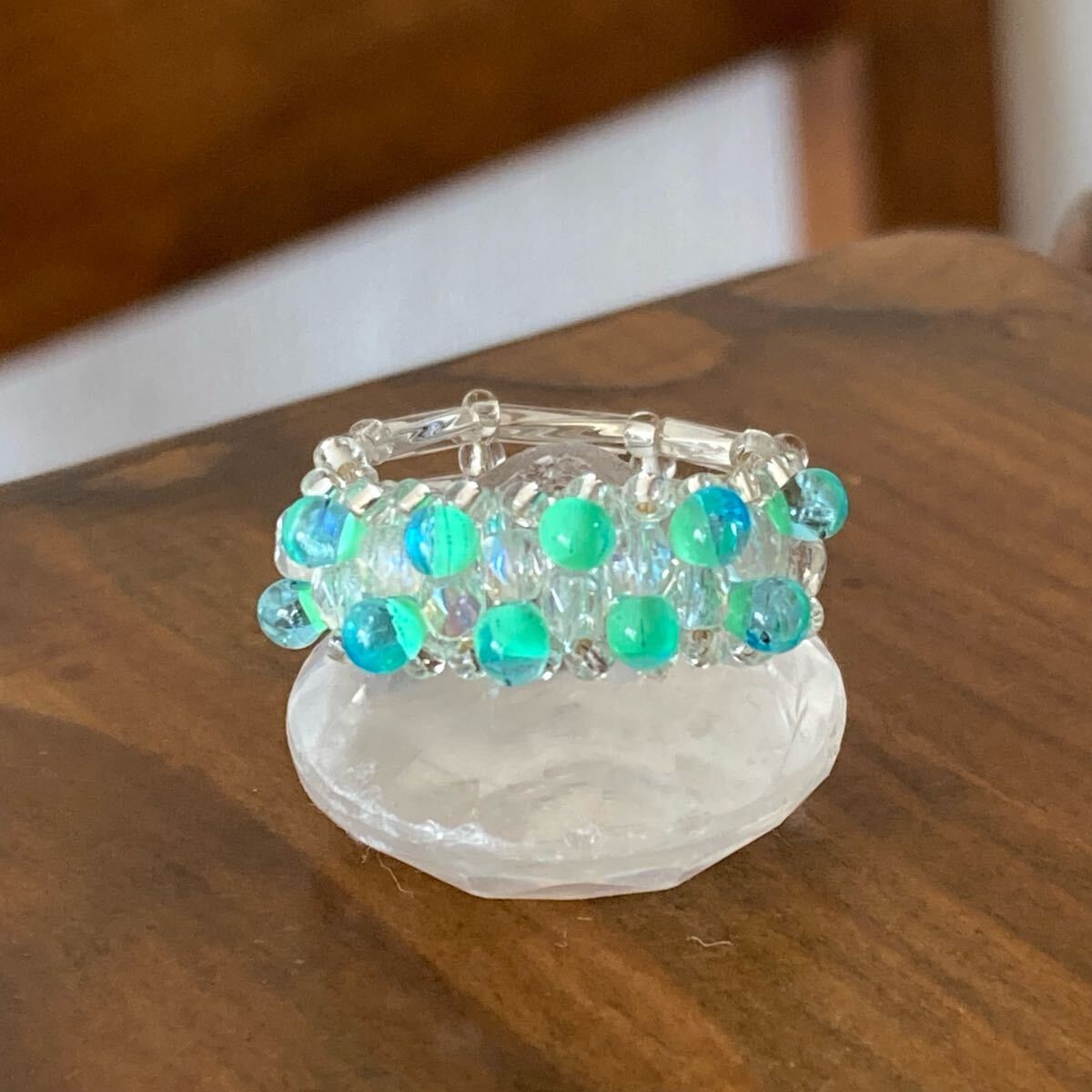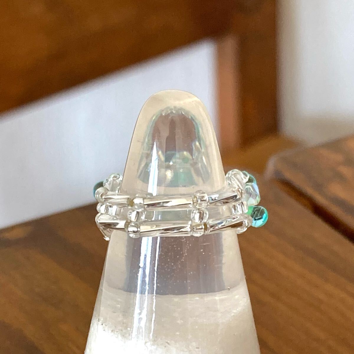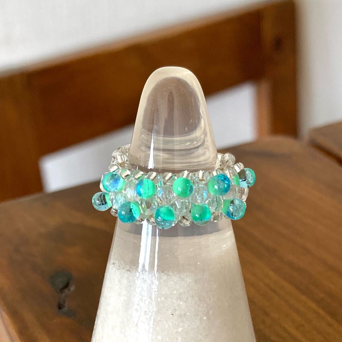 ミントグリーン系のマガ玉ビーズ、クリアオーロラのミニチェコビーズ、6mmのシルバーカラーの竹ビーズ、クリアシルバーの丸小ビーズで作ったリングです。