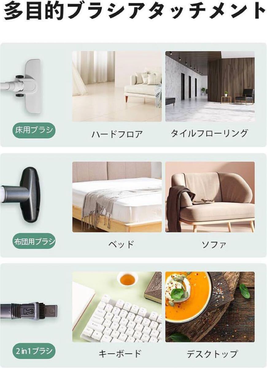 2 in 1ノズル及び布用ノズルが付属しており、様々な使用シーンに対応。HEPA フィルターは排気をきれいに保ち、掃除しながら空気も浄化できます