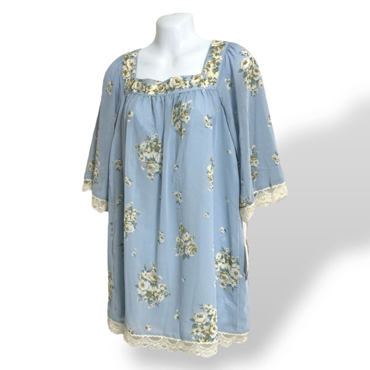 レースデザインと綺麗なライトブルー系カラーの花柄が涼しげなチュニックワンピースです。