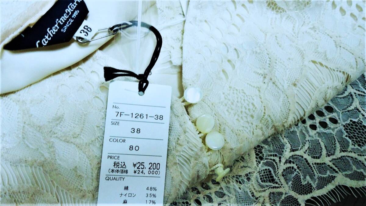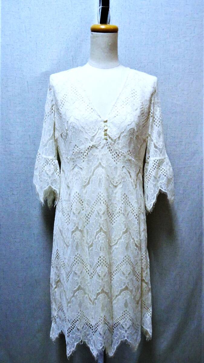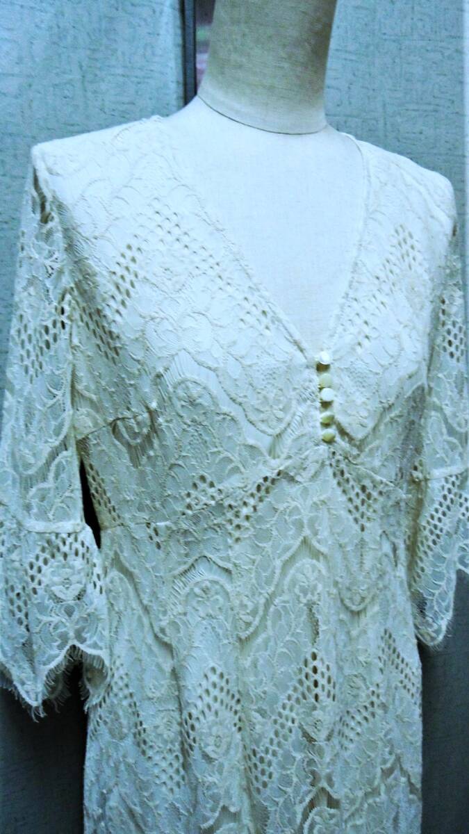 ◇◇『キャサリン・ハーネル』:生成りベージュ色、綿麻混のレース素材を使用したワンピースです。 Vネック、シェル釦留め、カットワークレースを使用した7分のベルスリーブ、裾にもカットワークレースが使われています。 その他、ハイウエスト切り替えのAラインシルエット、着脱用の脇ファスナー付き、涼しげでエレガントな商品です。