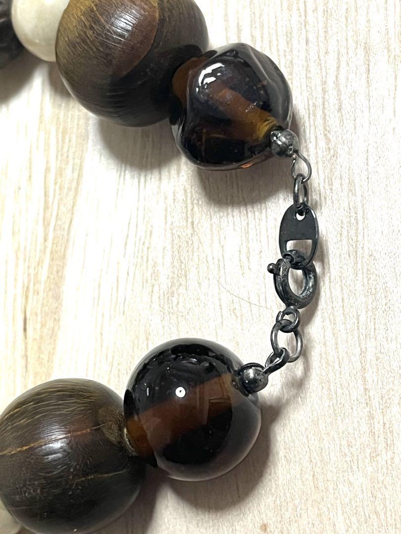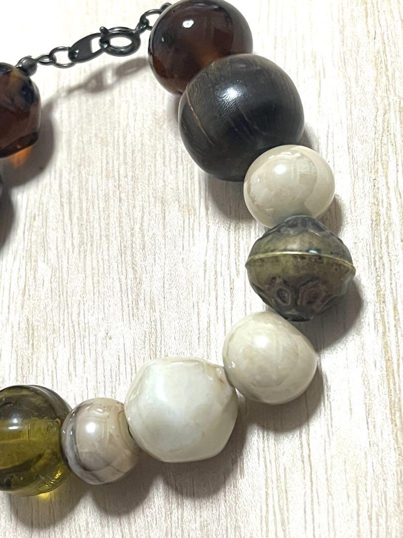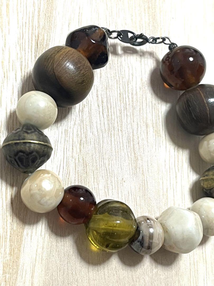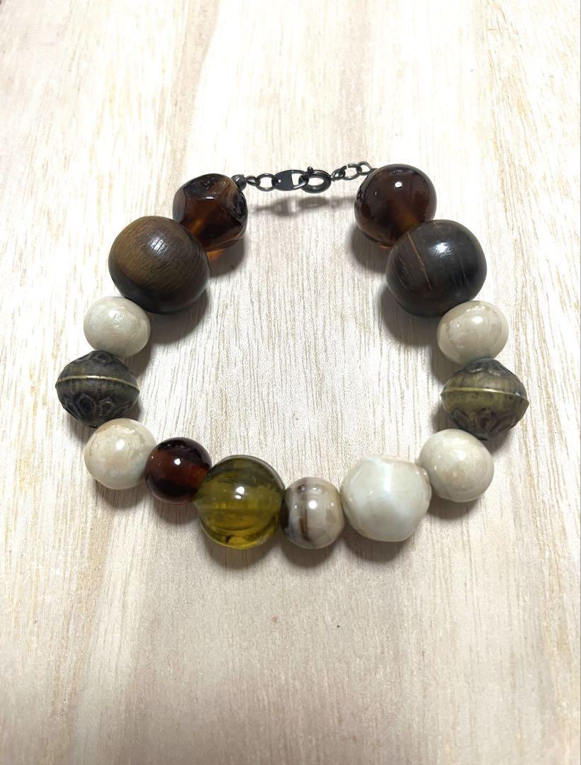 木調ビーズ、ガラス風ビーズ、陶器風ビーズなど、異素材のビーズを組み合わせたエスニックテイストのブレスレットです。