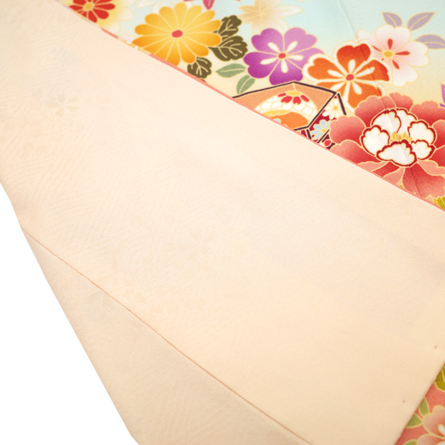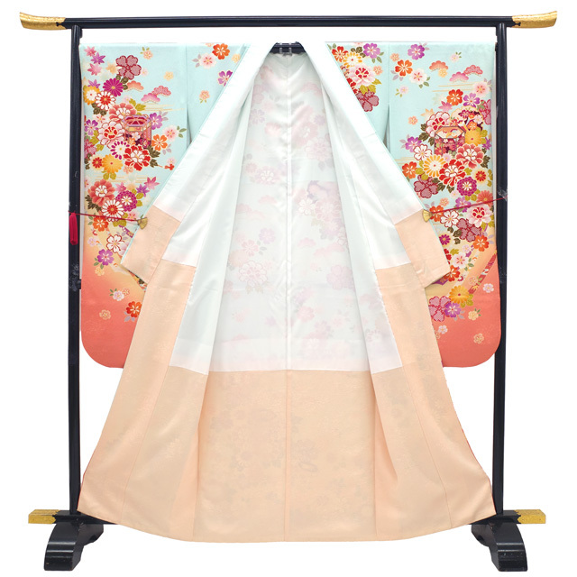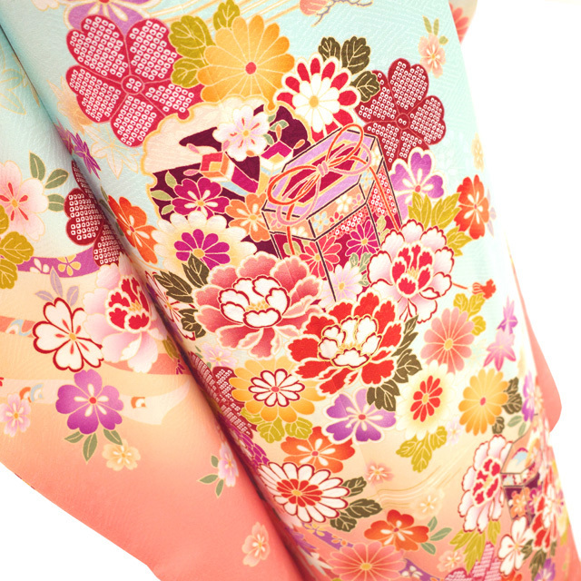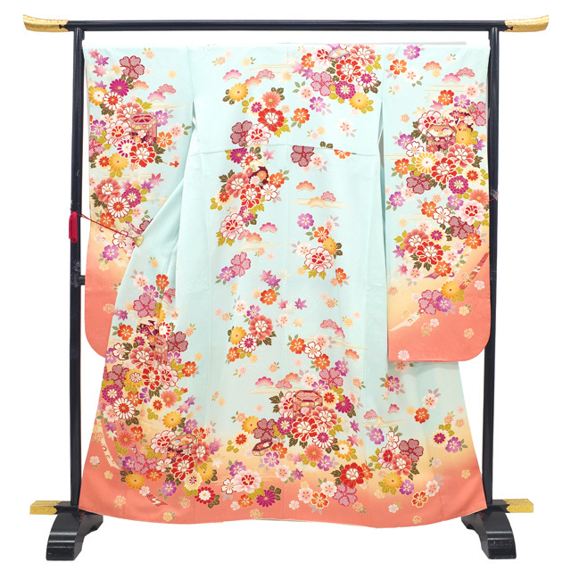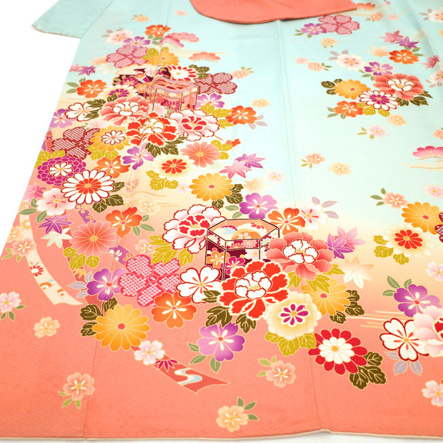 桜などの地紋が施されたこちらのお品は、爽やかな水色に裾がサーモンオレンジでぼかされた地。