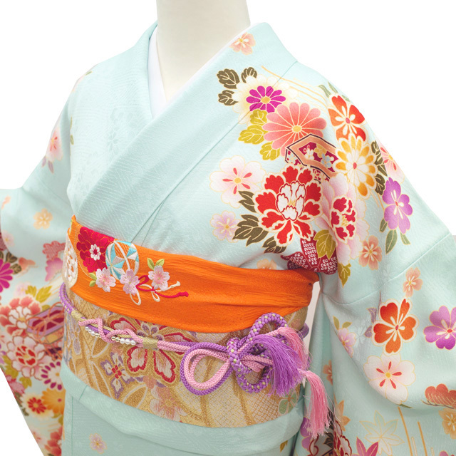 【中古】 振袖 着物 リサイクル 正絹 成人式 フォーマル 金駒刺繍 水色 サーモンオレンジ 牡丹 菊 桜 貝桶 雪輪 四季の花 古典柄 二十歳 20歳 振袖 春 秋 冬 仕立て上がり 身丈163 裄丈68 Lサイズ みやがわ sb15419