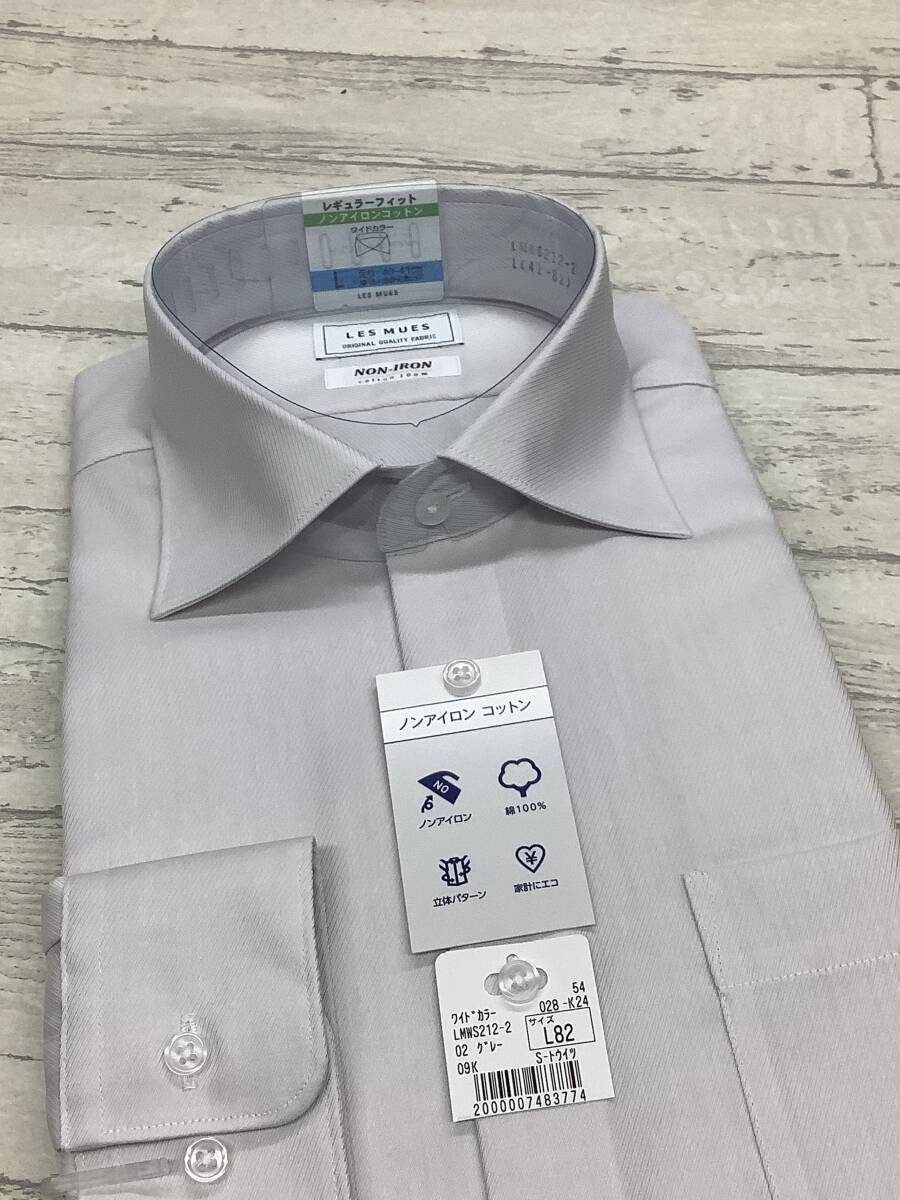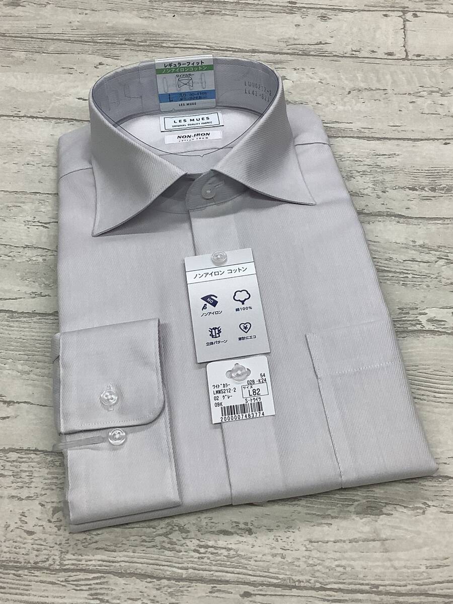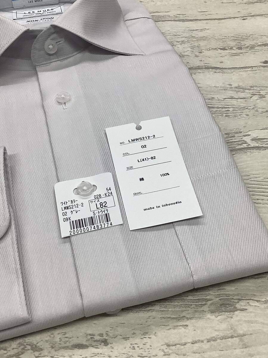 新品未使用 41-82 長袖Lサイズ ★綿100%★ワイドカラー★ドレスシャツ グレーシルバー系 ノンアイロンコットン