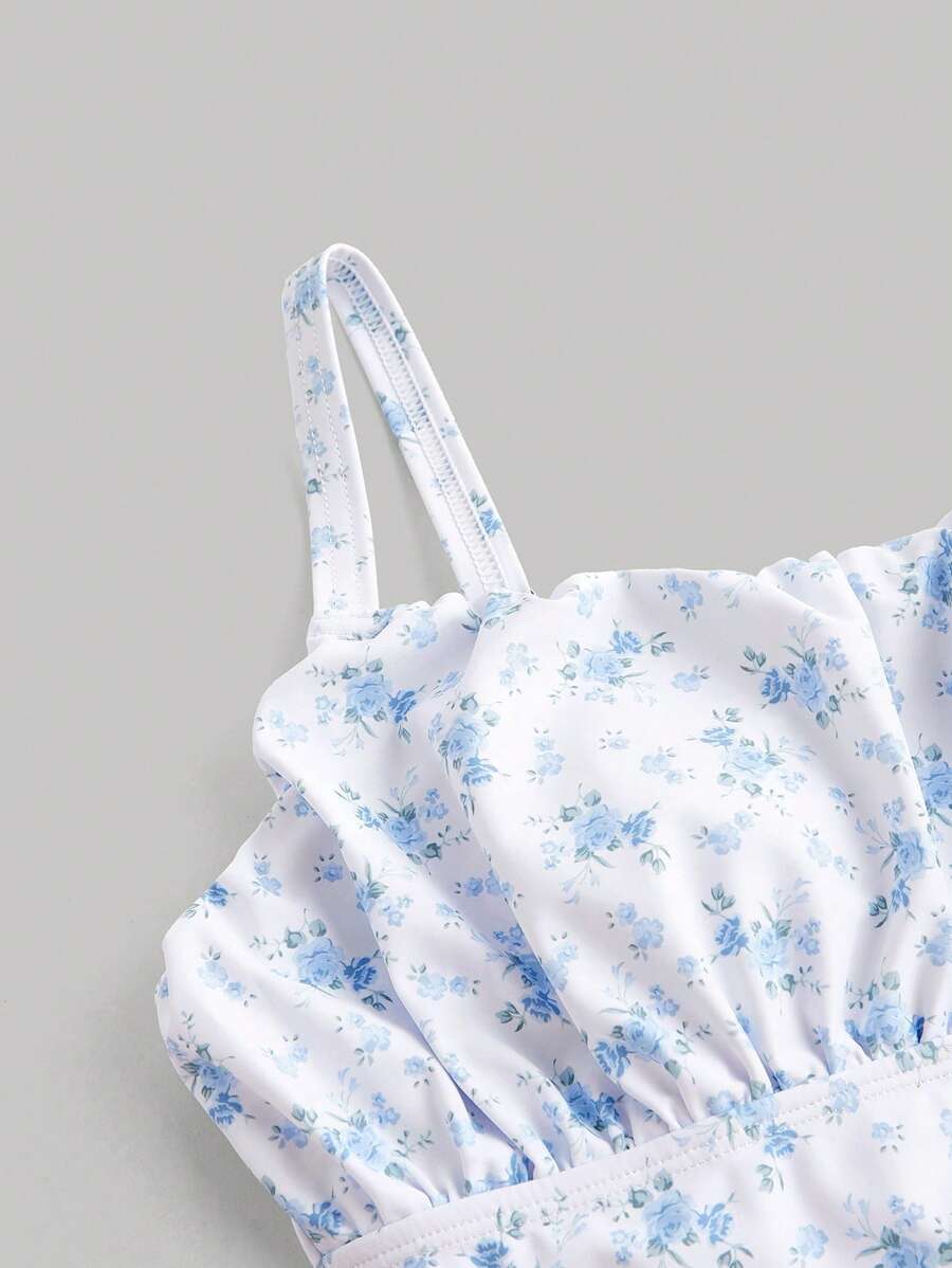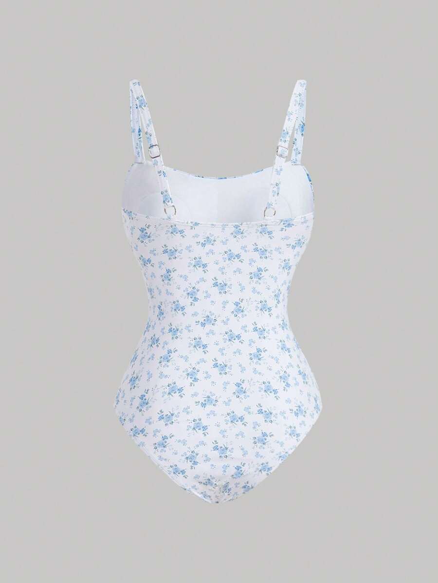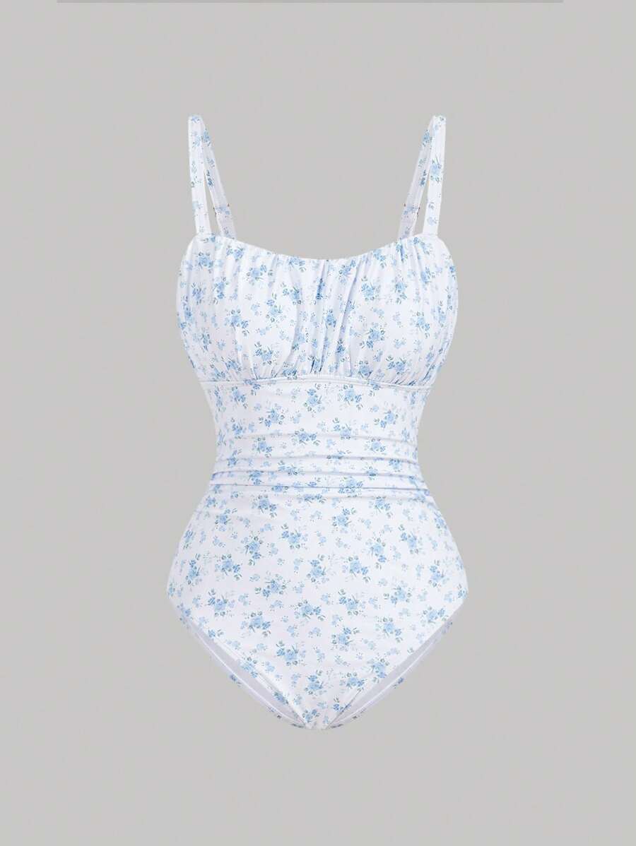 レディース 水着 ワンピース 1点 レディース ブルー小花柄 ギャザーバスト 絞りウエスト ワンピース水着