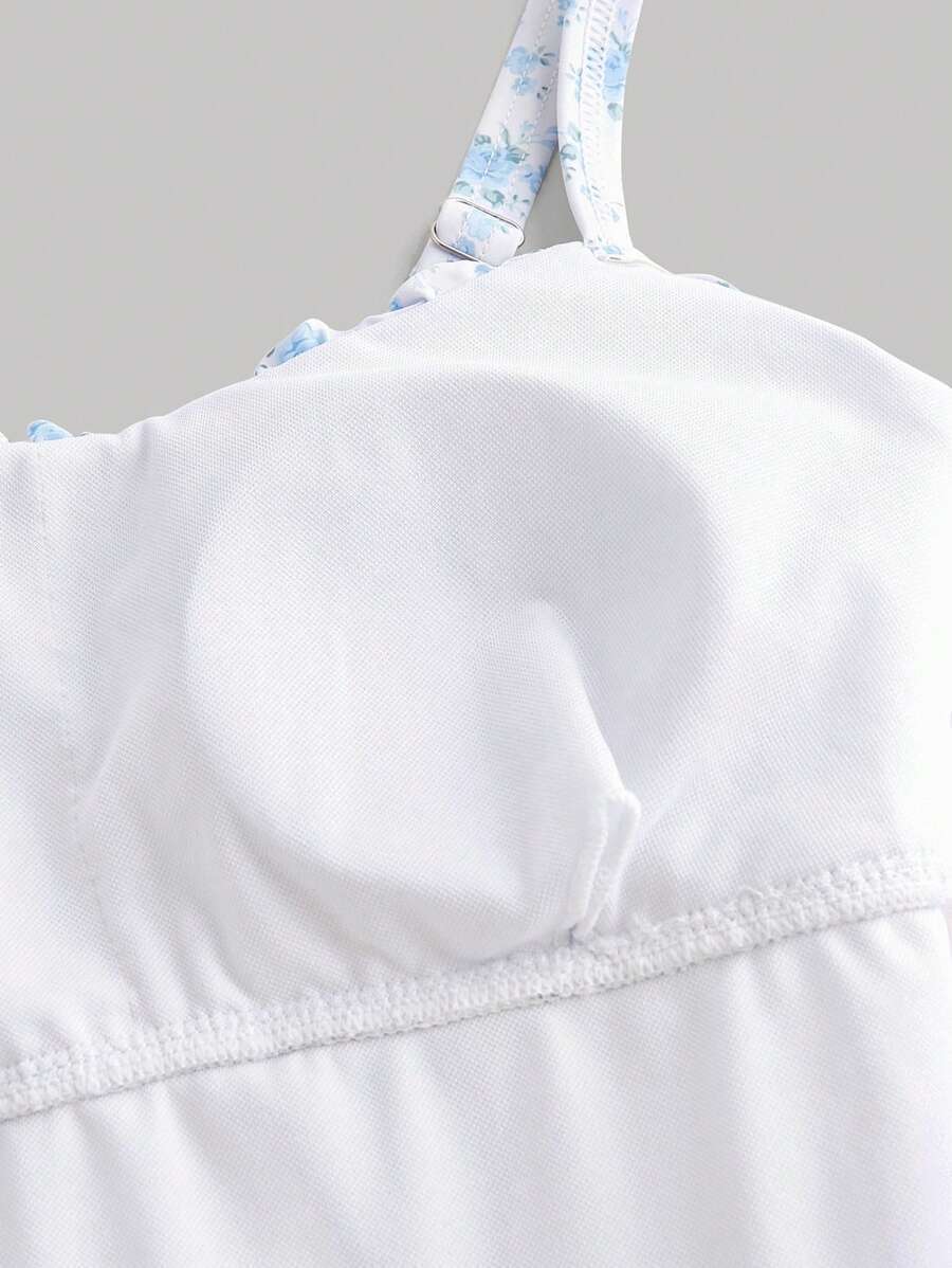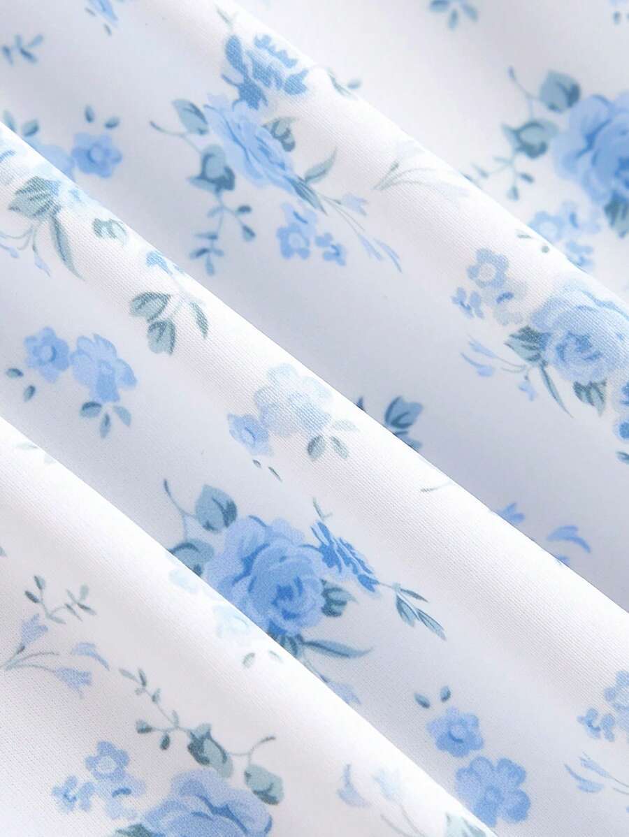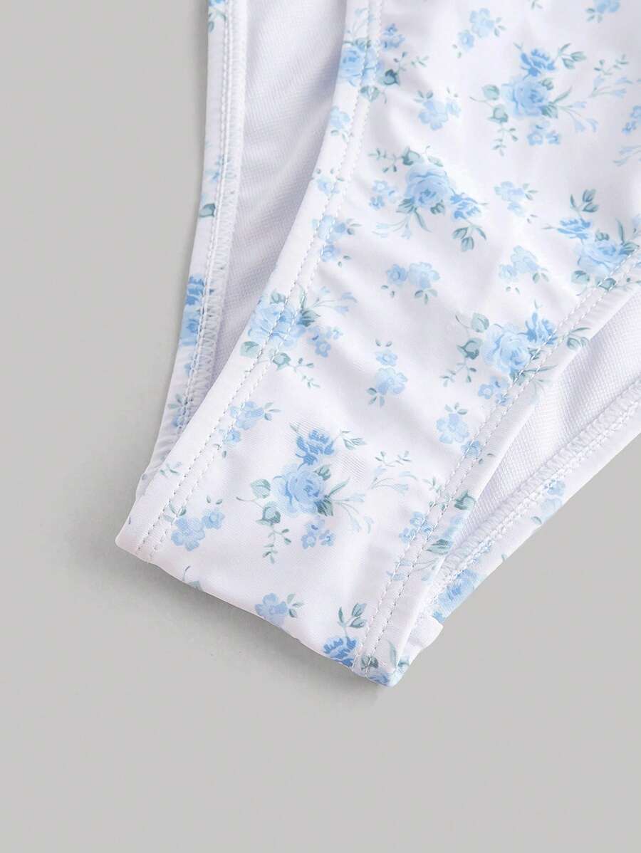 レディース 水着 ワンピース 1点 レディース ブルー小花柄 ギャザーバスト 絞りウエスト ワンピース水着