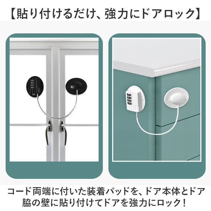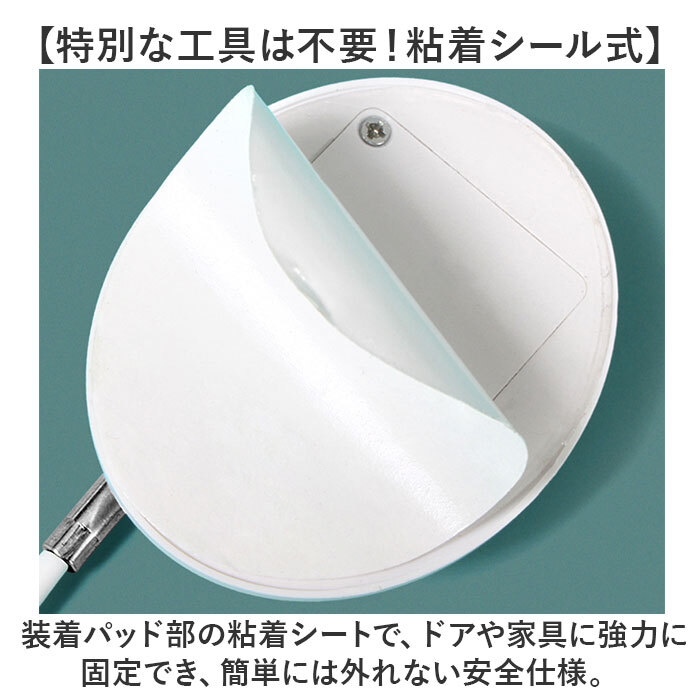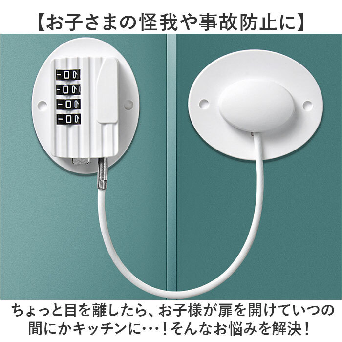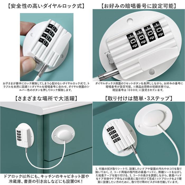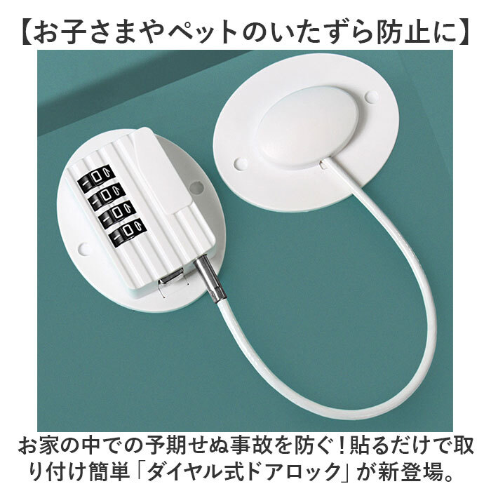 | 商品説明 | ・・【お子さまやペットのいたずら防止に】 ・お家の中での予期せぬ事故を防ぐ!貼るだけで取り付け簡単「ダイヤル式ドアロック」が新登場。 ・【お子さまの怪我や事故防止に】 ・ちょっと目を離したら、お子様が扉を開けていつの間にかキッチンに・・・!そんなお悩みを解決! ・【貼り付けるだけ、強力にドアロック】 ・コード両端に付いた装着パッドを、ドア本体とドア脇の壁に貼り付けてドアを強力にロック! ・【簡単に切断できない丈夫なコード】 ・ワイヤーハサミでも切断の不可能な、耐久性の高い直径3mmのステンレスワイヤーを採用。 ・【特別な工具は不要!粘着シール式】 ・装着パッド部の粘着シートで、ドアや家具に強力に固定でき、簡単には外れない安全仕様。 ・【安全性の高いダイヤルロック式】 ・お子さまが勝手にロック解除してしまう心配のないダイヤルロック式で、トラブルを未然に回避! ・※ダイヤルを暗唱番号に合わせ、ダイヤル側面のシルバー色のボタンを押してロック解除します。 ・【お好みの暗唱番号に設定可能】 ・ダイヤルボックス側面のリセットボタンを長押ししながら、お好みの番号に暗唱番号が設定可能。 ・※商品出荷時の初期状態では、暗証番号は「0000」に設定されています。 ・【さまざまな場所で大活躍】 ・ドアロック以外にも、キッチンのキャビネット扉や冷蔵庫、書斎の引き出しなどにも設置OK! ・【ペットのいたずら対策にも】 ・お子さまの自宅内での事故防止にはもちろん、ペットのいたずら防止や脱走防止対策にも効果的。 ・【取り付けは簡単・3ステップ】 ・1.付属の拭き取りシートで、設置したいドアや壁面の汚れやホコリを取り除いておく。 ・2.コード両端の楕円形の装着パッドに、剥離シートをはがした粘着テープを貼り付ける。 ・3.コードの長さを調節しながら、装着パッドをドア本体やドア枠などの建具に貼り付けて完成! ・※ドアロックをより確実に設置したい方のために、取り付け用のビスが4本付属しています。 |
