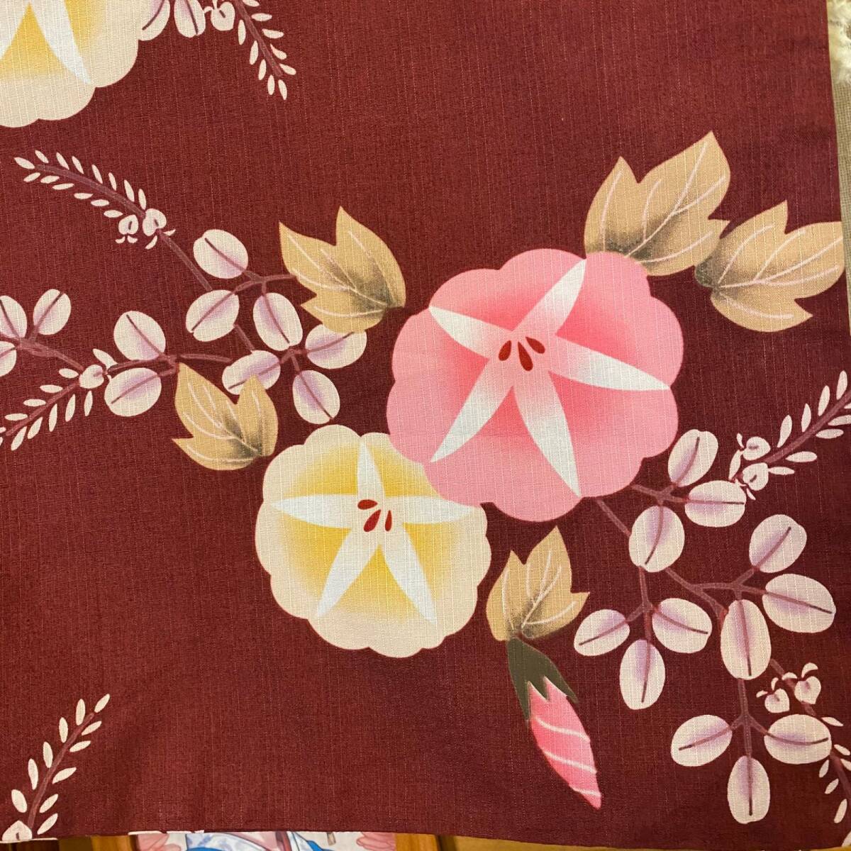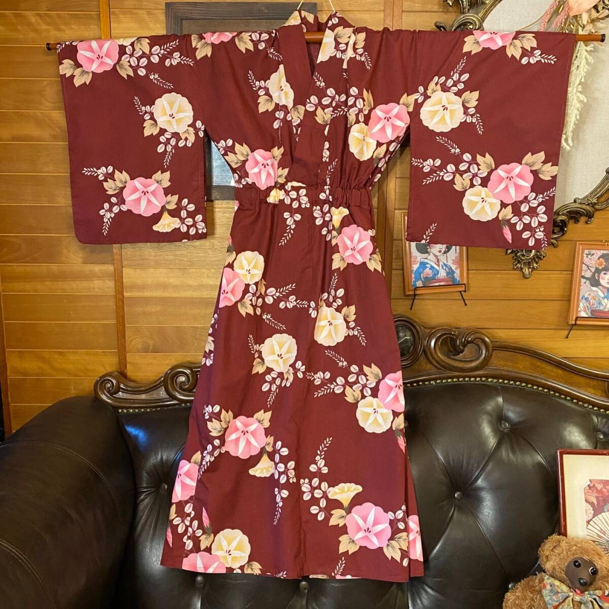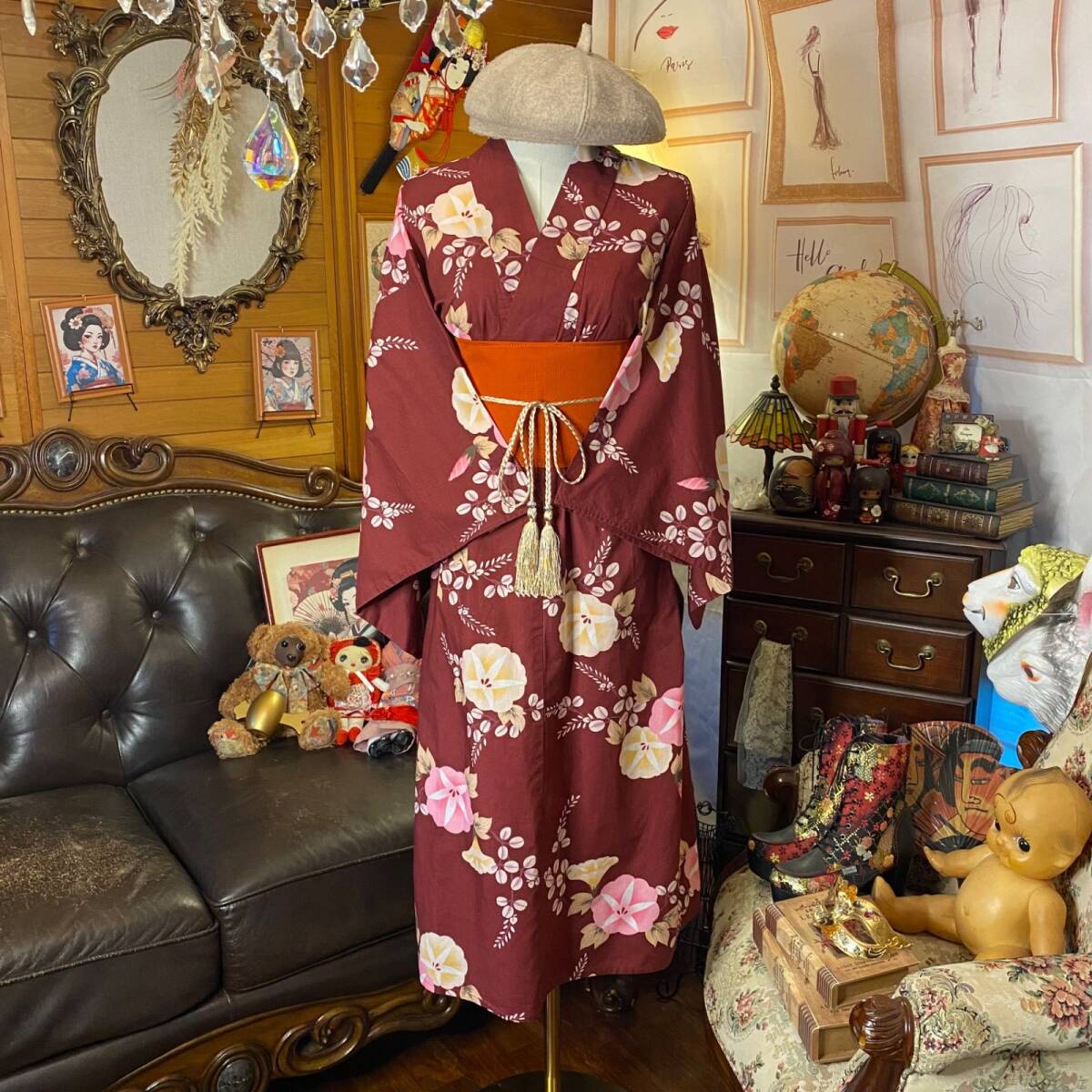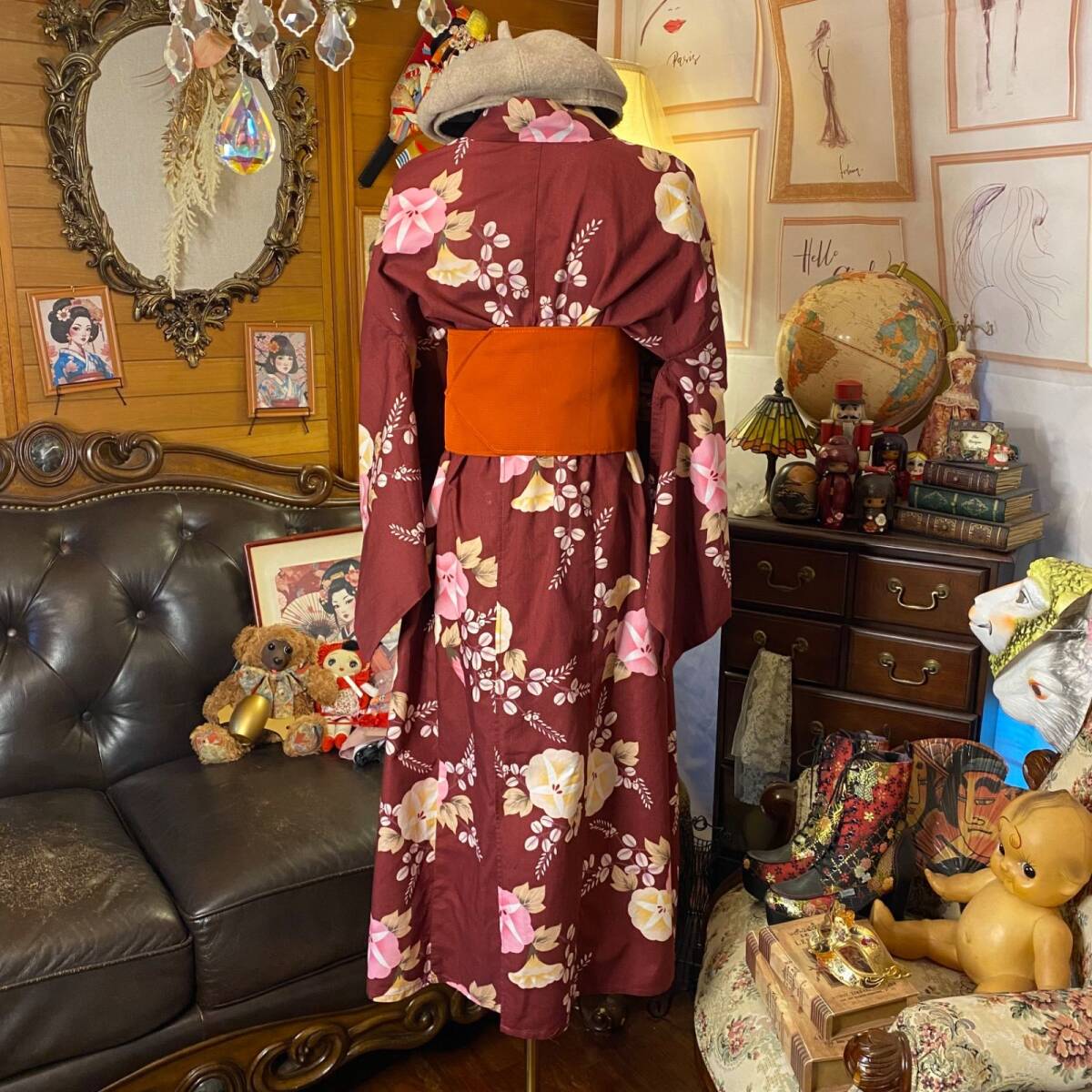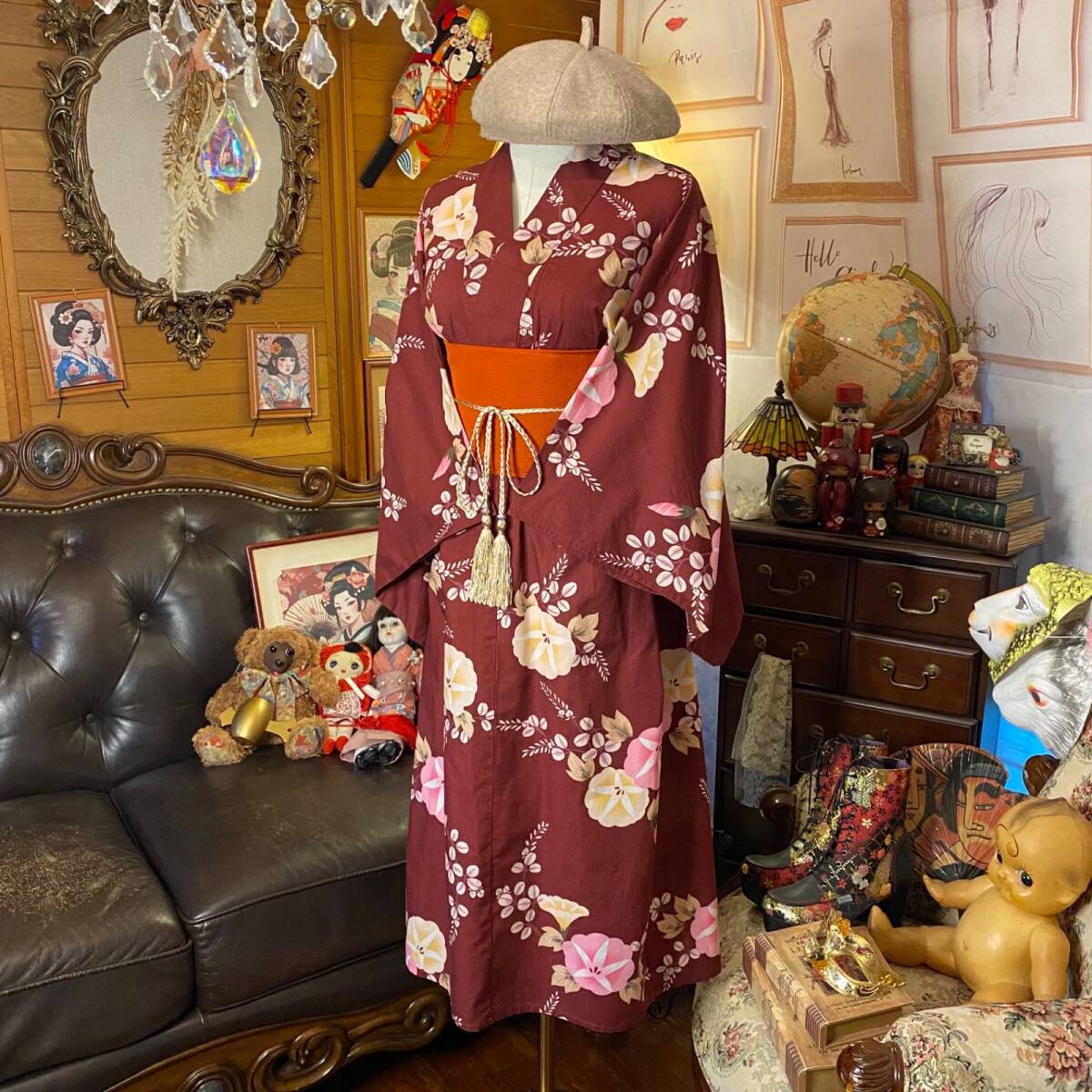 【 浴衣リメイク セミロング ワンピース ドレス 帯サッシュベルト 和洋折衷 レトロ 古着 ハンドメイド 深みのあるボルドーレッドに淡いピンクとクリームの朝顔たち W-608】