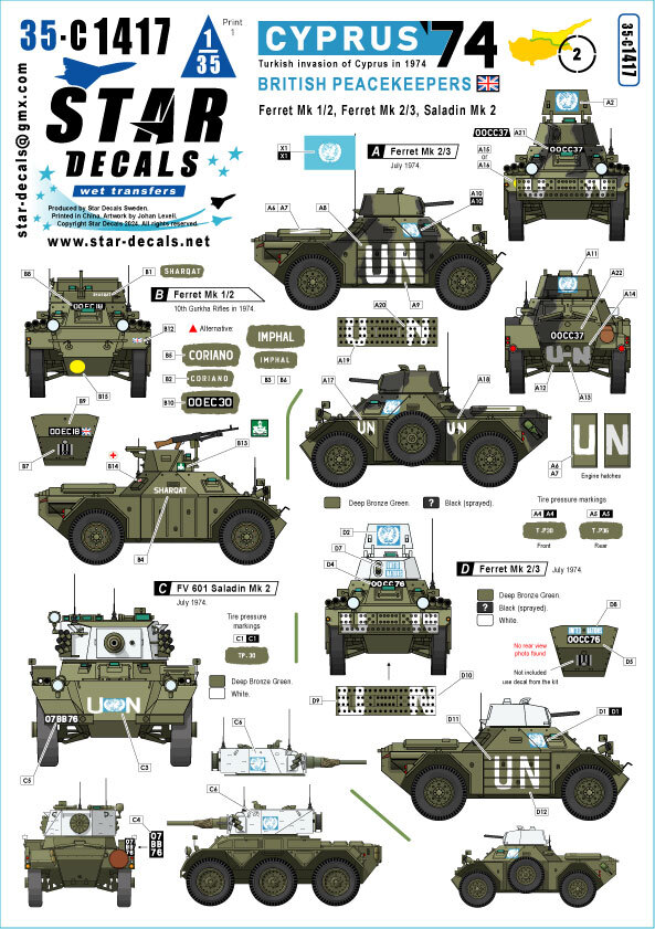 Star_Decals 35-C1417 1/35 Cyprus 1974 # 2. British Peacekeepers. Ferret Mk 1/2, Ferret Mk 2/3, Saladin Mk 2. Turkish invasion in summer 1974.