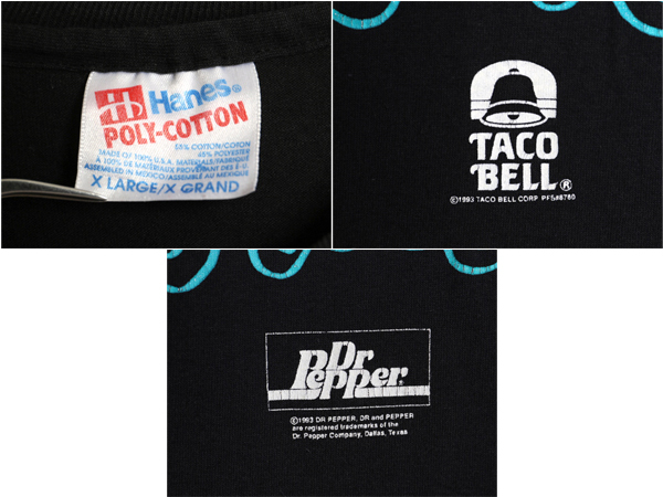 90年代のオールド Taco Bell × ROCKY&BULLWINKLE のコラボプリント Tシャツです。 タコベルは、カリフォルニア州アーバイン市に本社を置く アメリカ合衆国の大手ファストフードチェーンです。 The Adventures of ROCKY&BULLWINKLE and Friends 「 ロッキーとブルウィンクルの大冒険 」は、 1959年から1964年までアメリカで放送されていたテレビアニメ作品です。 ボディは、HANES 素材は、55% COTTON / 45% POLYESTER 柔らかい着心地抜群の素材が使用されています。 袖・裾共にシングルステッチのオールドボディ フロントに、ロッキーとブルウィンクルの大冒険 に登場する ブルウィンクルのビッグイラストプリント ROCKY&BULLWINKLE TM 1991 のコピーライト入り バックに、「GREETINGS TACO LOVERS」のビッググラフィックプリント、 タコベル、ドクターペッパー ( Dr. Pepper )のロゴプリント入り 1993年のコピーライト入り、オフィシャル 合わせやすい、人気カラーのブラック ゆったりとした人気のボクシーシルエット 数あるタコベルTシャツの中でも希少なコラボ物 コレクションとしてもオススメの これだけで様になる商品です。 |