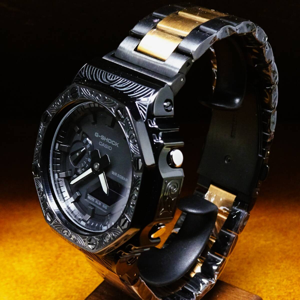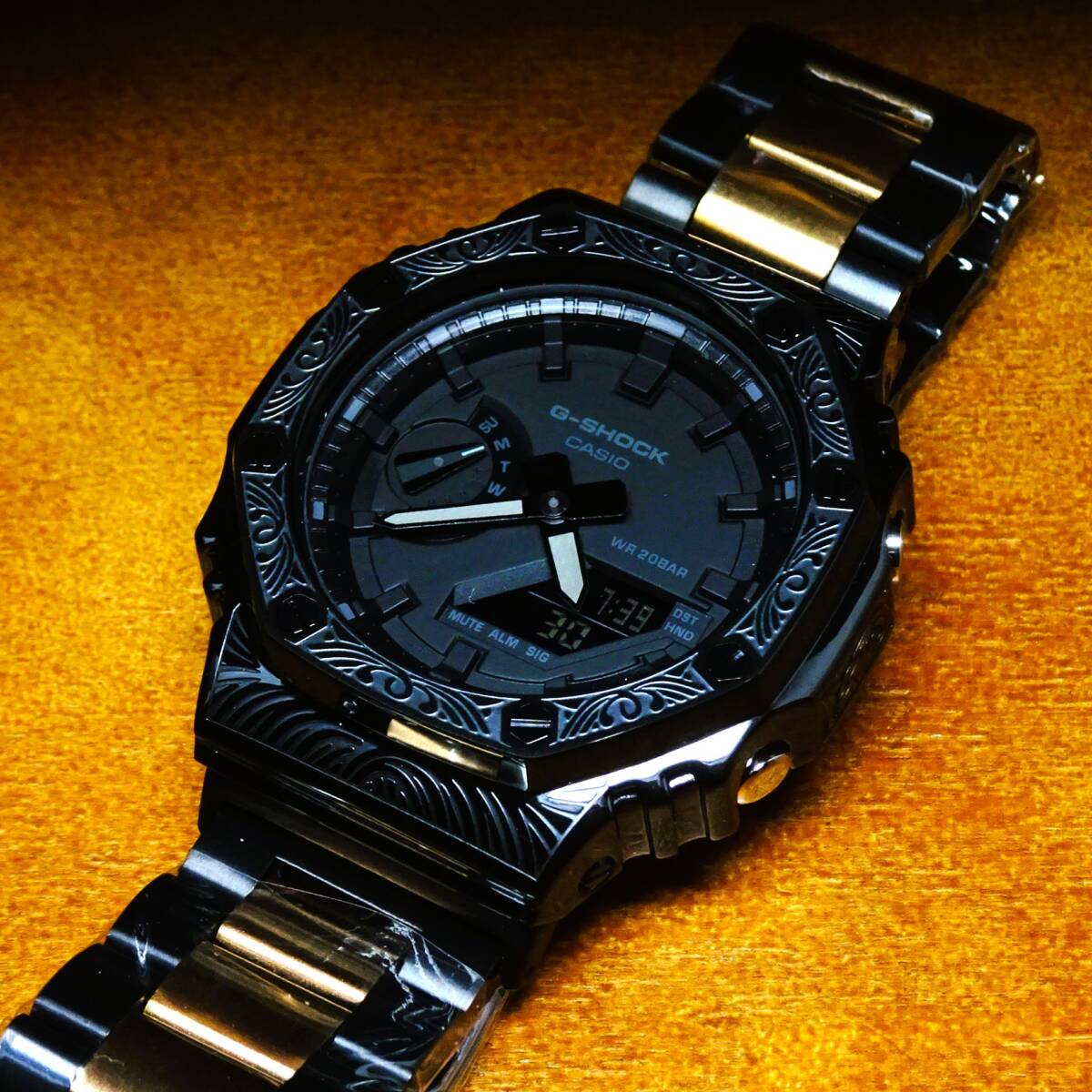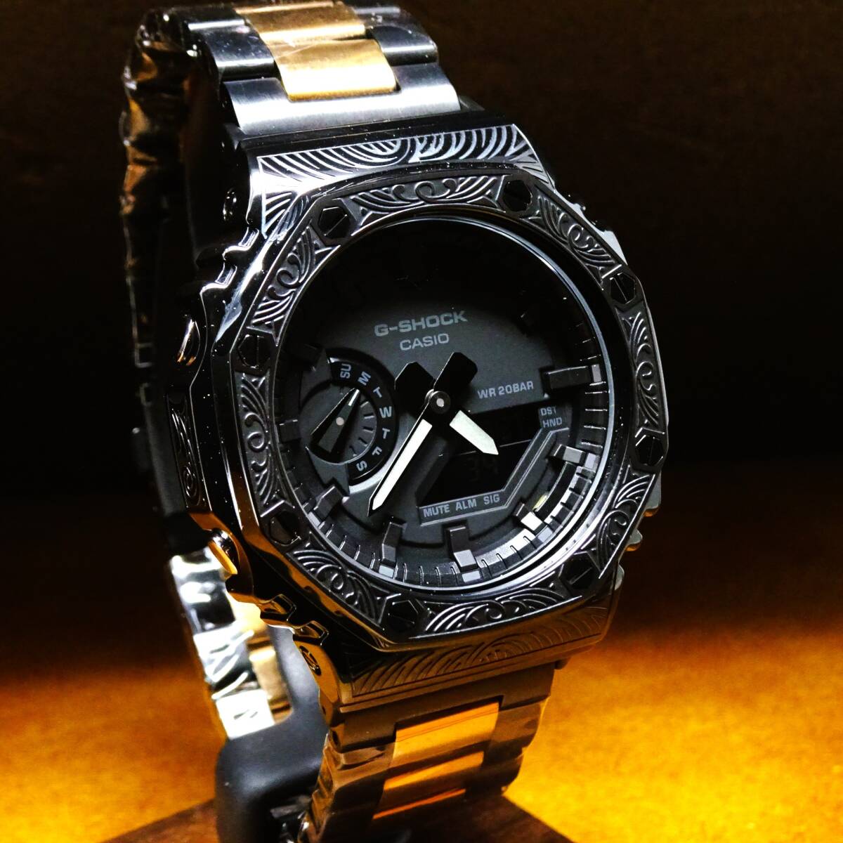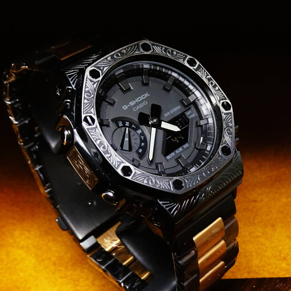 〓新品〓GショックCUSTOM・MADE腕時計本体付GA2100ステンレス製ベネチアン柄エンボス加工ベゼル〓シャンパンツートンメタルベルト〓