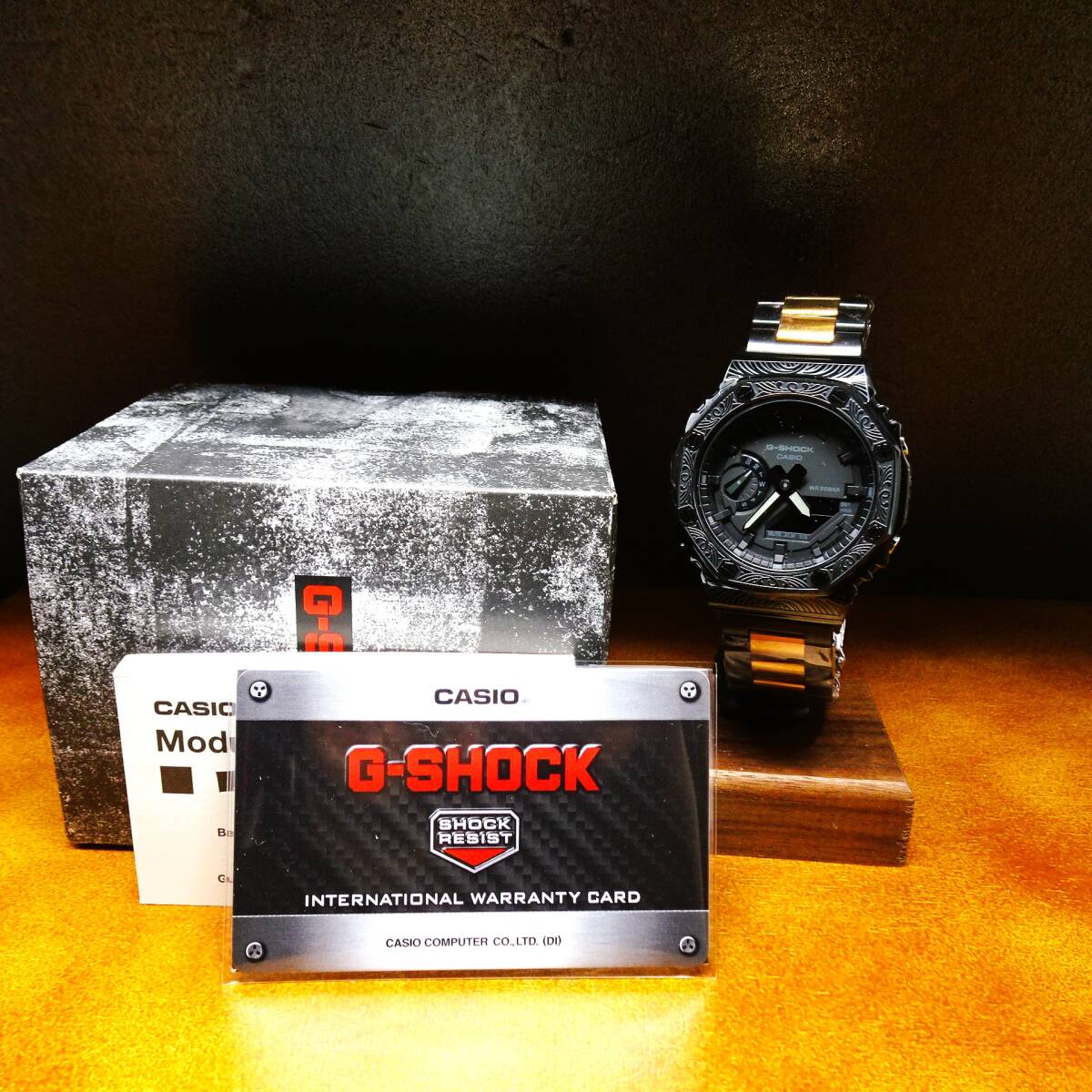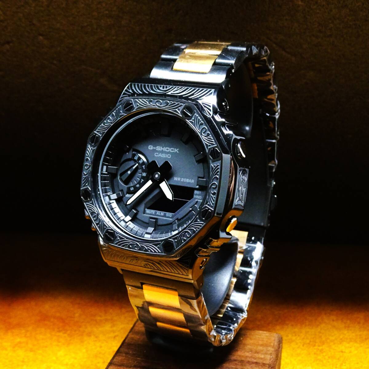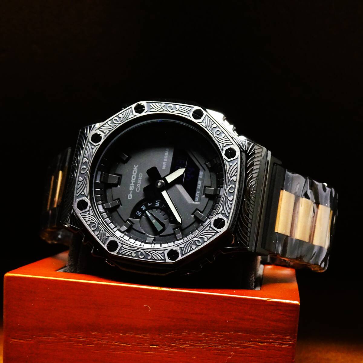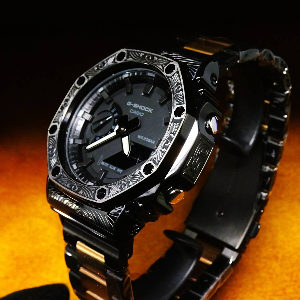 〓新品〓GショックCUSTOM・MADE腕時計本体付GA2100ステンレス製ベネチアン柄エンボス加工ベゼル〓シャンパンツートンメタルベルト〓