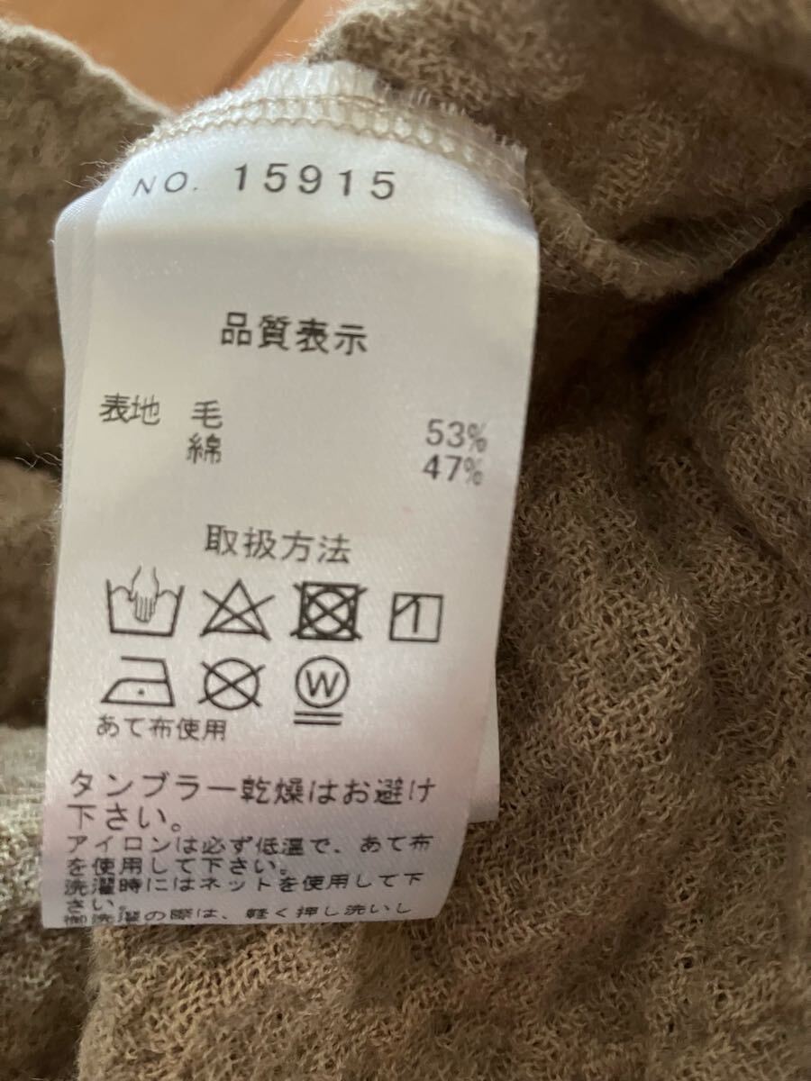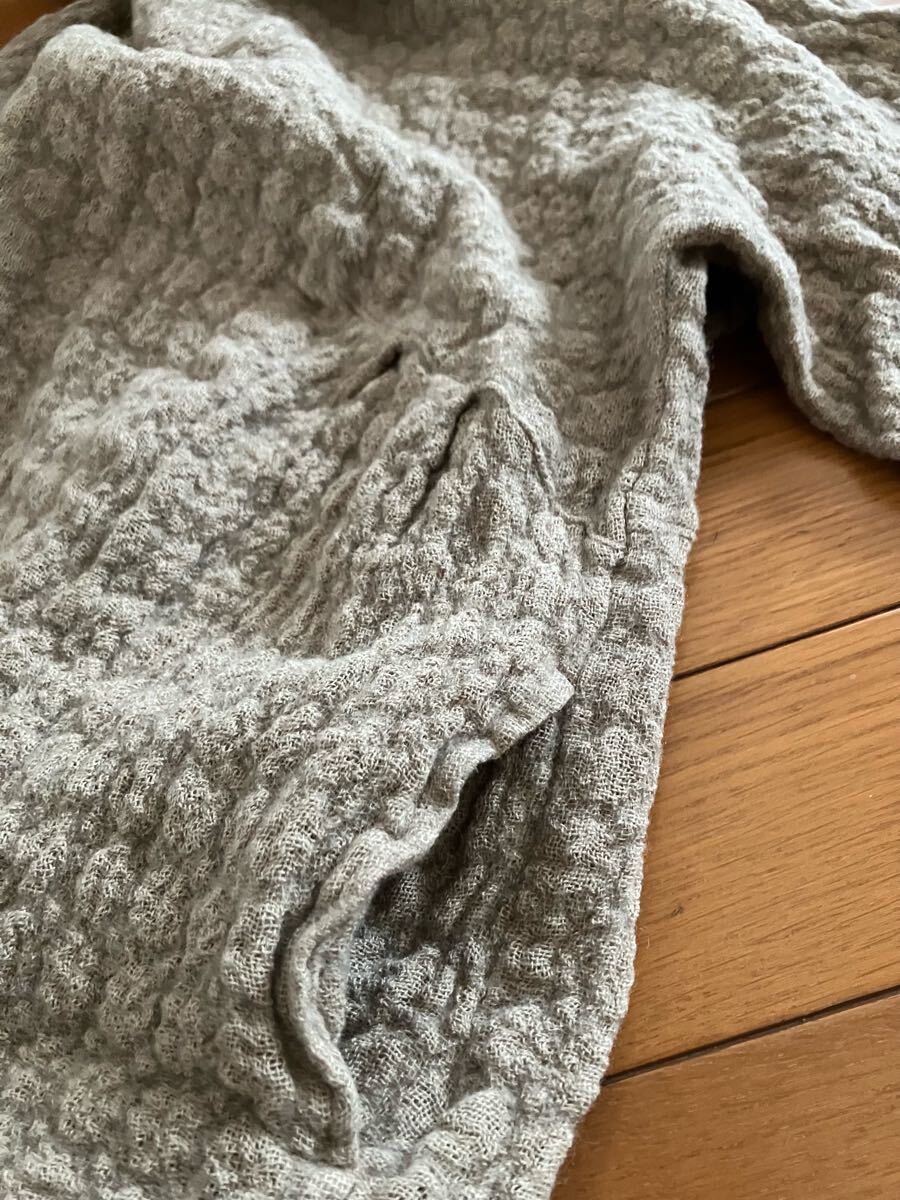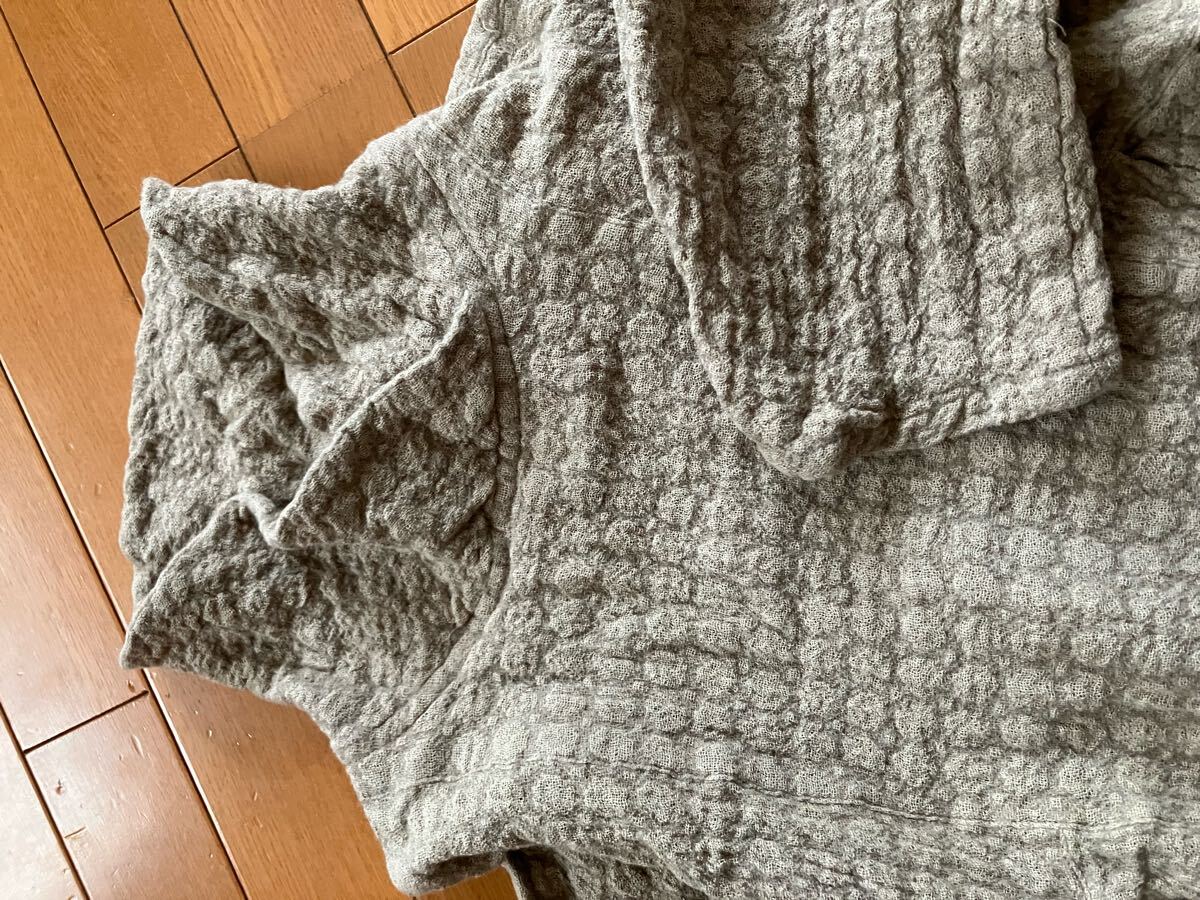 写真がグレーっぽくみえますが、薄茶色のようなベージュになります。ワッフルみたいな生地感です。両サイドにポケットがあります。サイズは記載がありませんが、M位です。着丈58、身幅46、袖丈脇下より25㎝位になります。