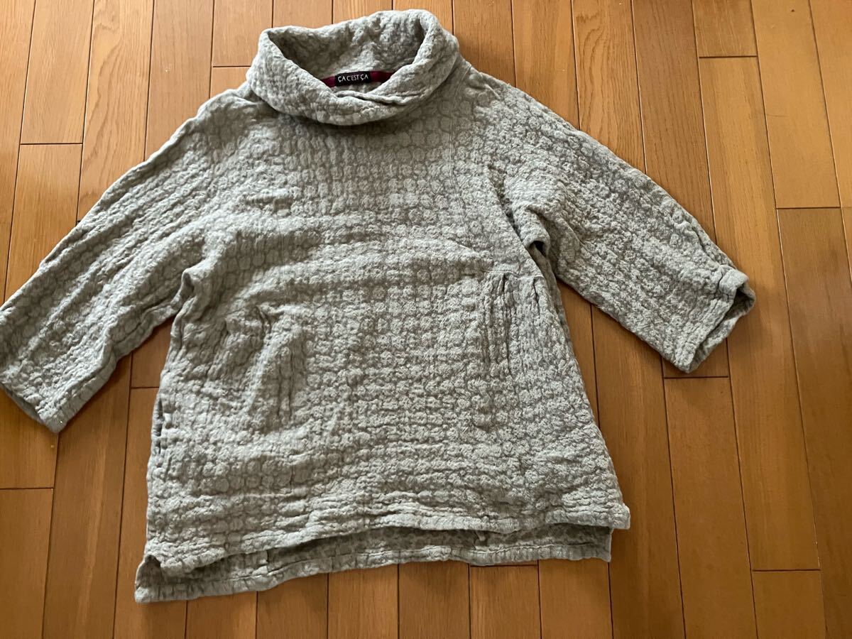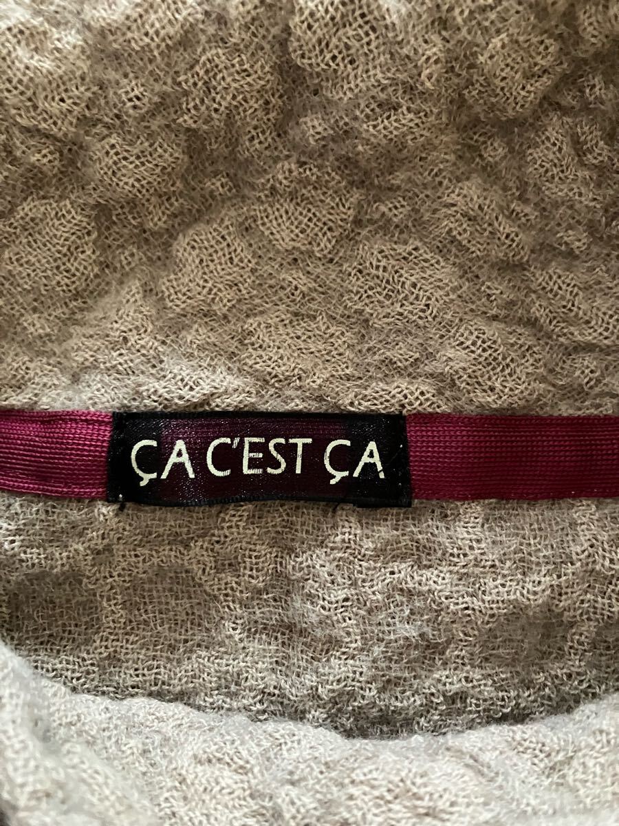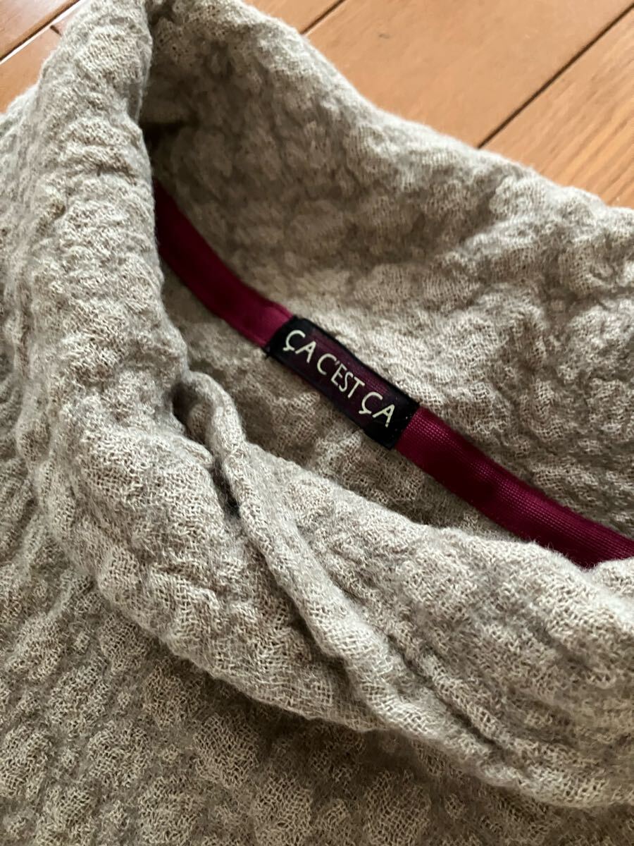 写真がグレーっぽくみえますが、薄茶色のようなベージュになります。ワッフルみたいな生地感です。両サイドにポケットがあります。サイズは記載がありませんが、M位です。着丈58、身幅46、袖丈脇下より25㎝位になります。