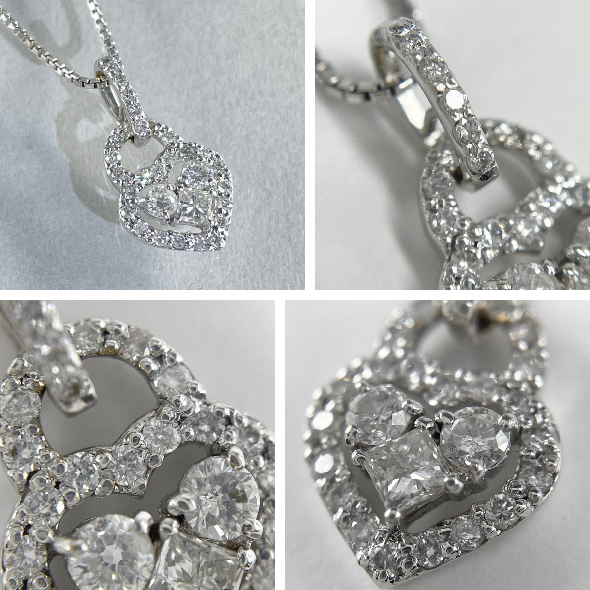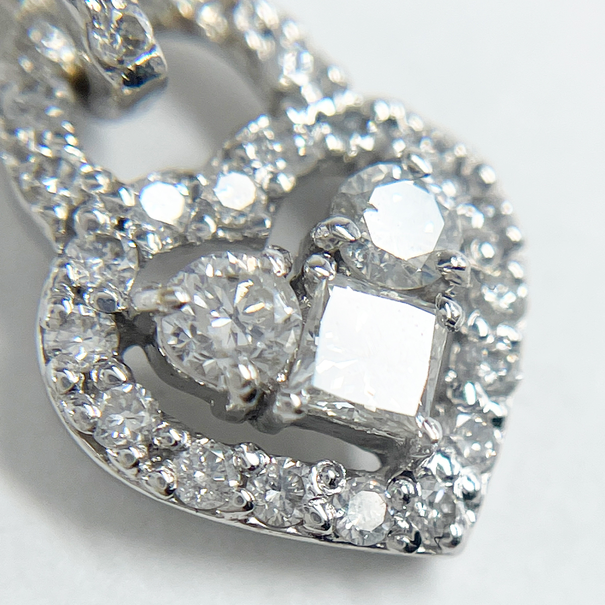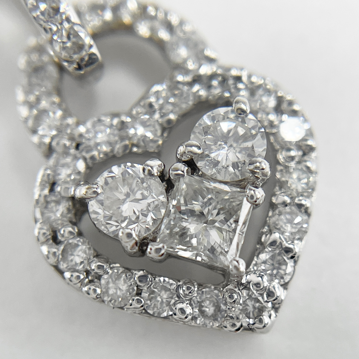 煌めくプリンセスカットダイヤを中心に配したハートモチーフのペンダント。