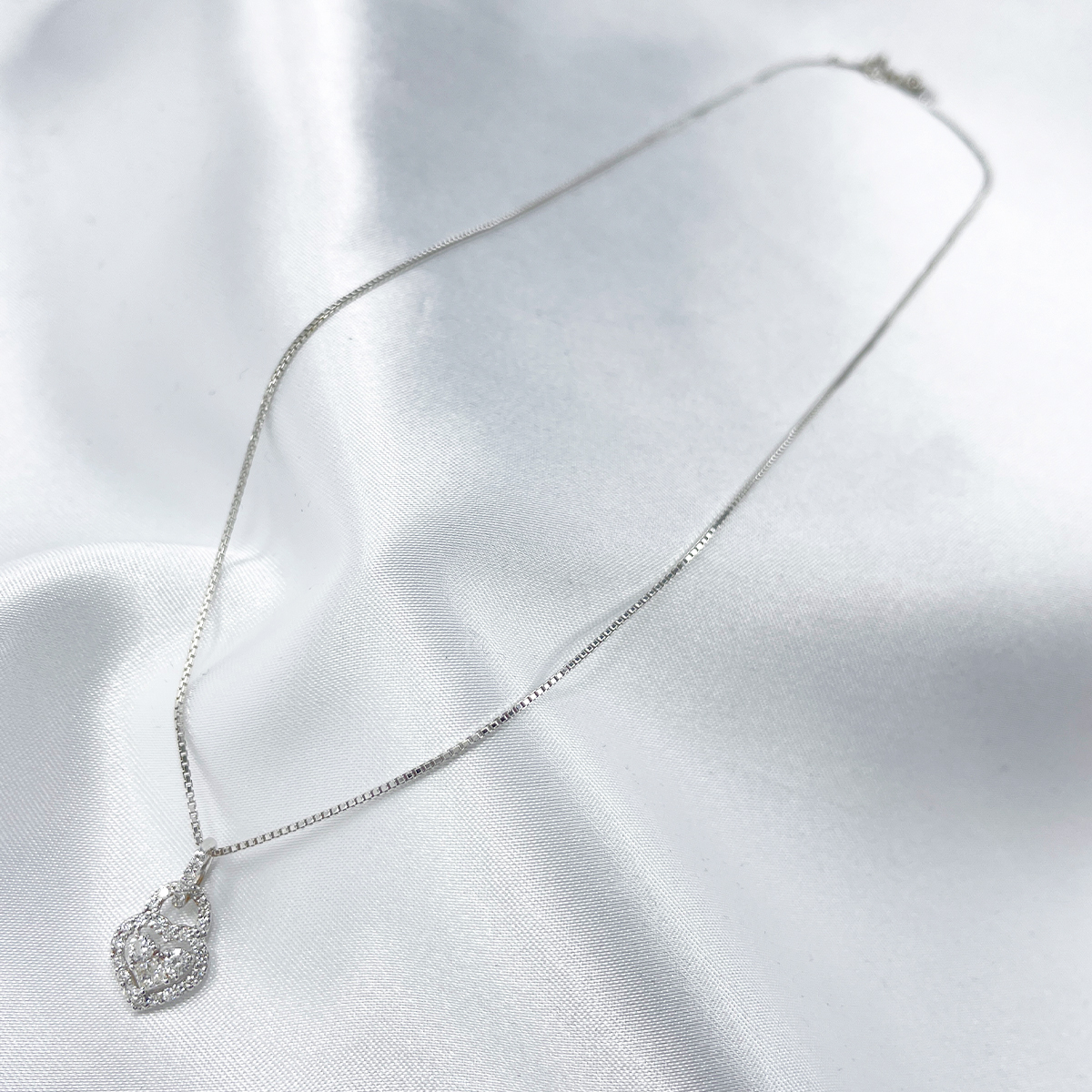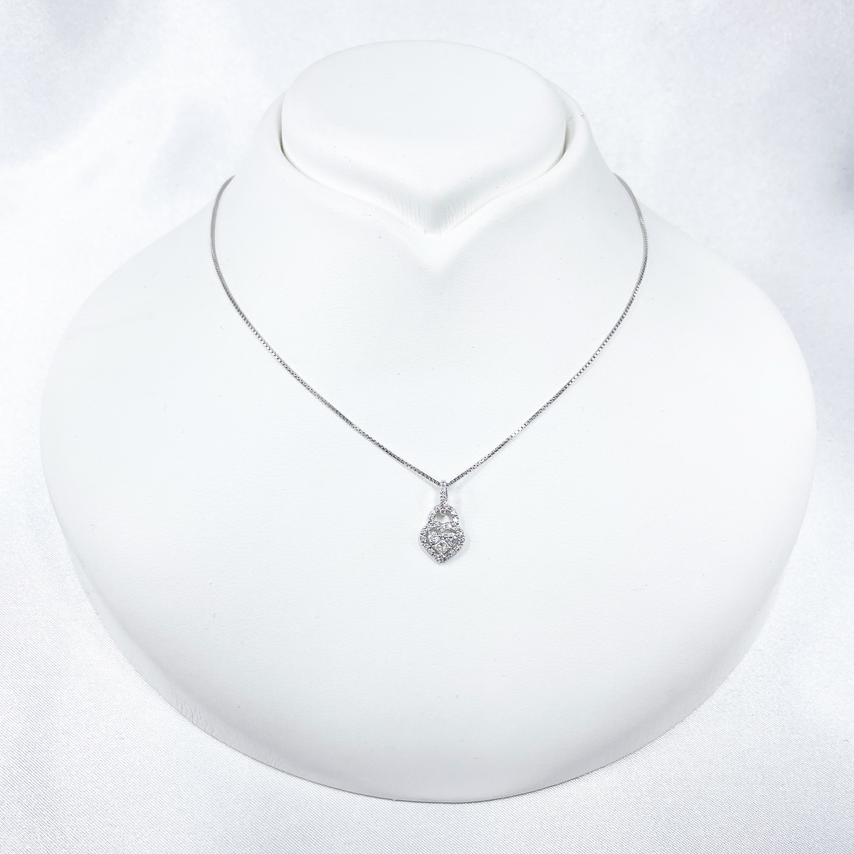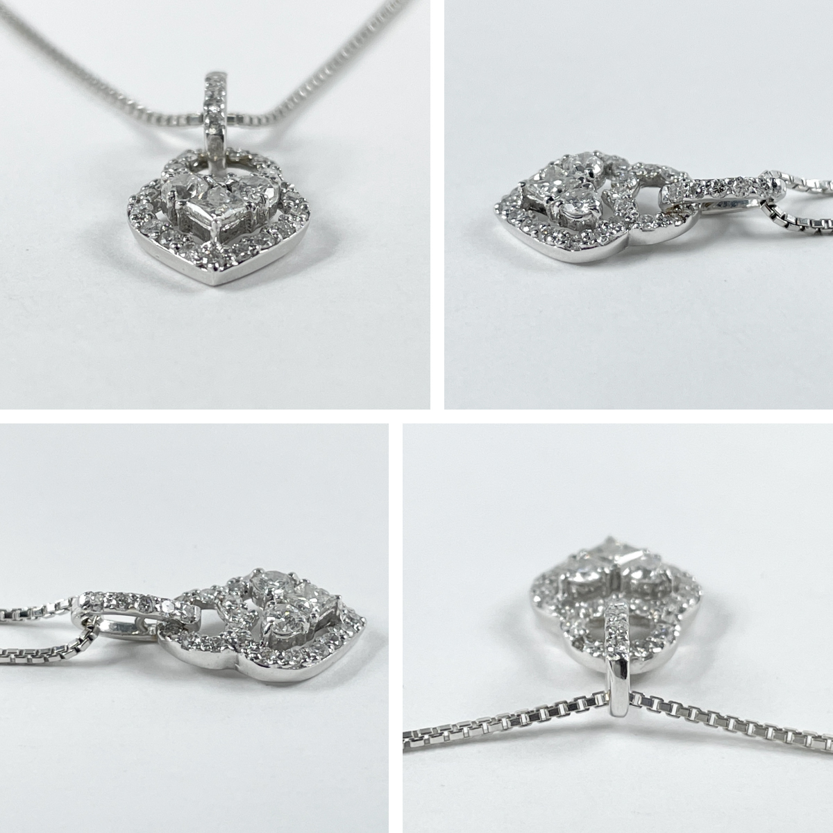 煌めくプリンセスカットダイヤを中心に配したハートモチーフのペンダント。
